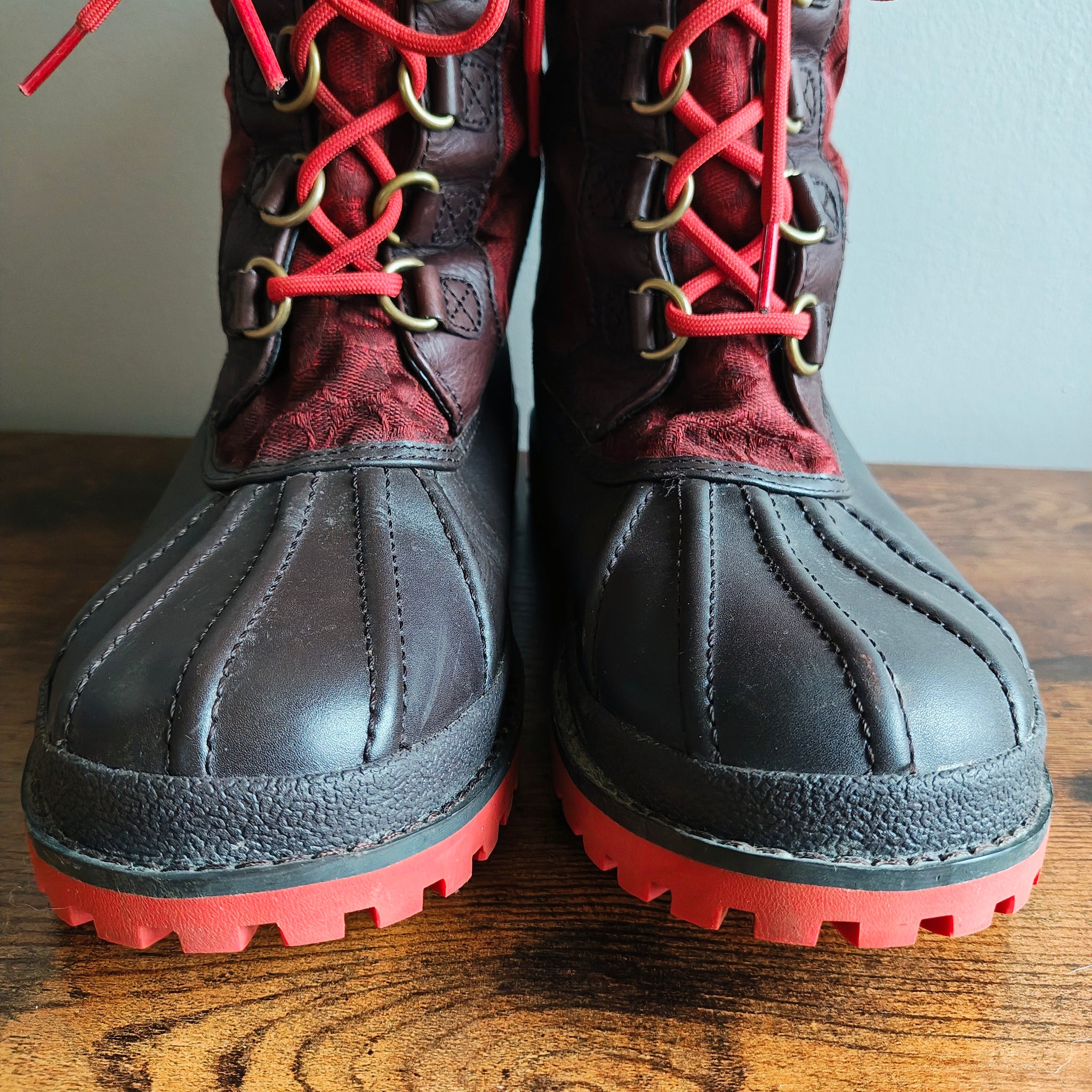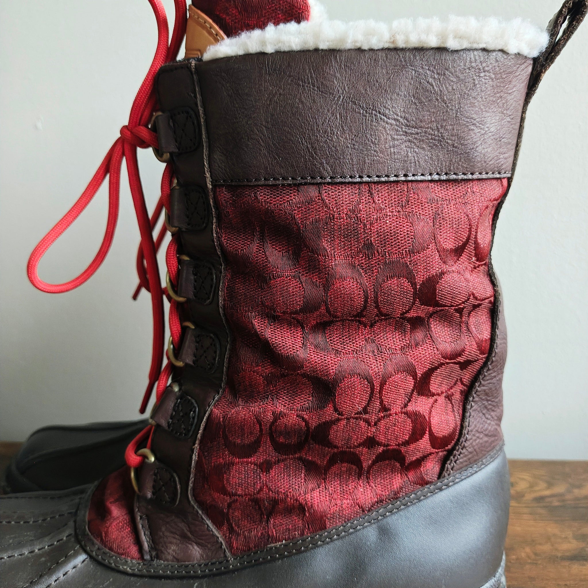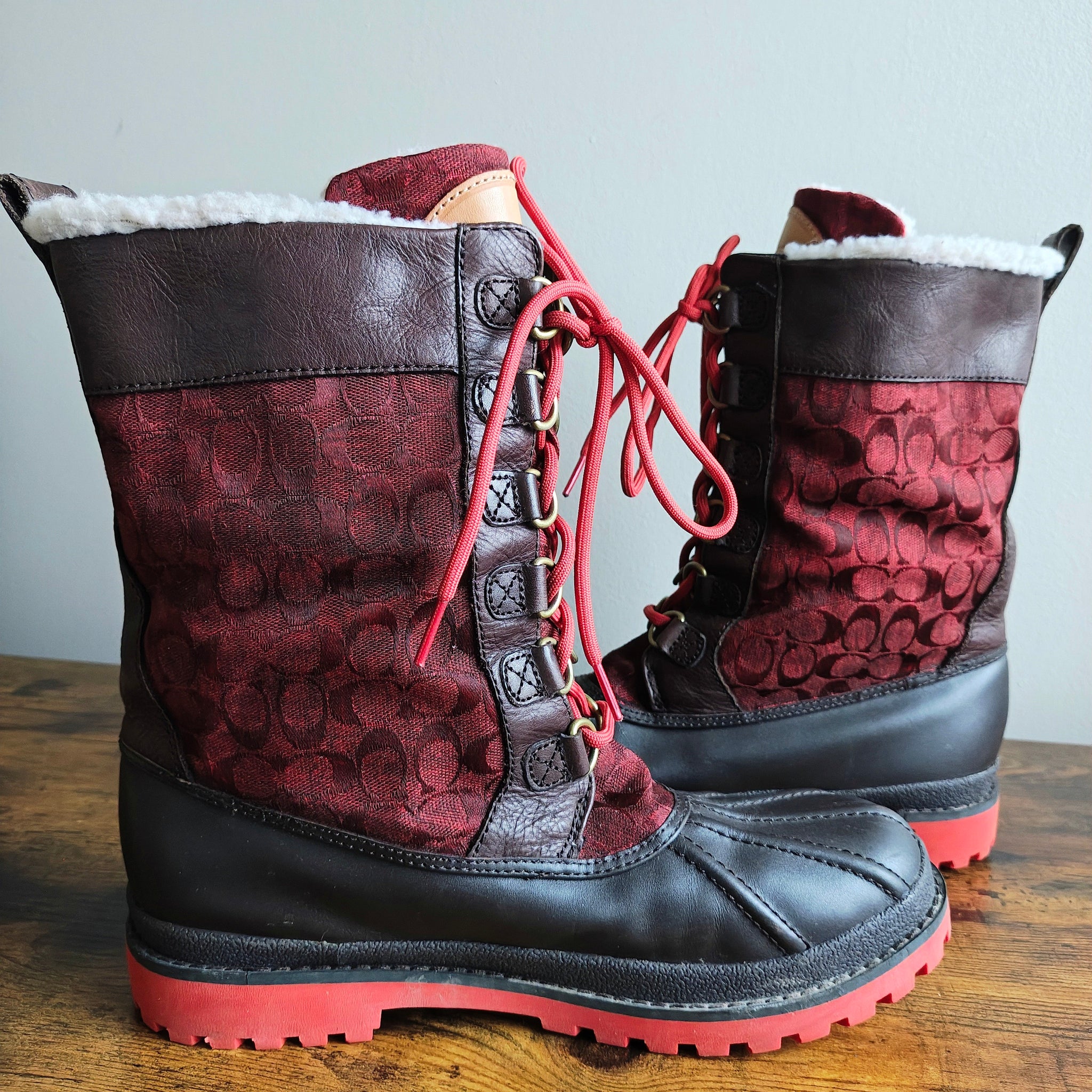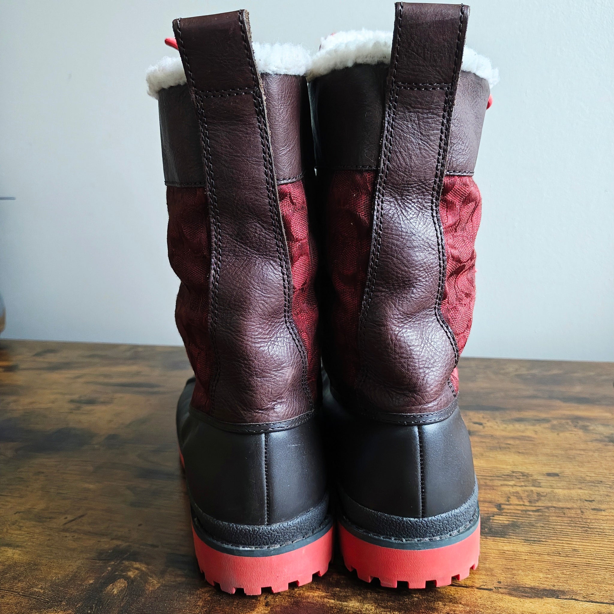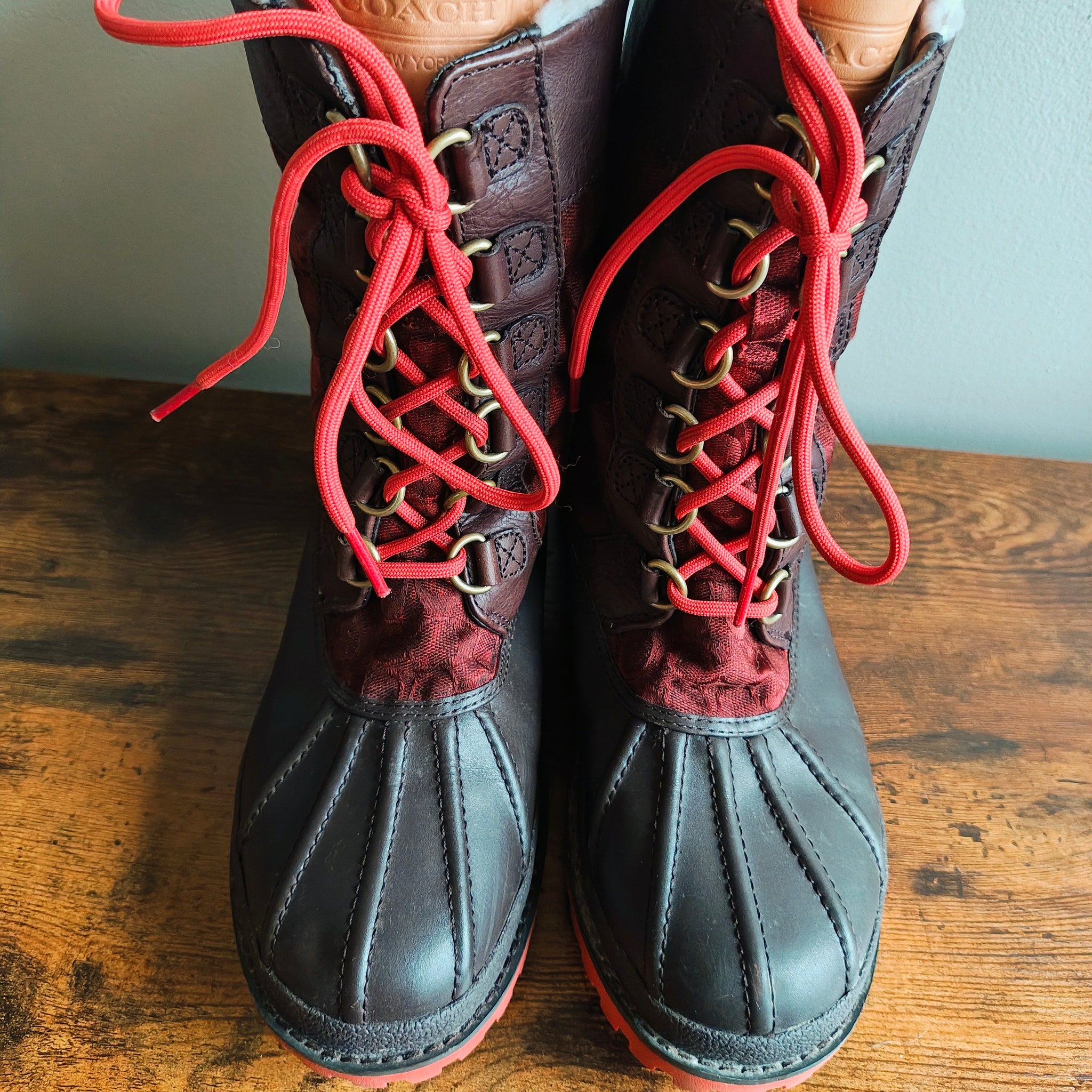 Coach Laura duck boots in a red and brown colorway. They are a weather-resistant winter boot style featuring brown leather and rubber with quilted red fabric panels, bright red laces, and a red rubber sole.
