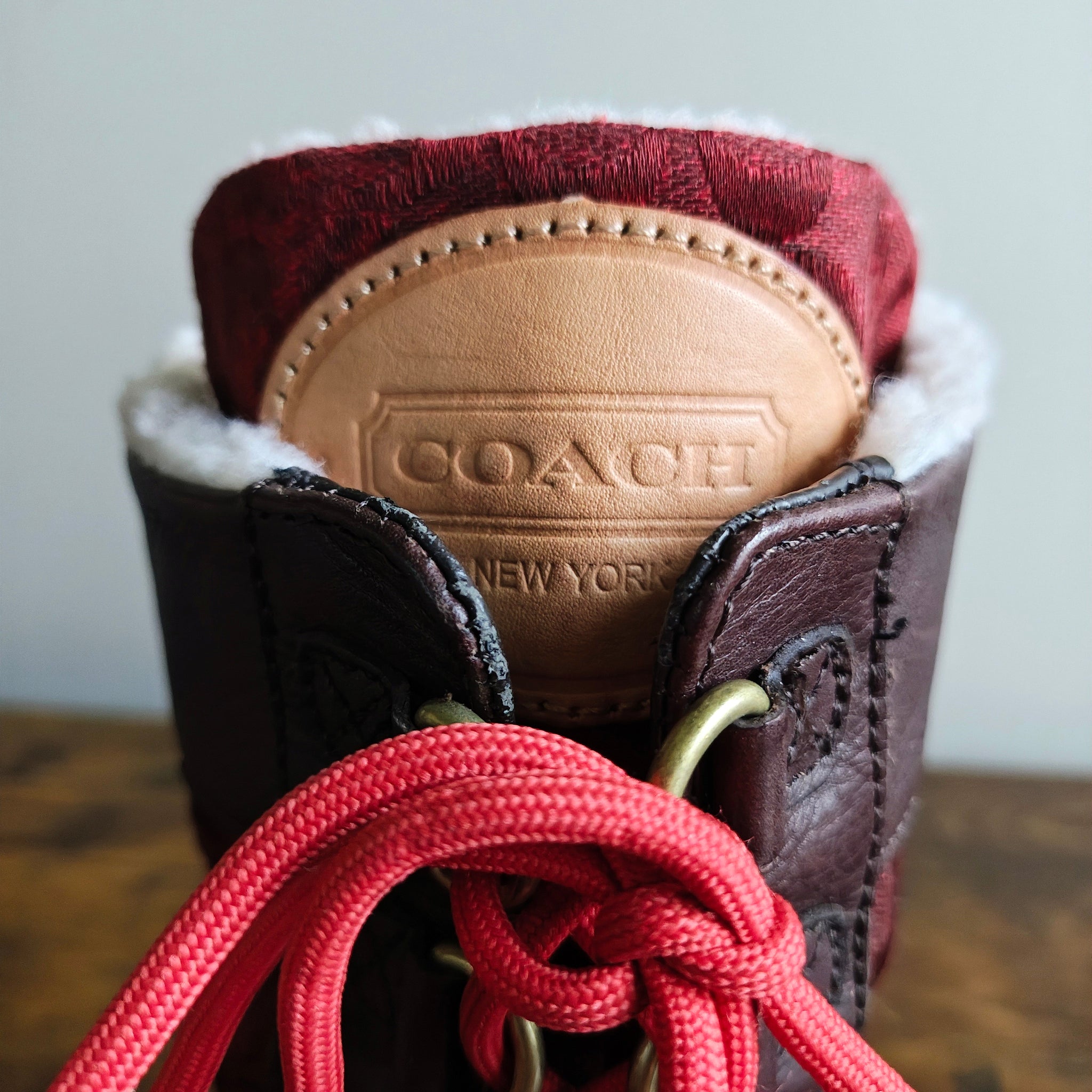 Design Features: Quilted signature "C" logo fabric on the shaft, lace-up closure with brass-tone D-ring eyelets, and a lug sole for traction