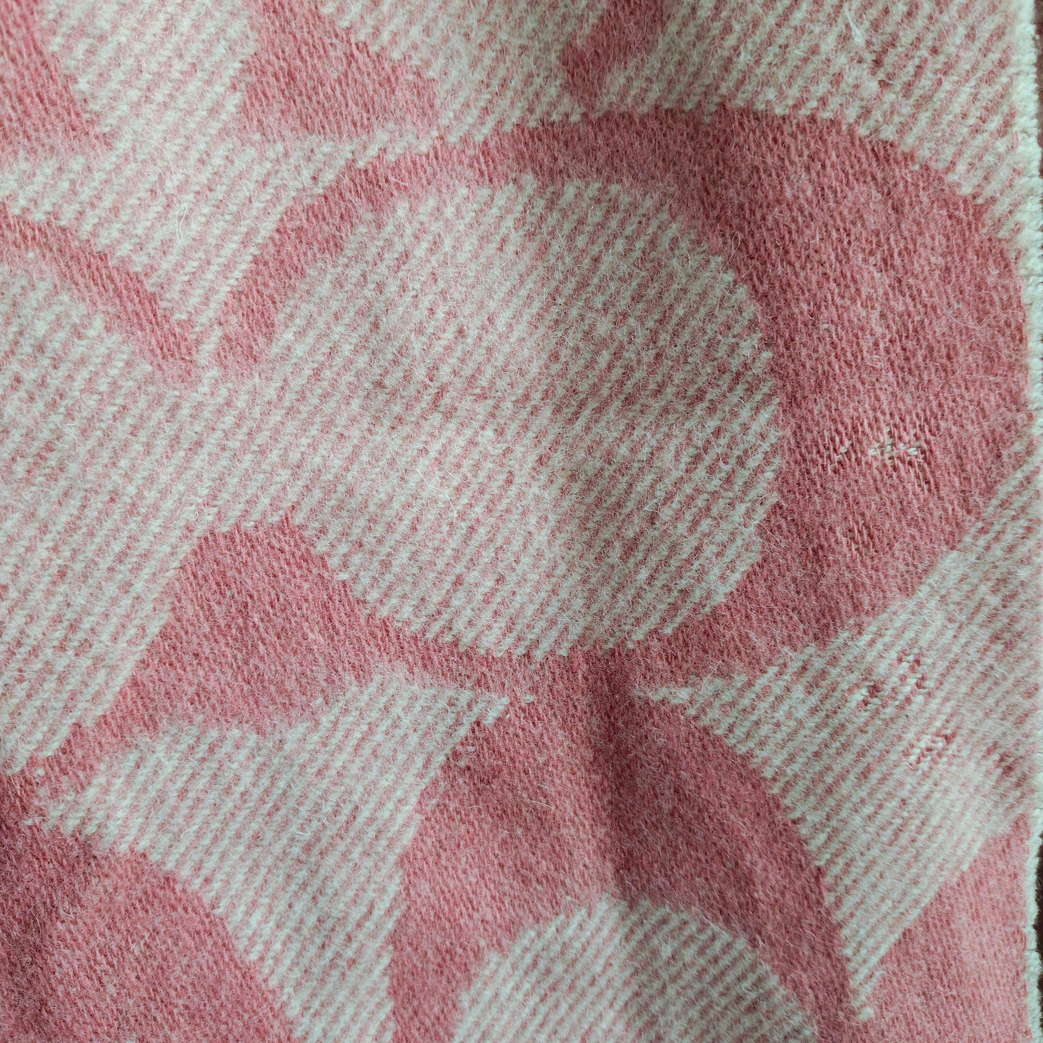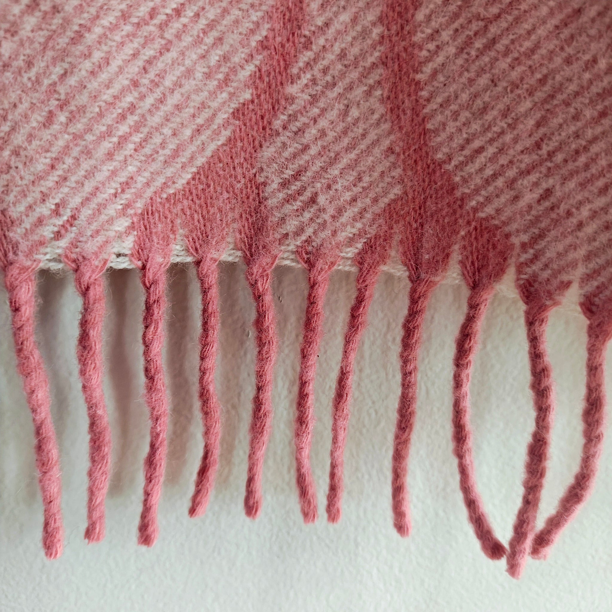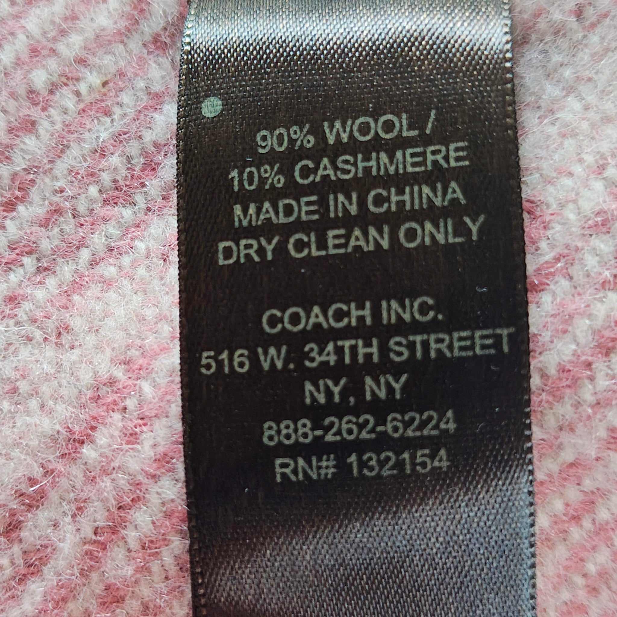 Coach reversible signature muffler scarf, featuring the brand's iconic "C" monogram pattern in a pink and white colorway with fringed trim at the ends.
