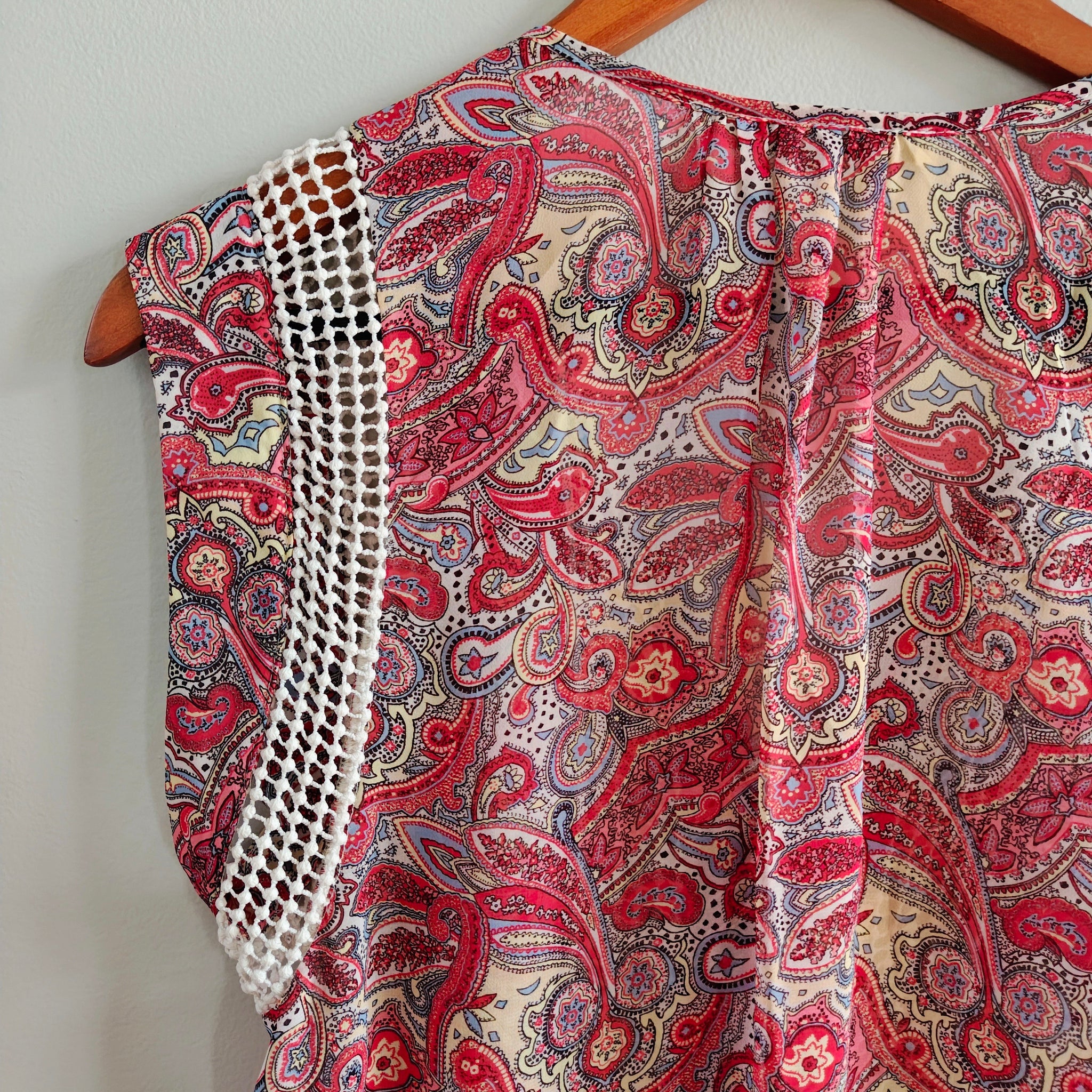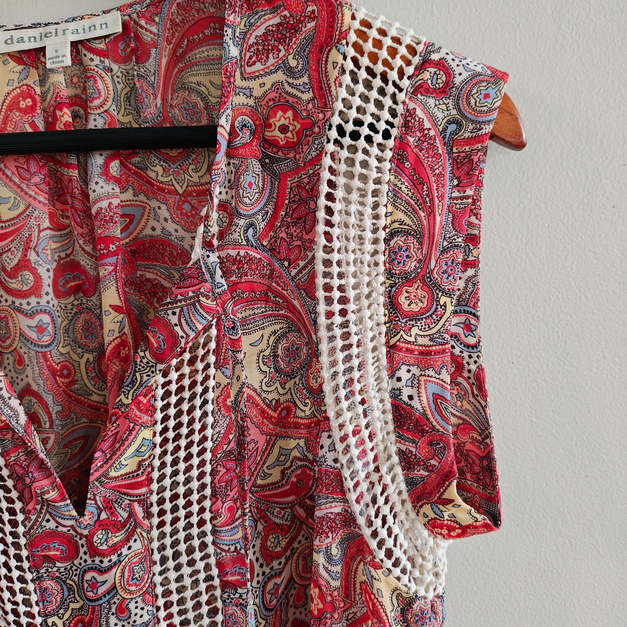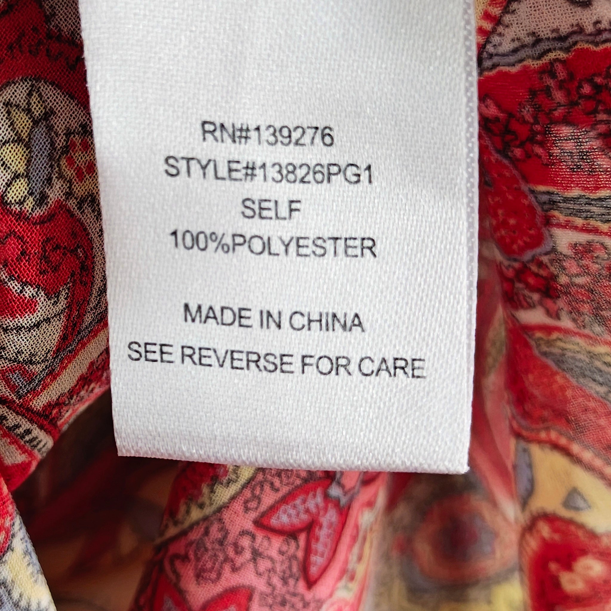 Color: Red, with a multi-color paisley print that includes shades of blue, yellow, and pink