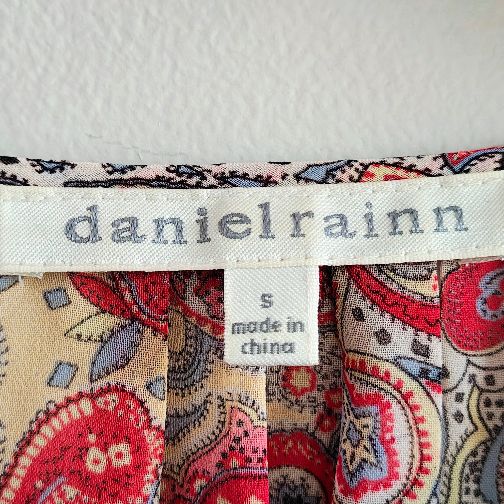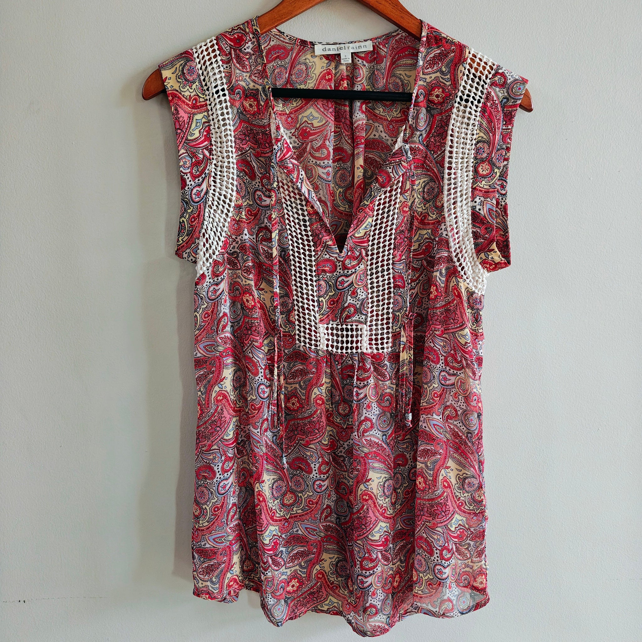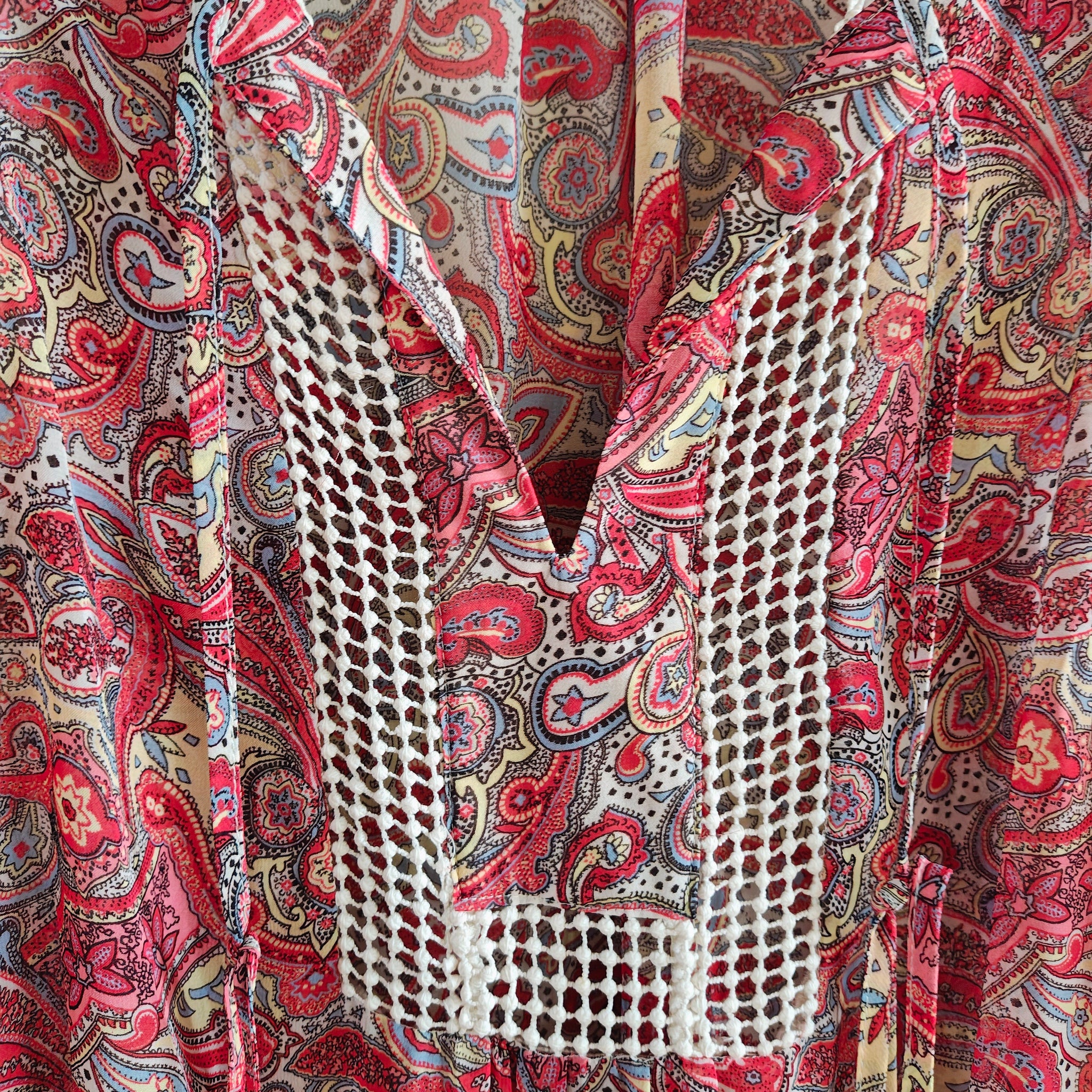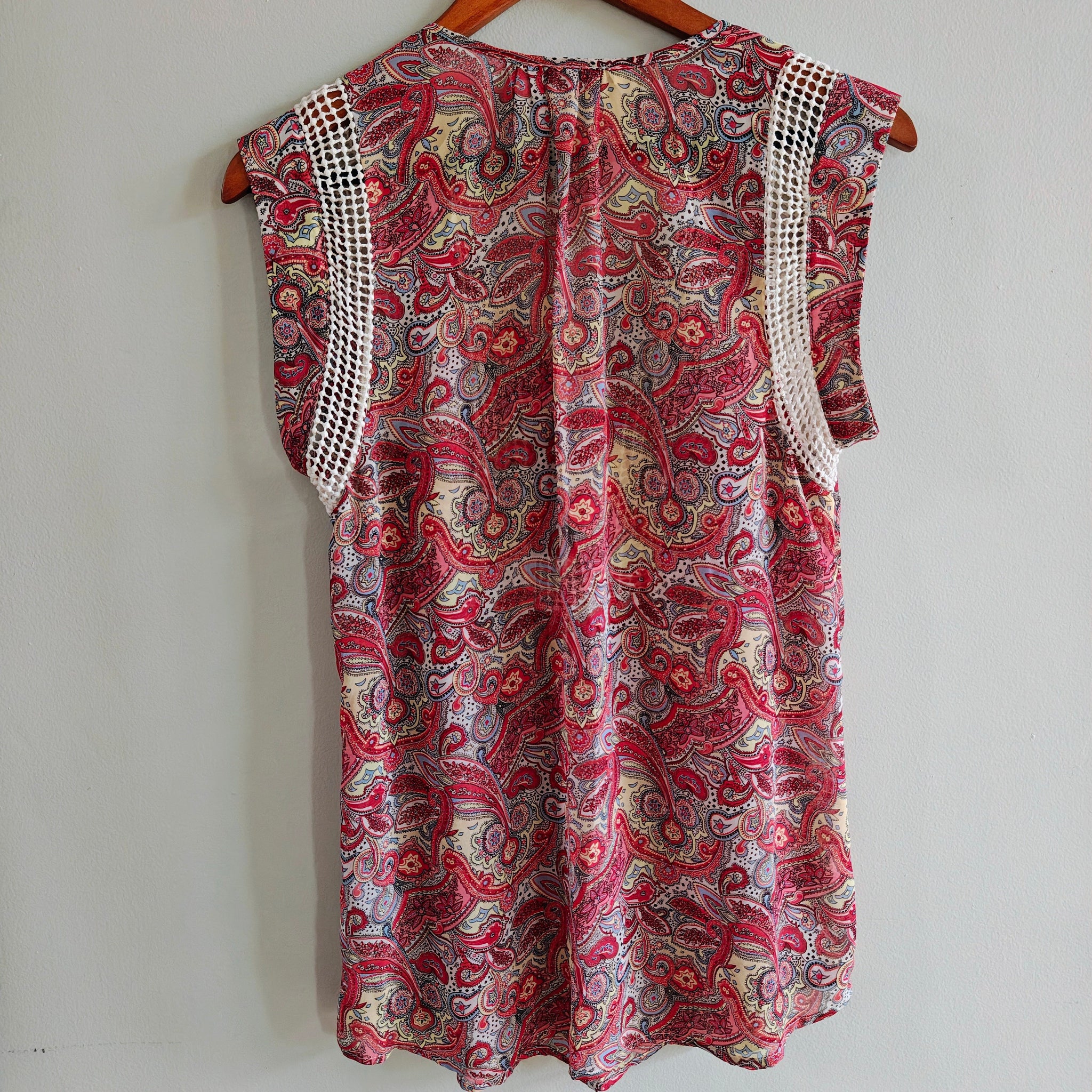 Color: Red, with a multi-color paisley print that includes shades of blue, yellow, and pink