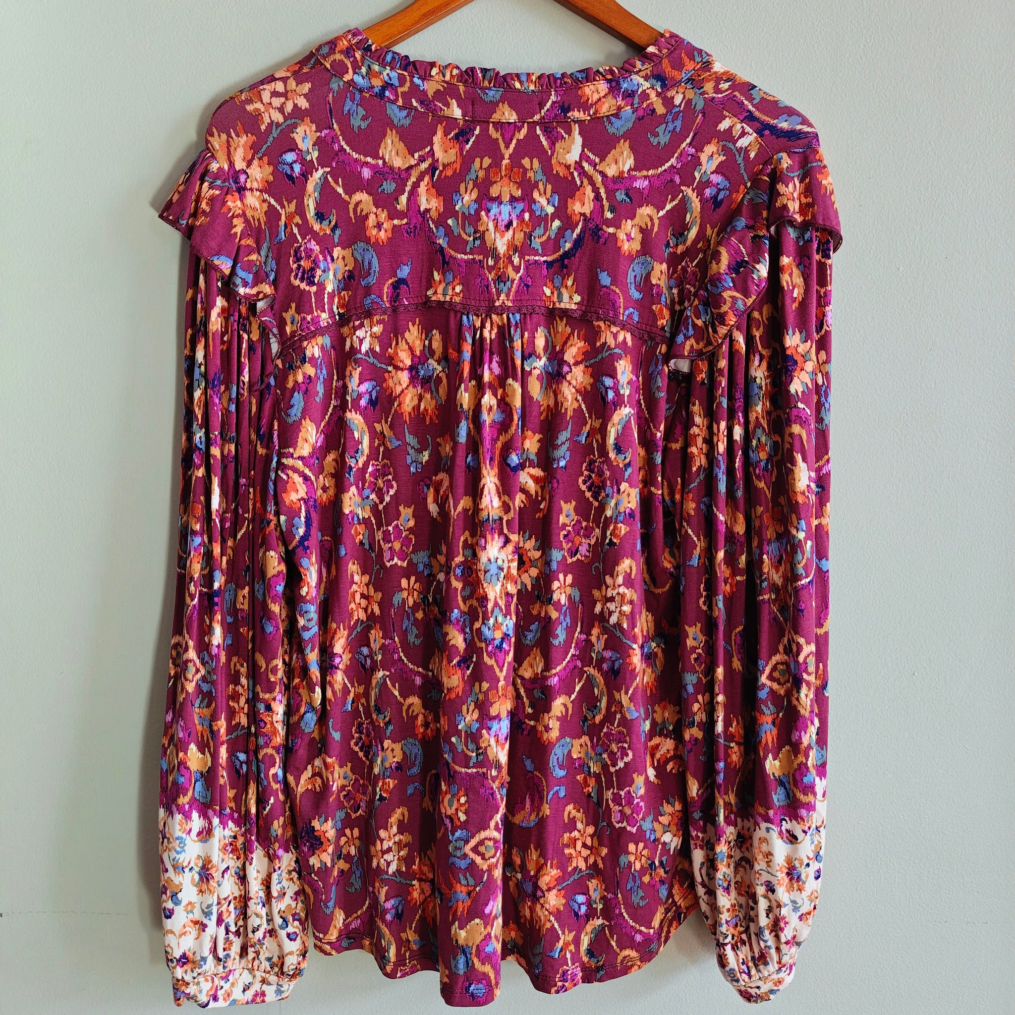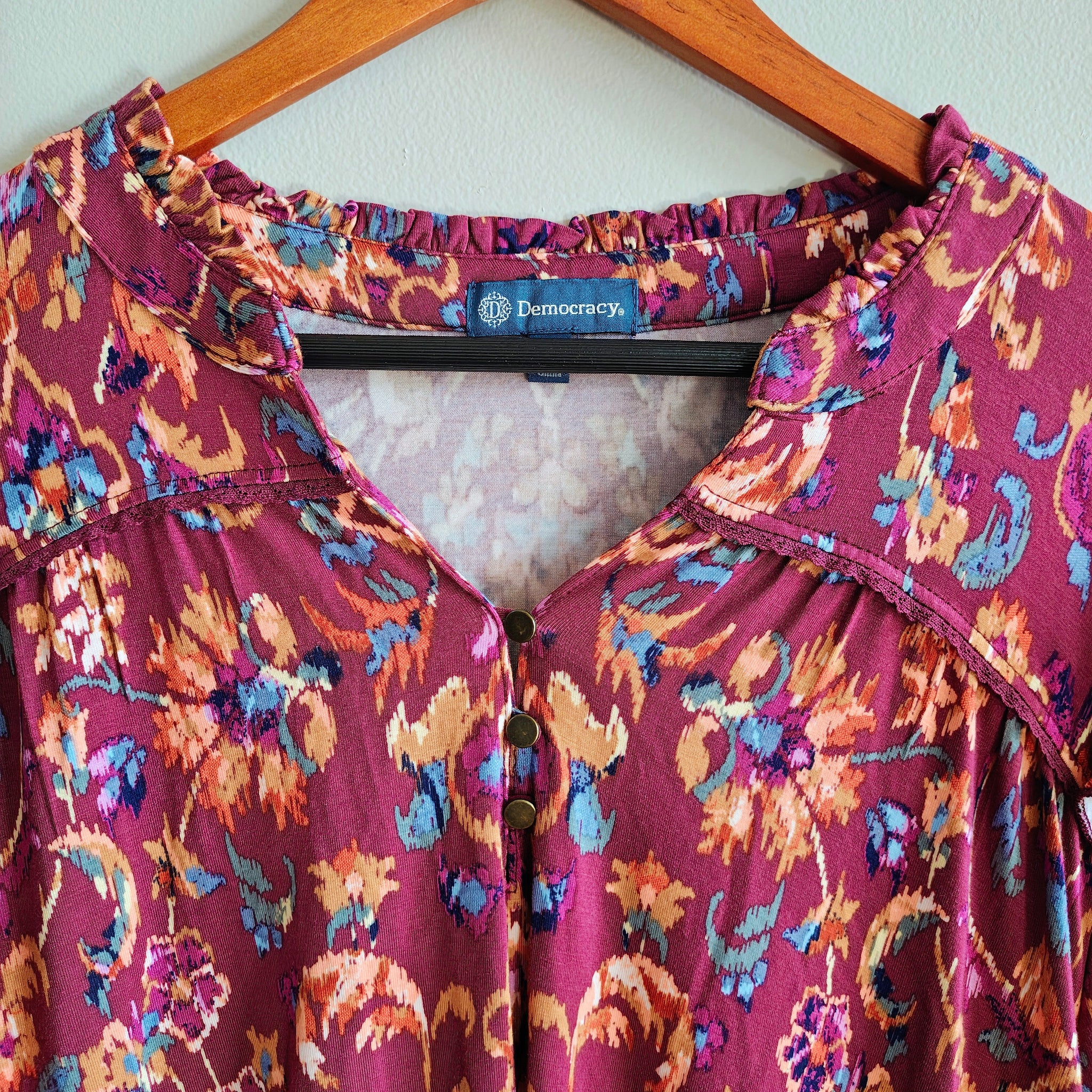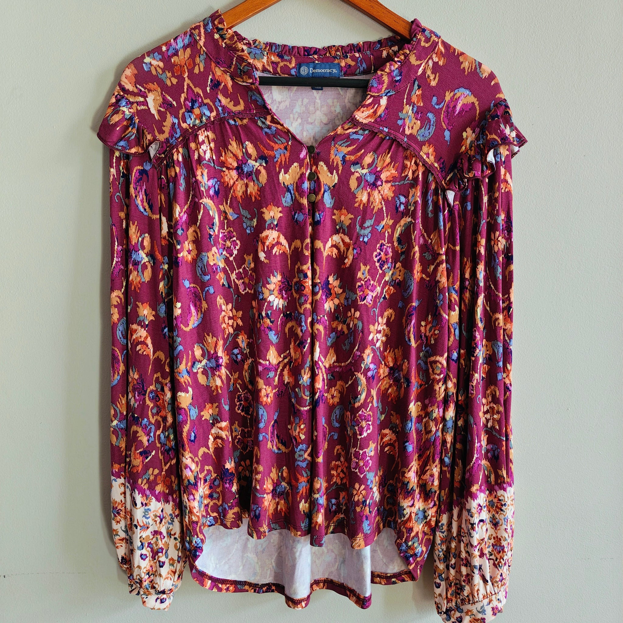 Democracy women's floral long-sleeve peasant blouse. The blouse features a vibrant purple, red, and pink all-over floral pattern, a notched v-neckline with a partial button-down placket, ruffle details at the collar and shoulders, and contrasting patterned cuffs and hem.
