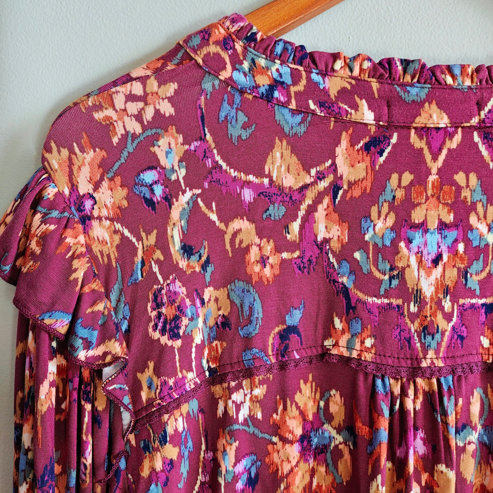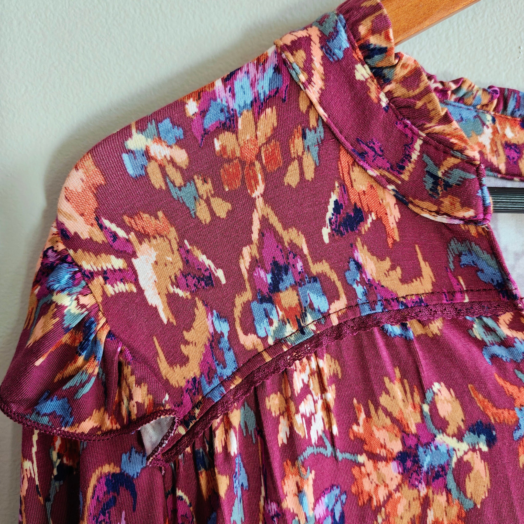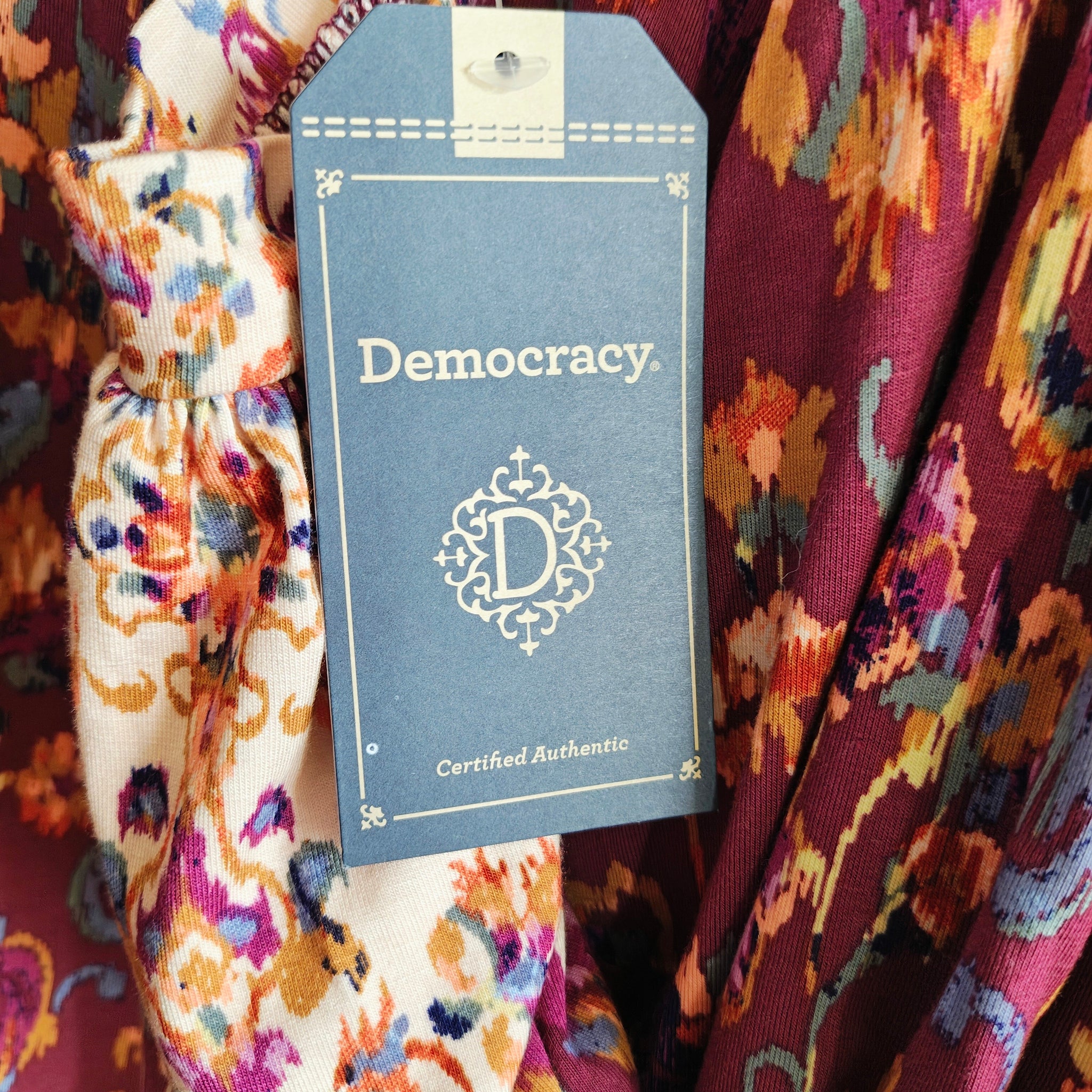 Democracy women's floral long-sleeve peasant blouse. The blouse features a vibrant purple, red, and pink all-over floral pattern, a notched v-neckline with a partial button-down placket, ruffle details at the collar and shoulders, and contrasting patterned cuffs and hem.