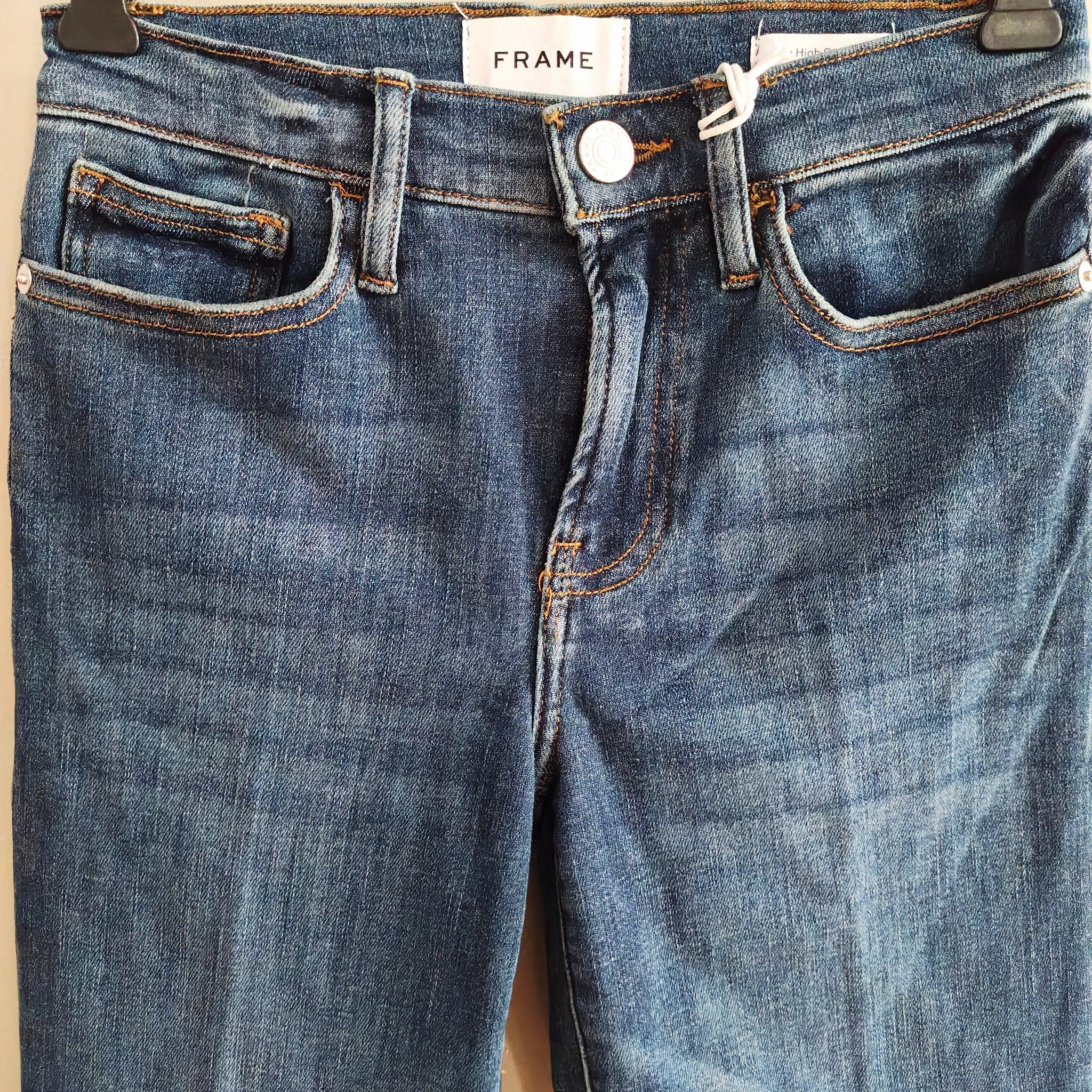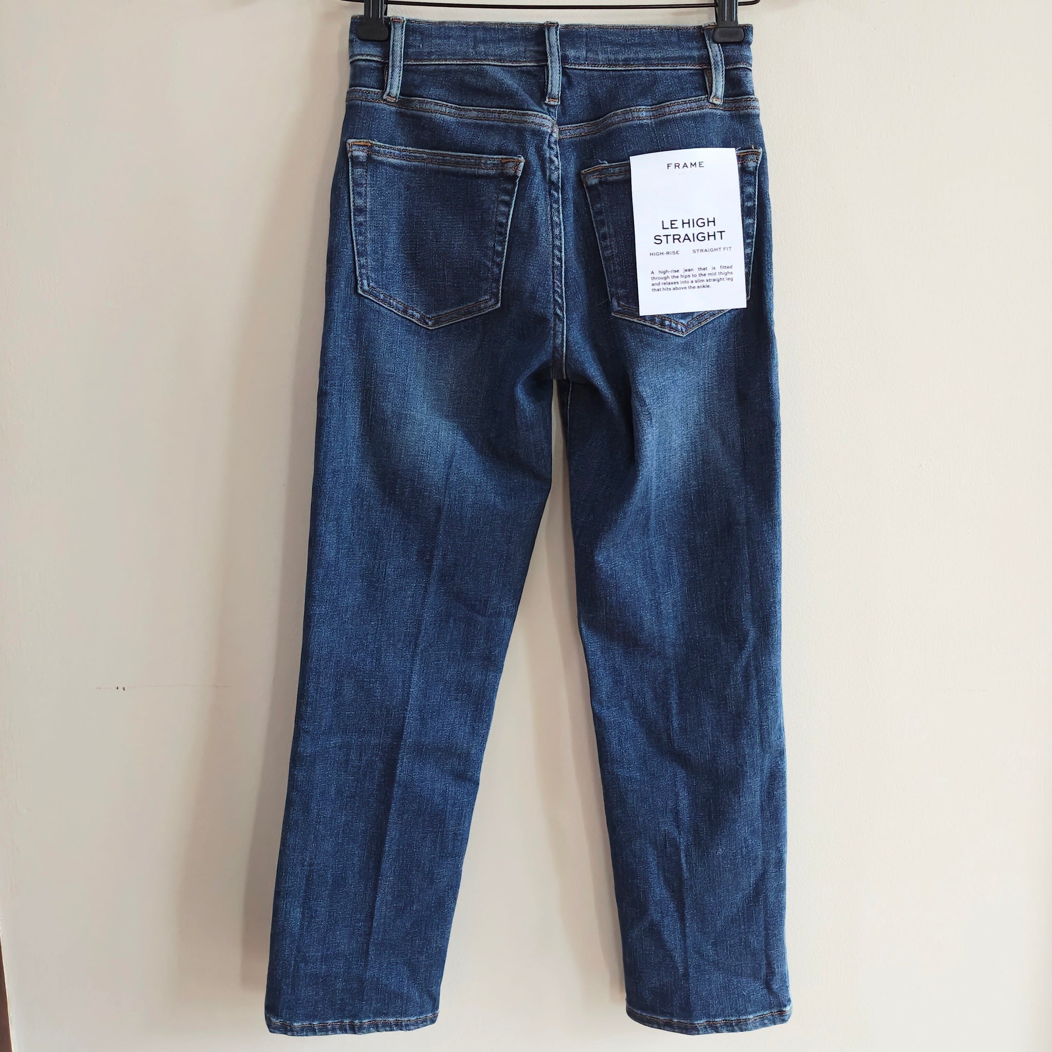 FRAME Le High Straight jeans, known for their high-rise silhouette and subtle tapering at the knee. The wash is a classic medium-blue with slight whiskering, characteristic of FRAME denim lines.
