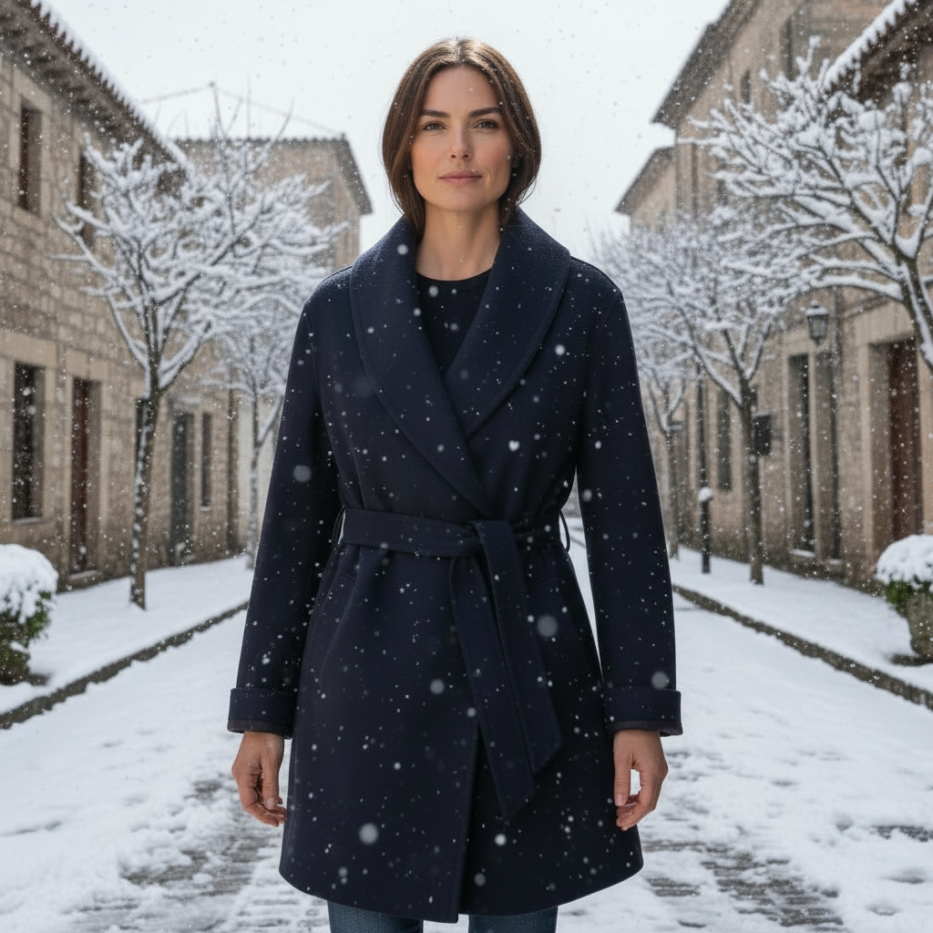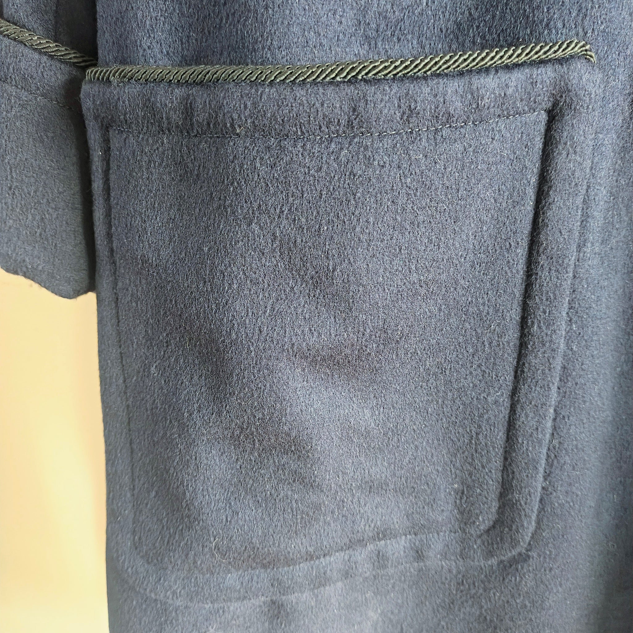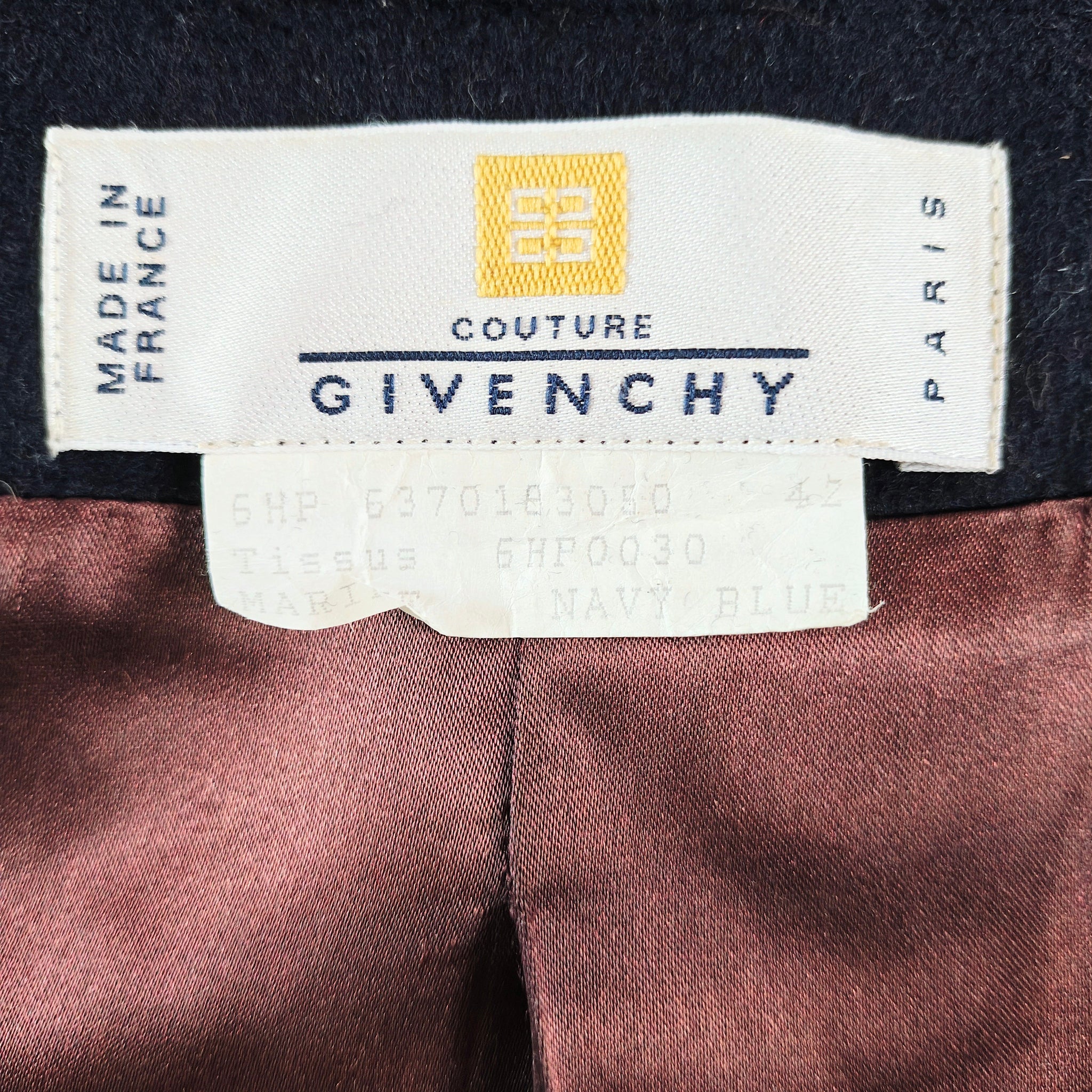 Navy blue Givenchy Couture wool coat with a distinctive shawl collar, large patch pockets, and rolled-up cuffs, with a single button closure at the waist.