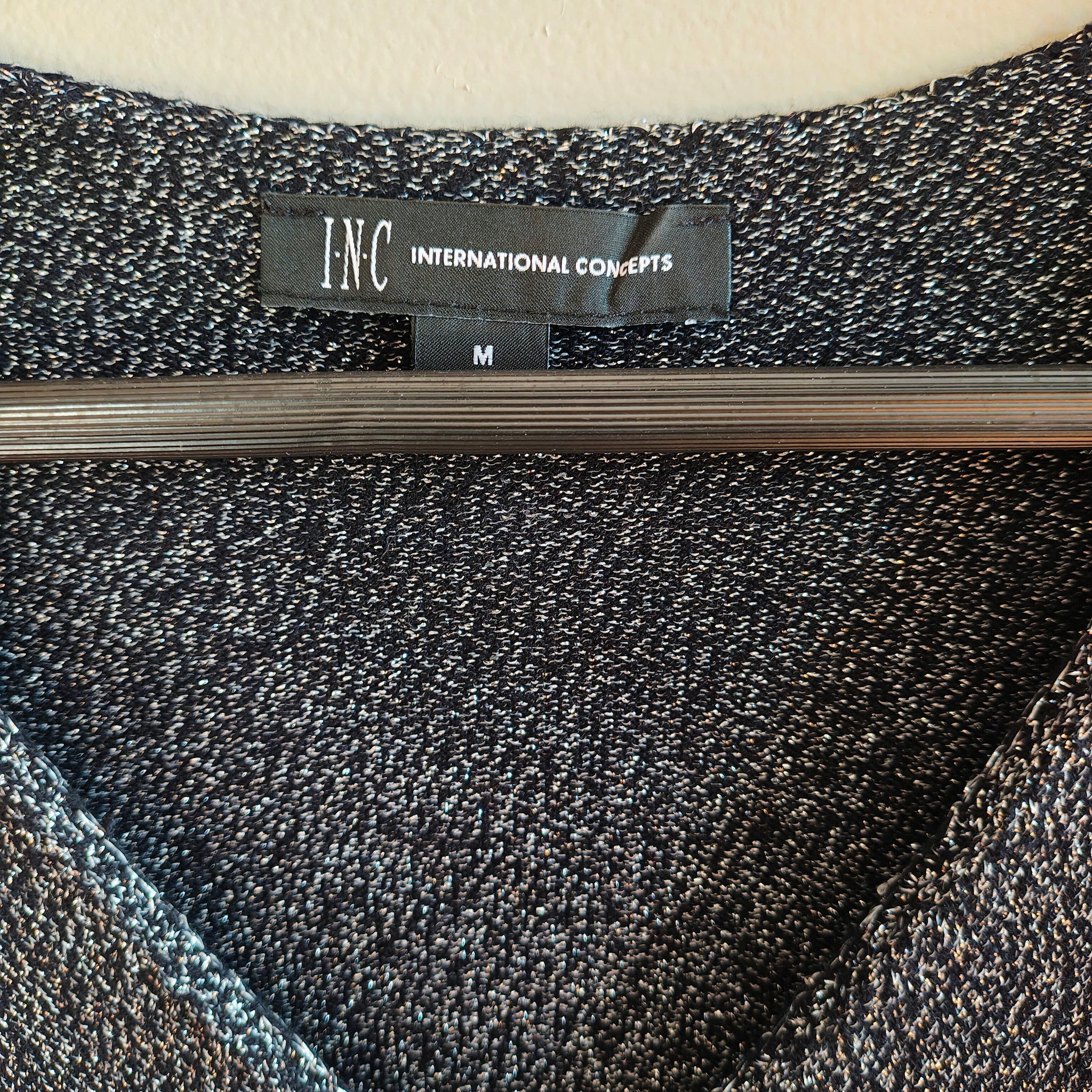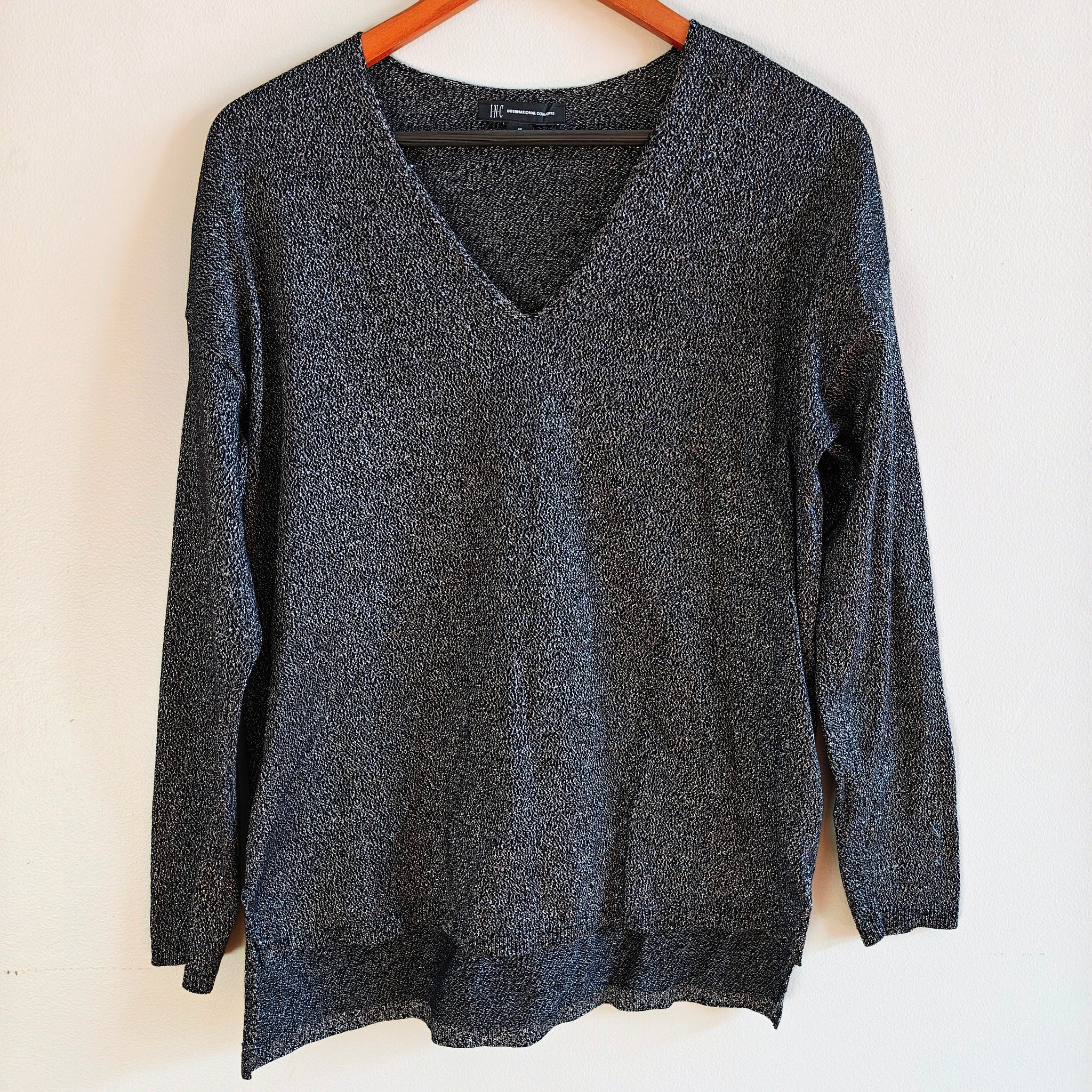 INC International Concepts women's shine v-neck long-sleeve tunic sweater in a black and silver color. The sweater is known for its shimmer design and is machine washable.