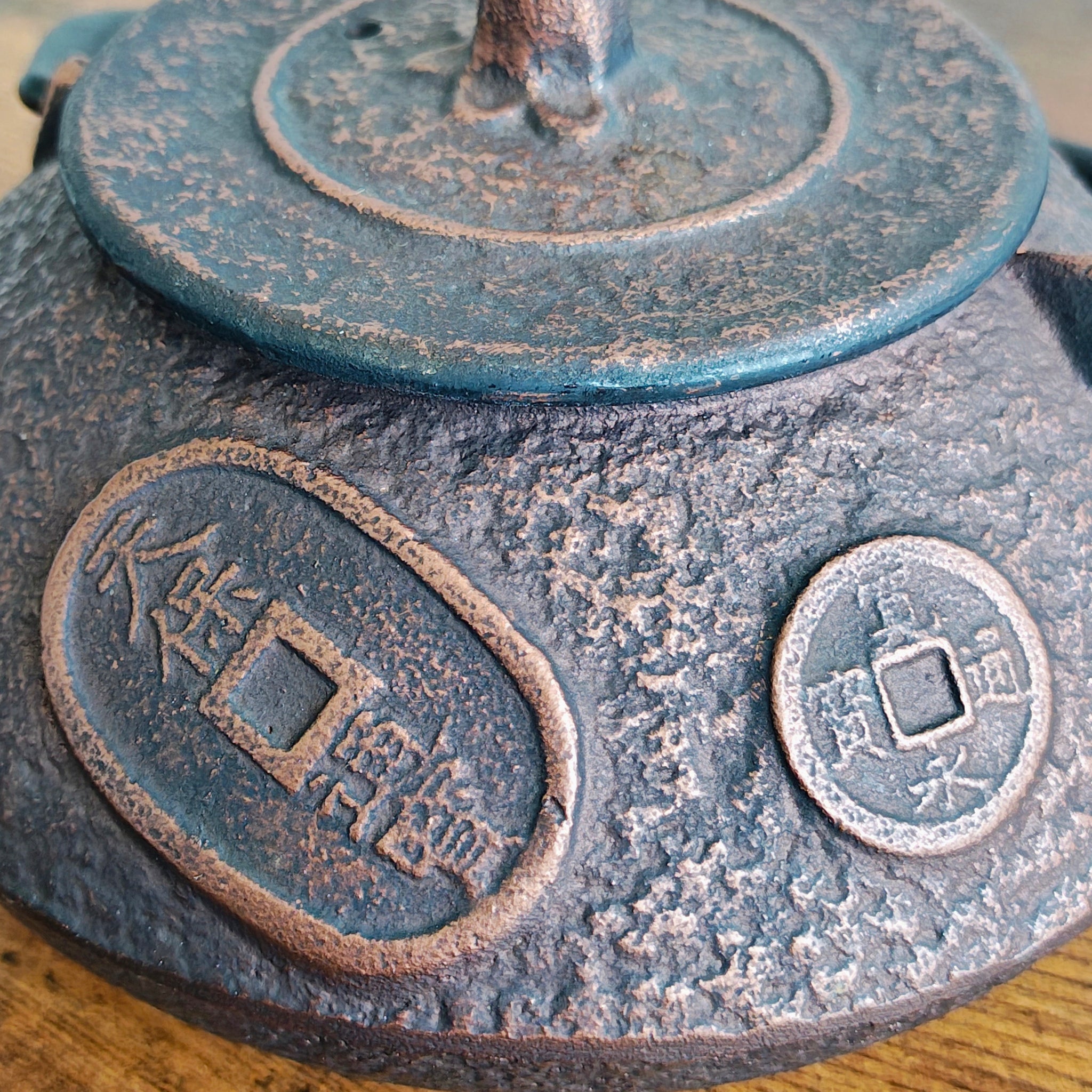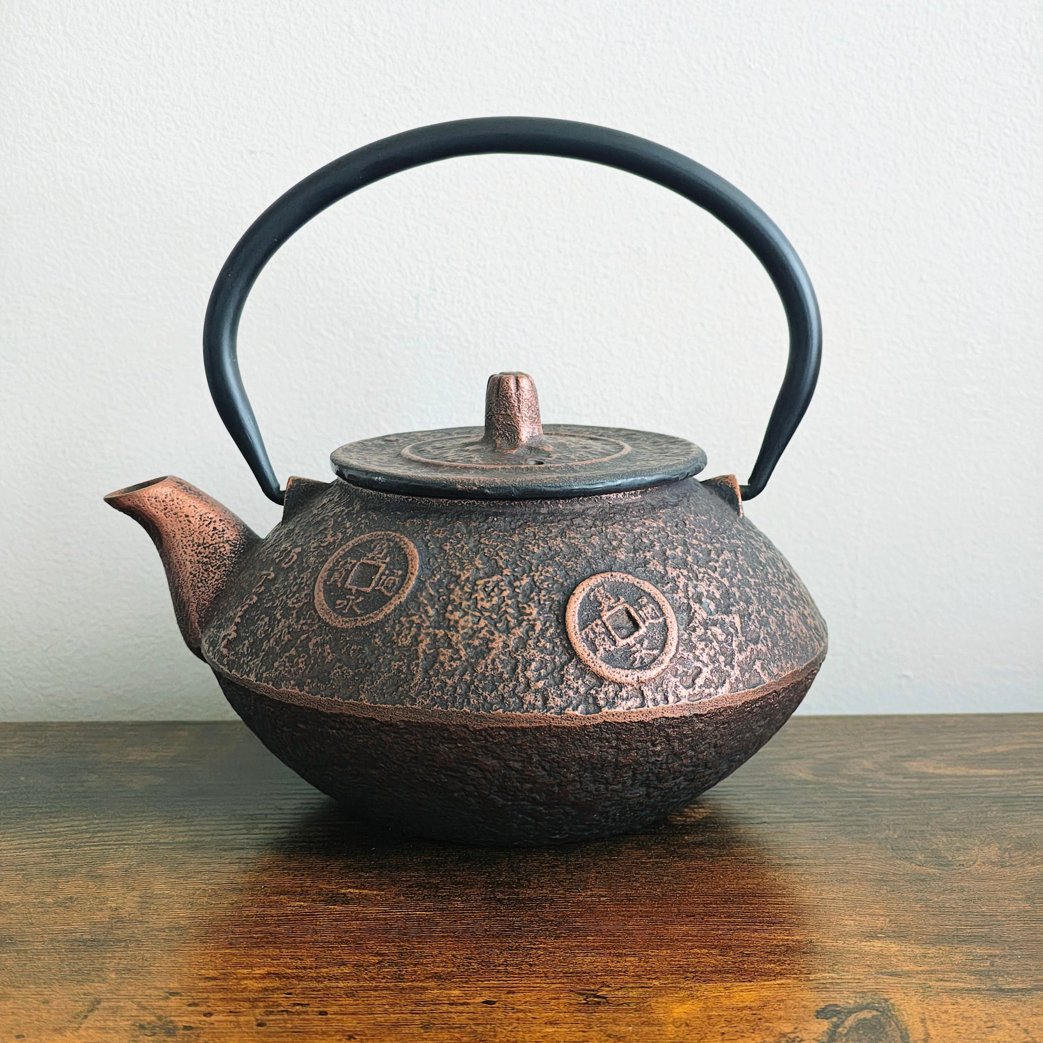 Japanese cast iron teapot (known as tetsubin or tetsukyusu when enameled inside) with a raised coin or "ancient coin" design and a copper finish. These teapots are often made in the Nanbu region of Japan, by manufacturers like Iwachu or Kotobuki, and feature an enamel lining to prevent rust.