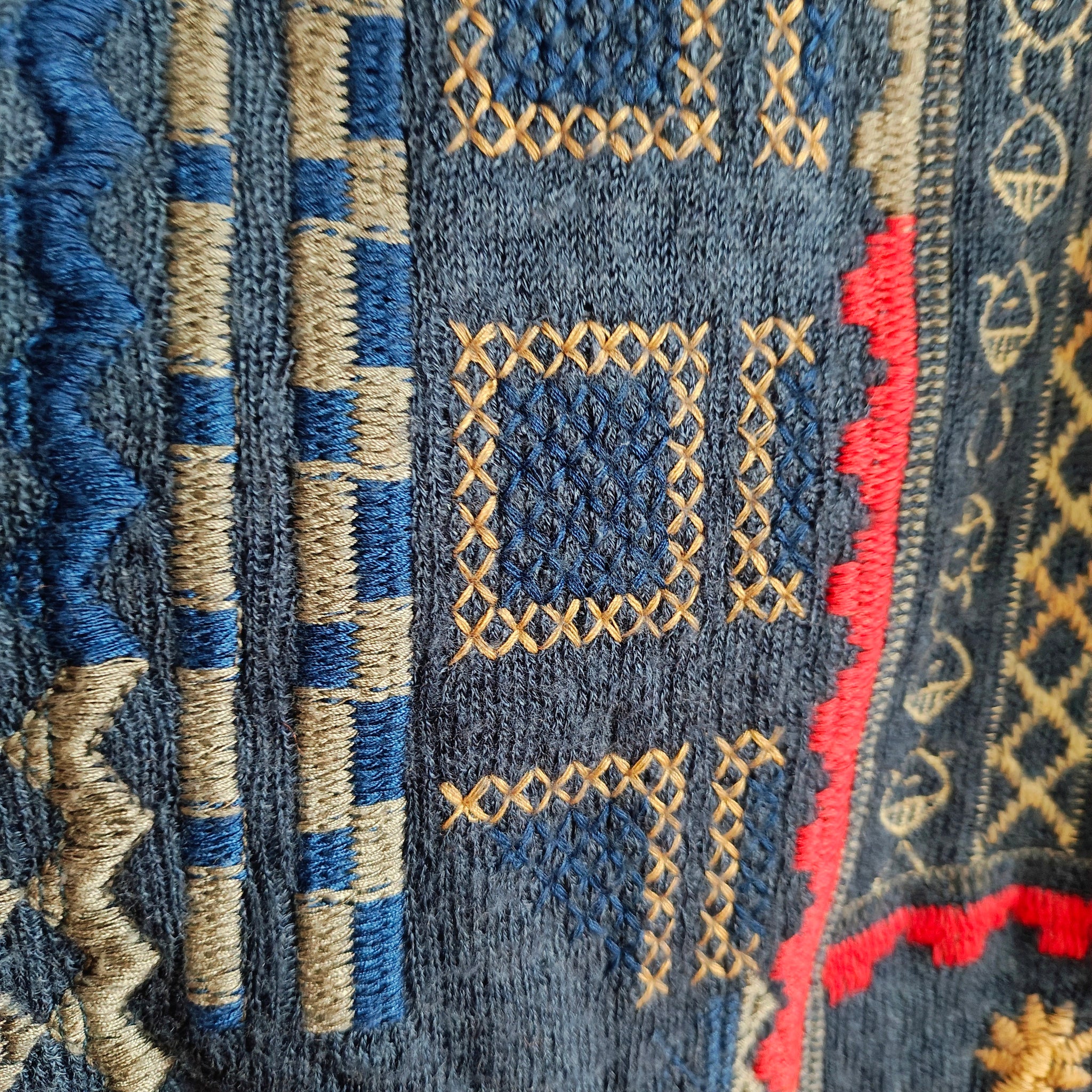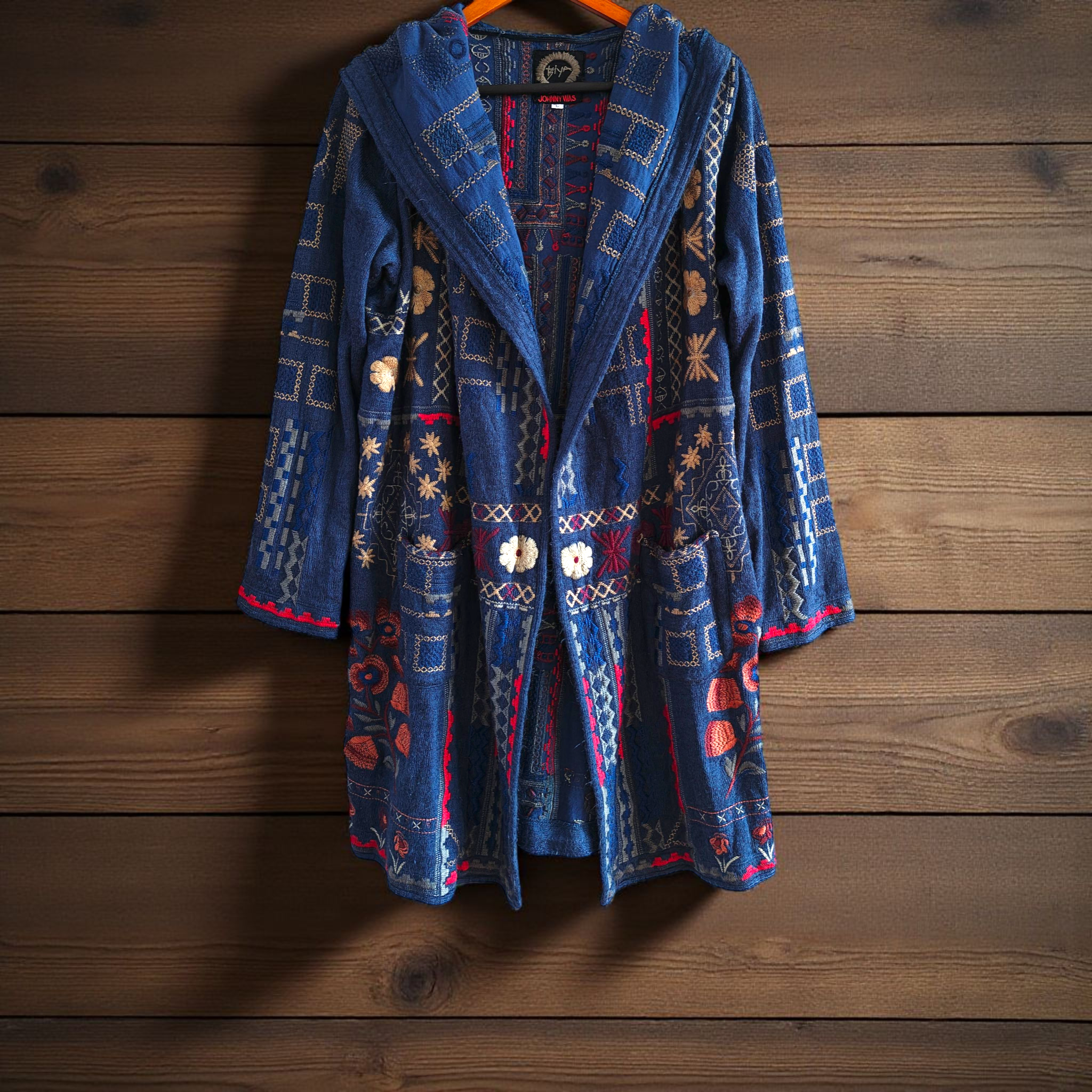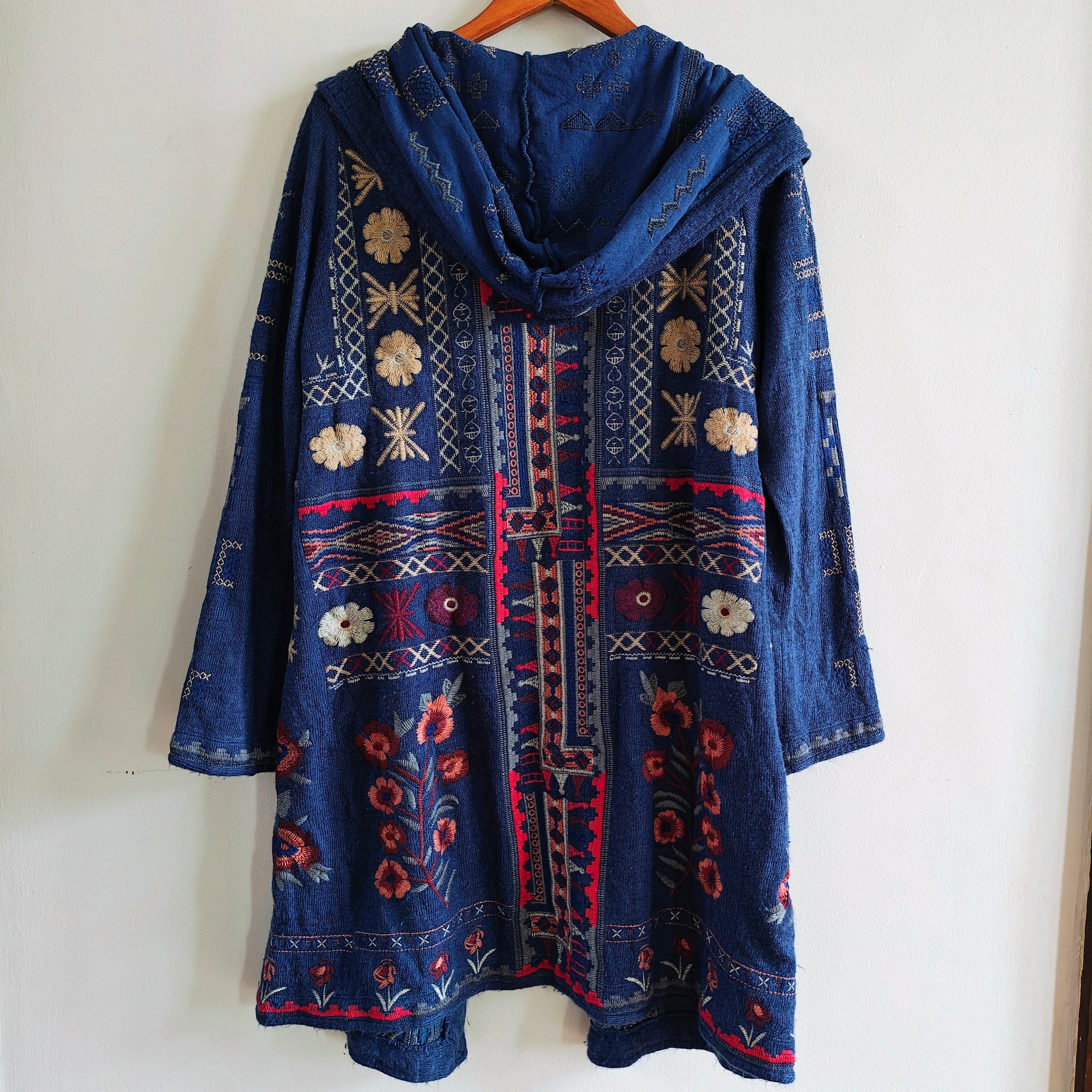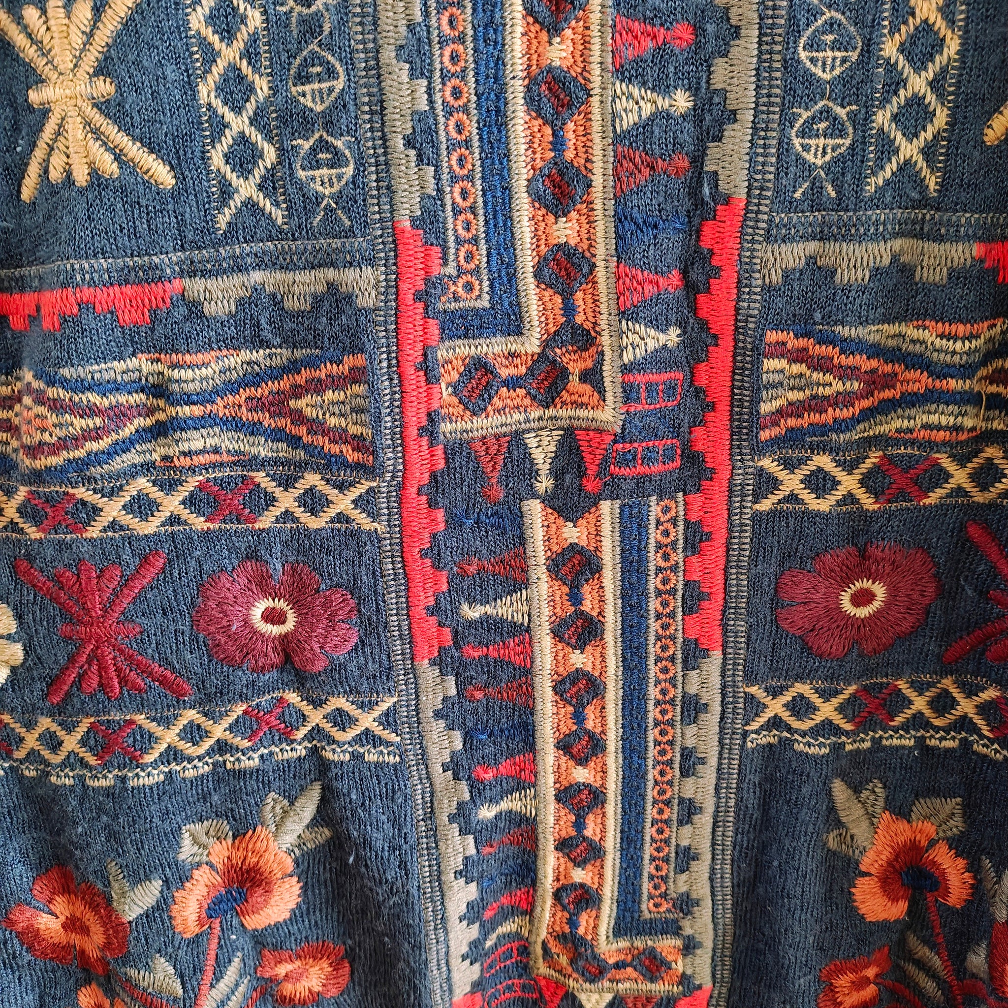 Design: Features a rich navy blue base with extensive, colorful embroidery in floral and geometric patterns, and red accent trim. It has an open front and large front pockets. Unlined.
