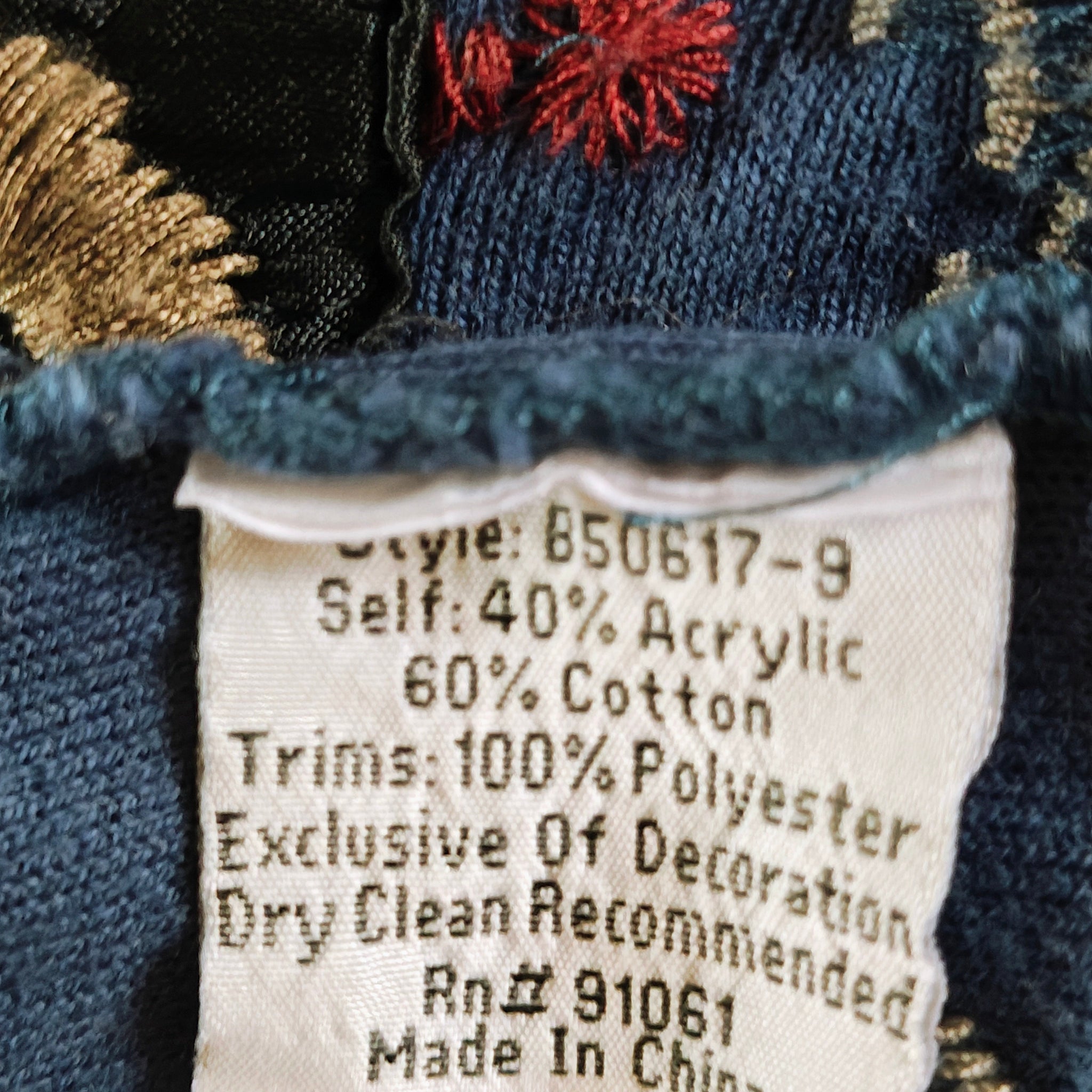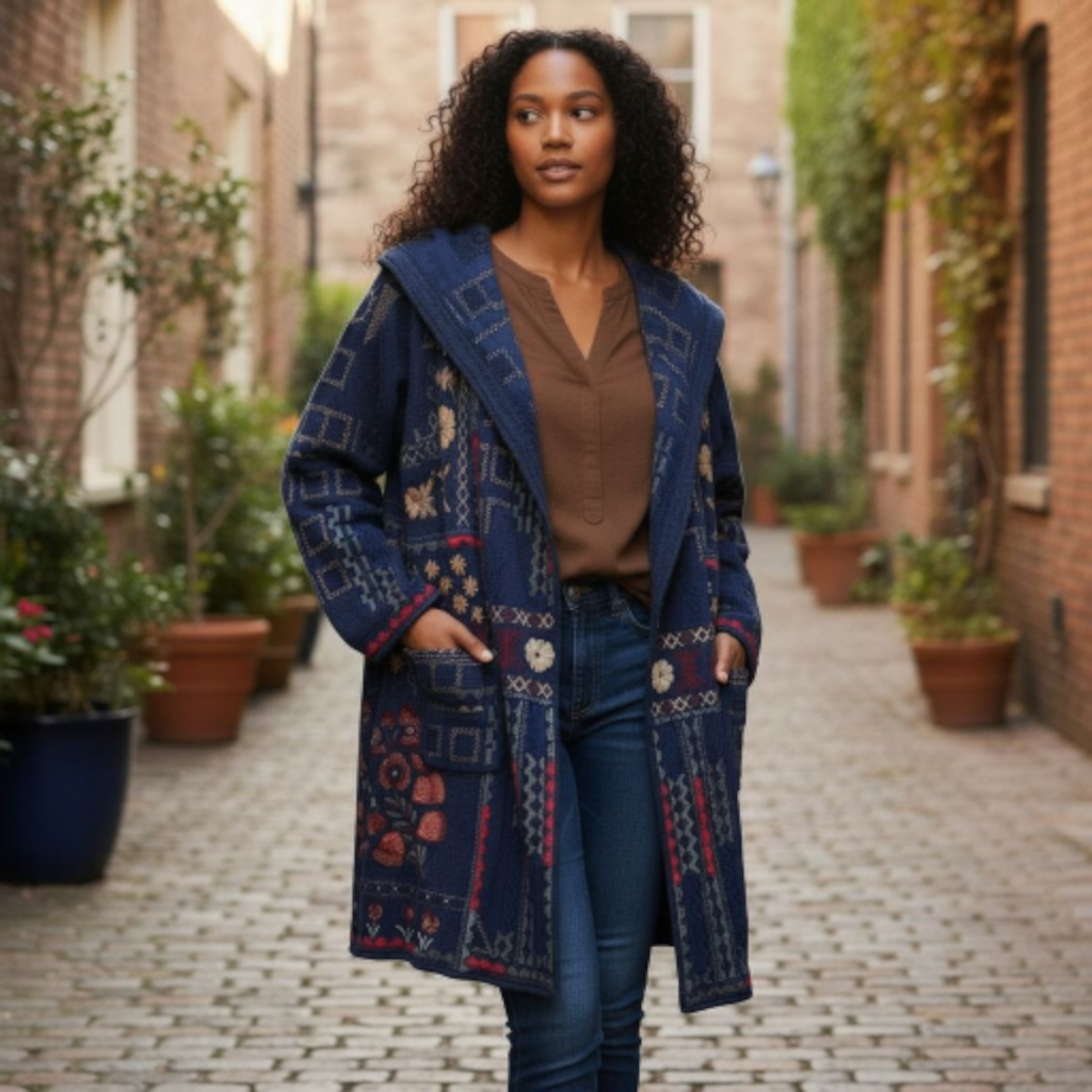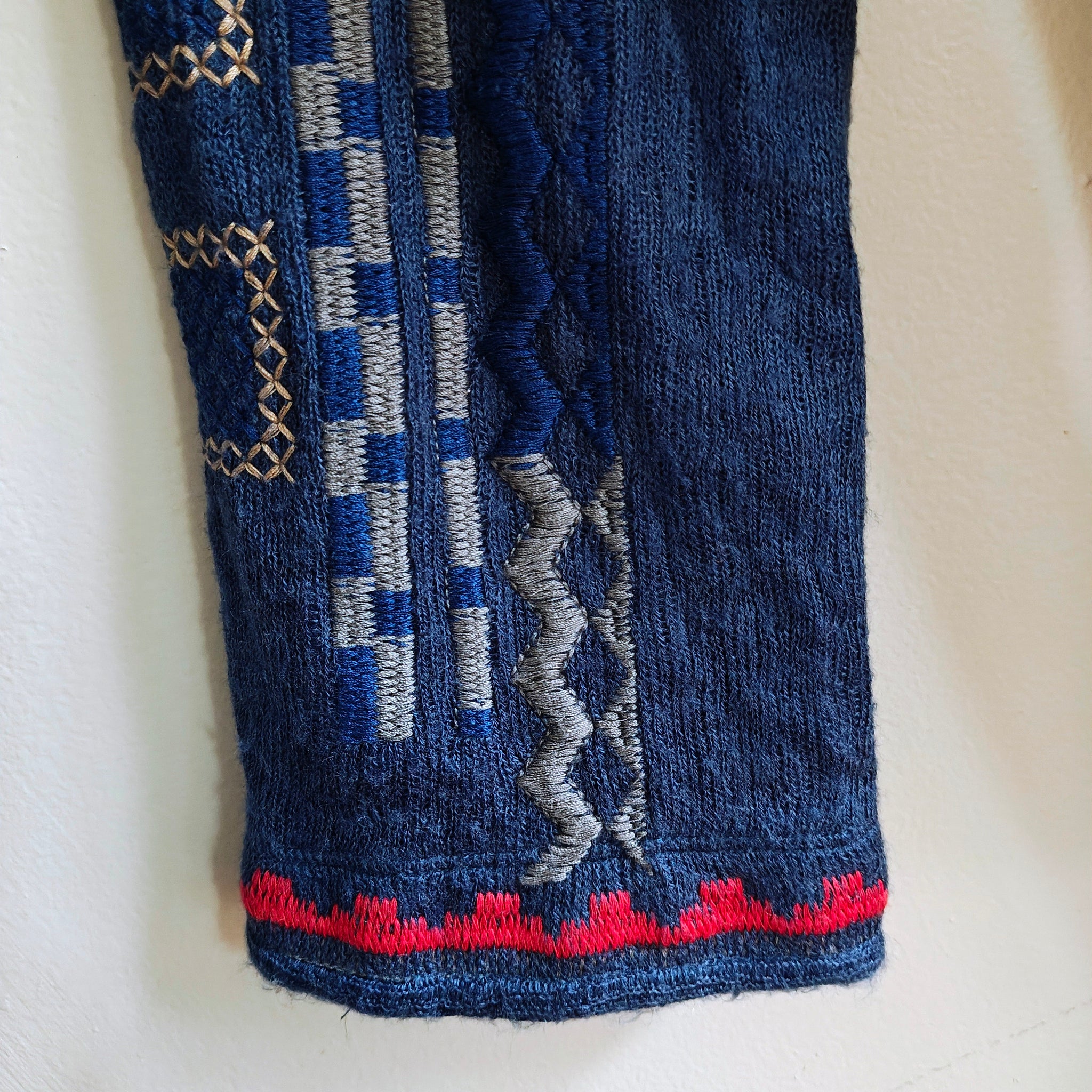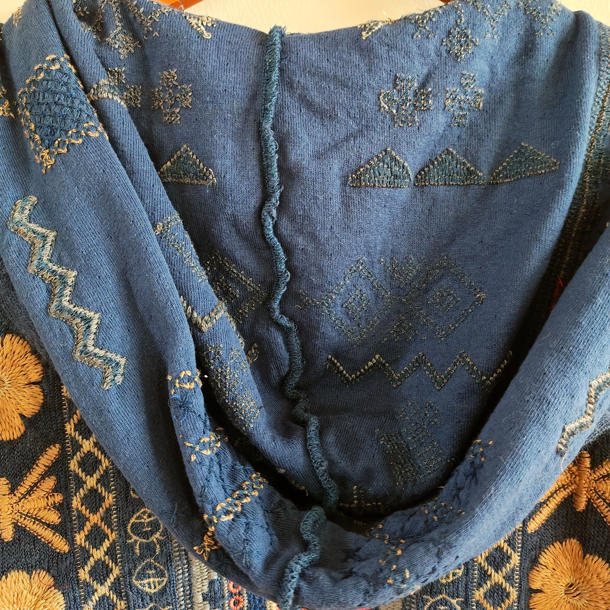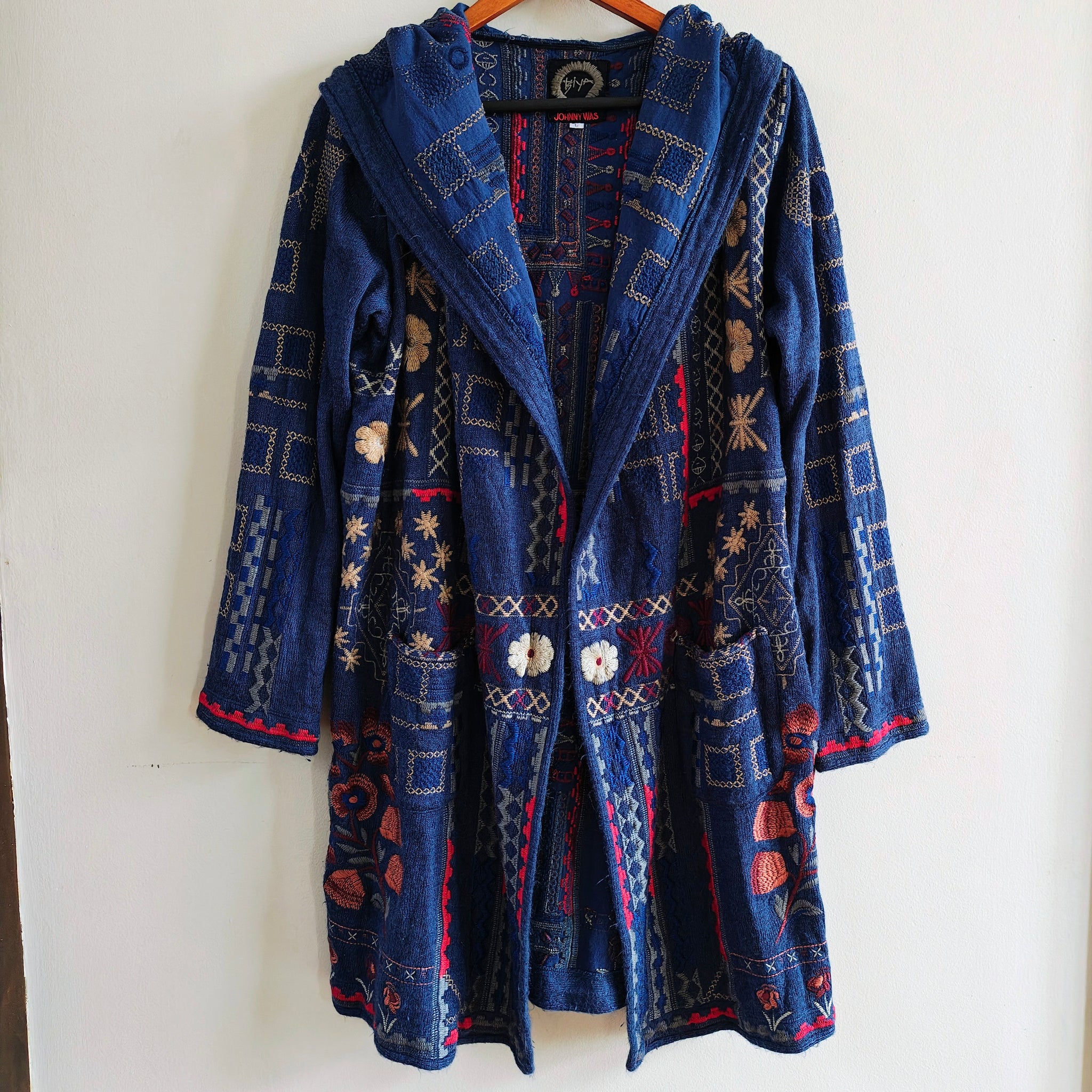 Design: Features a rich navy blue base with extensive, colorful embroidery in floral and geometric patterns, and red accent trim. It has an open front and large front pockets. Unlined.