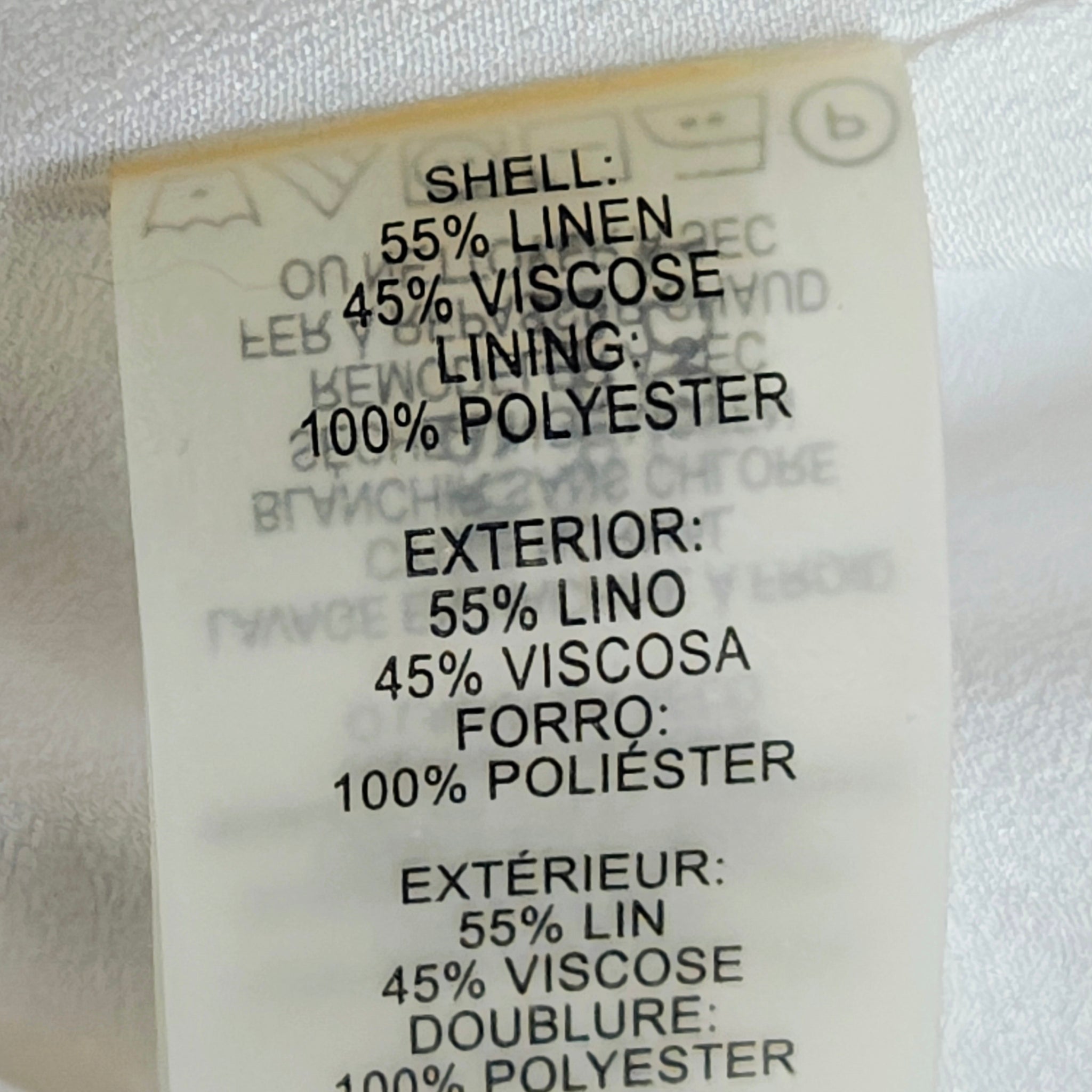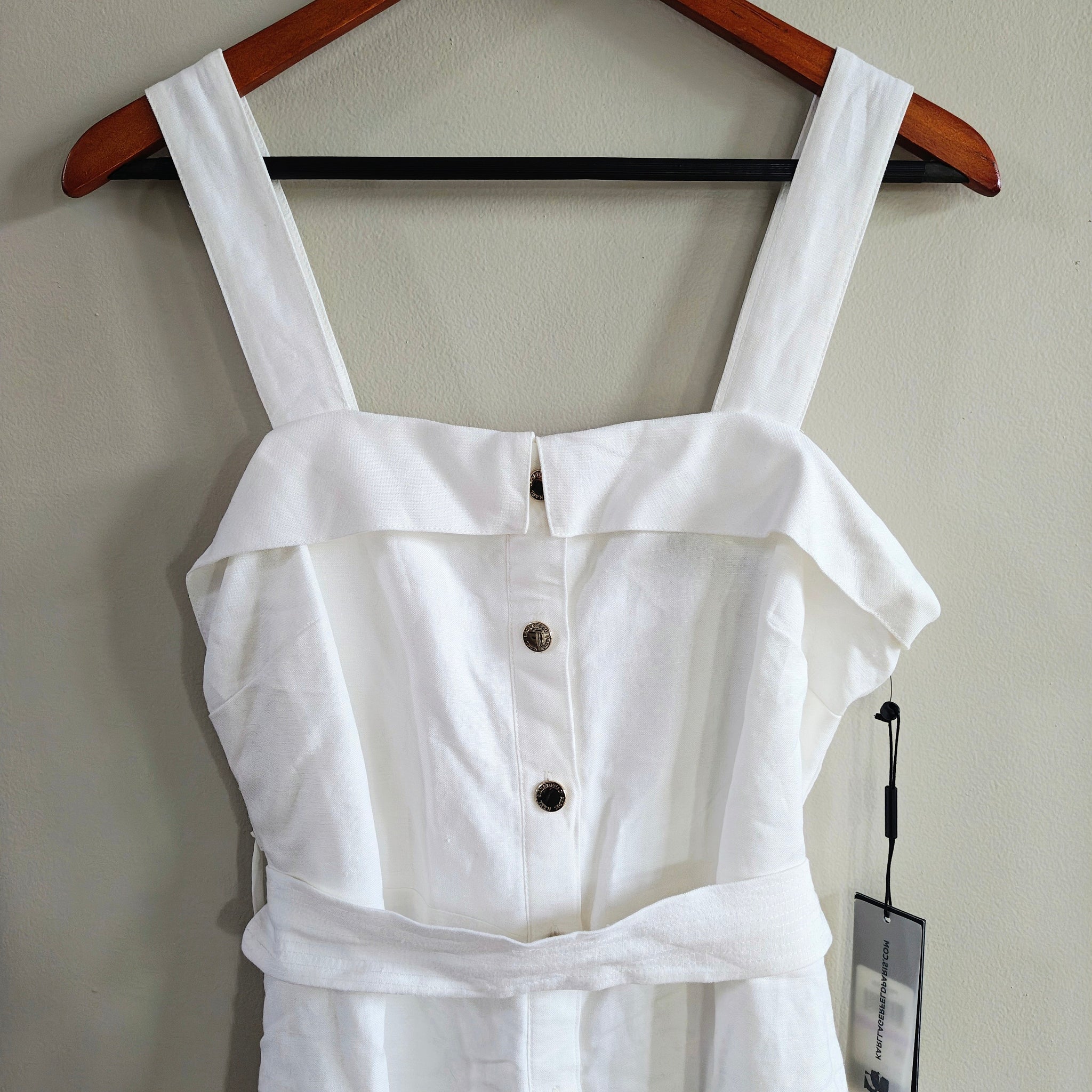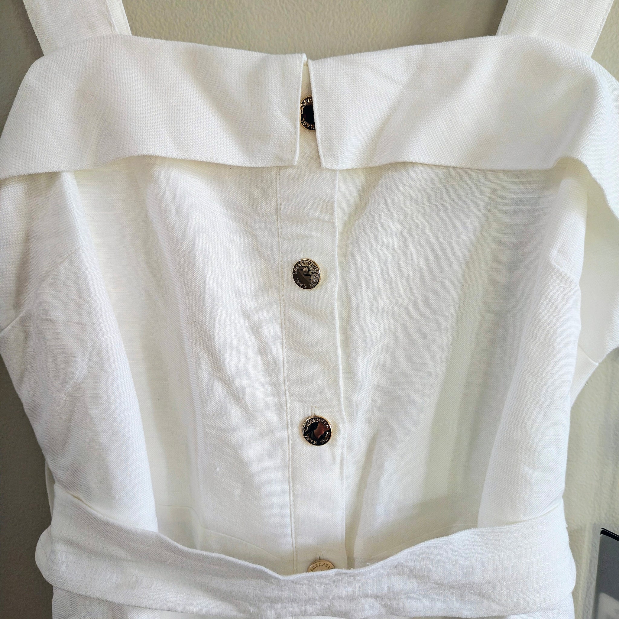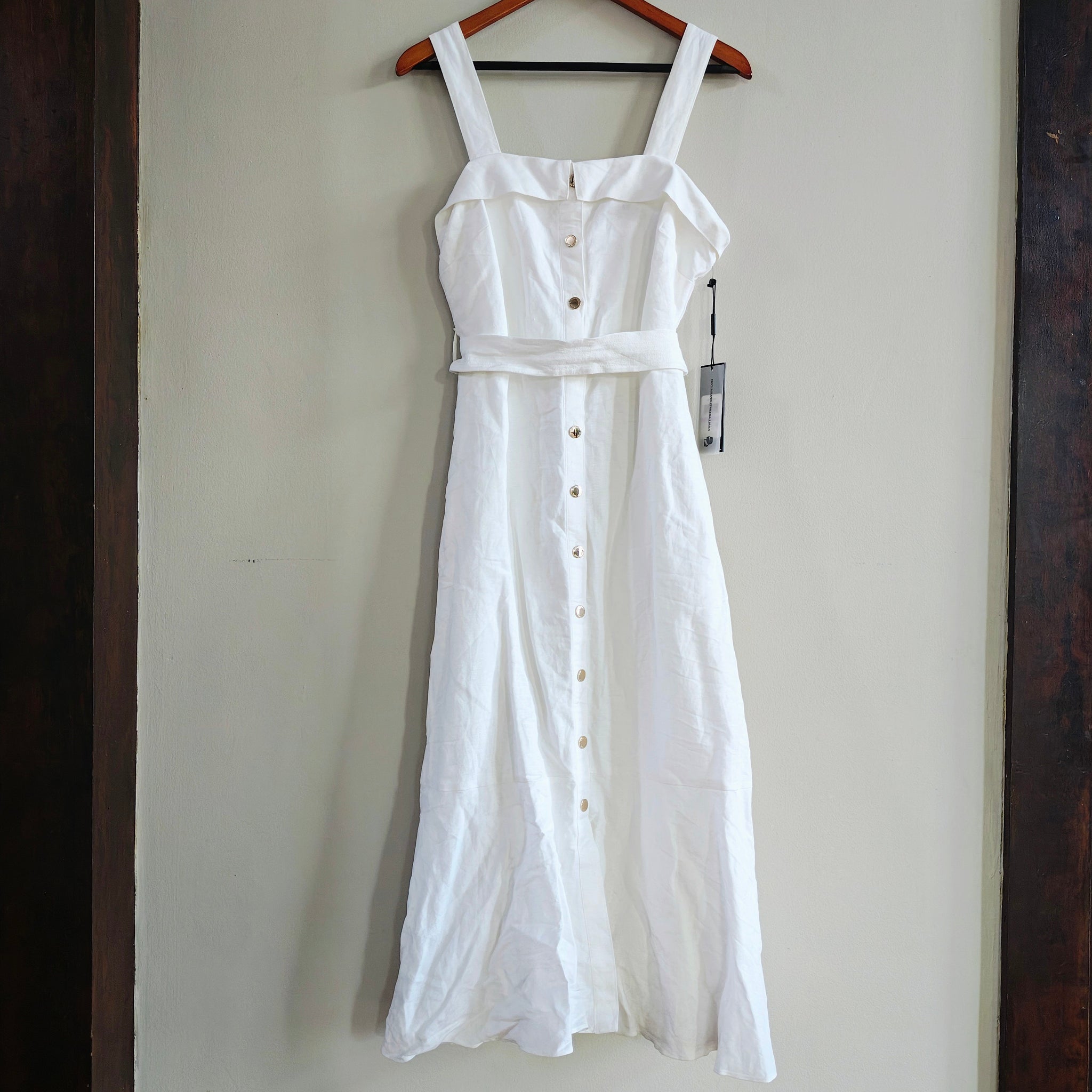 Classic, feminine midi dress in a crisp white finish, made of a structured linen-blend material.