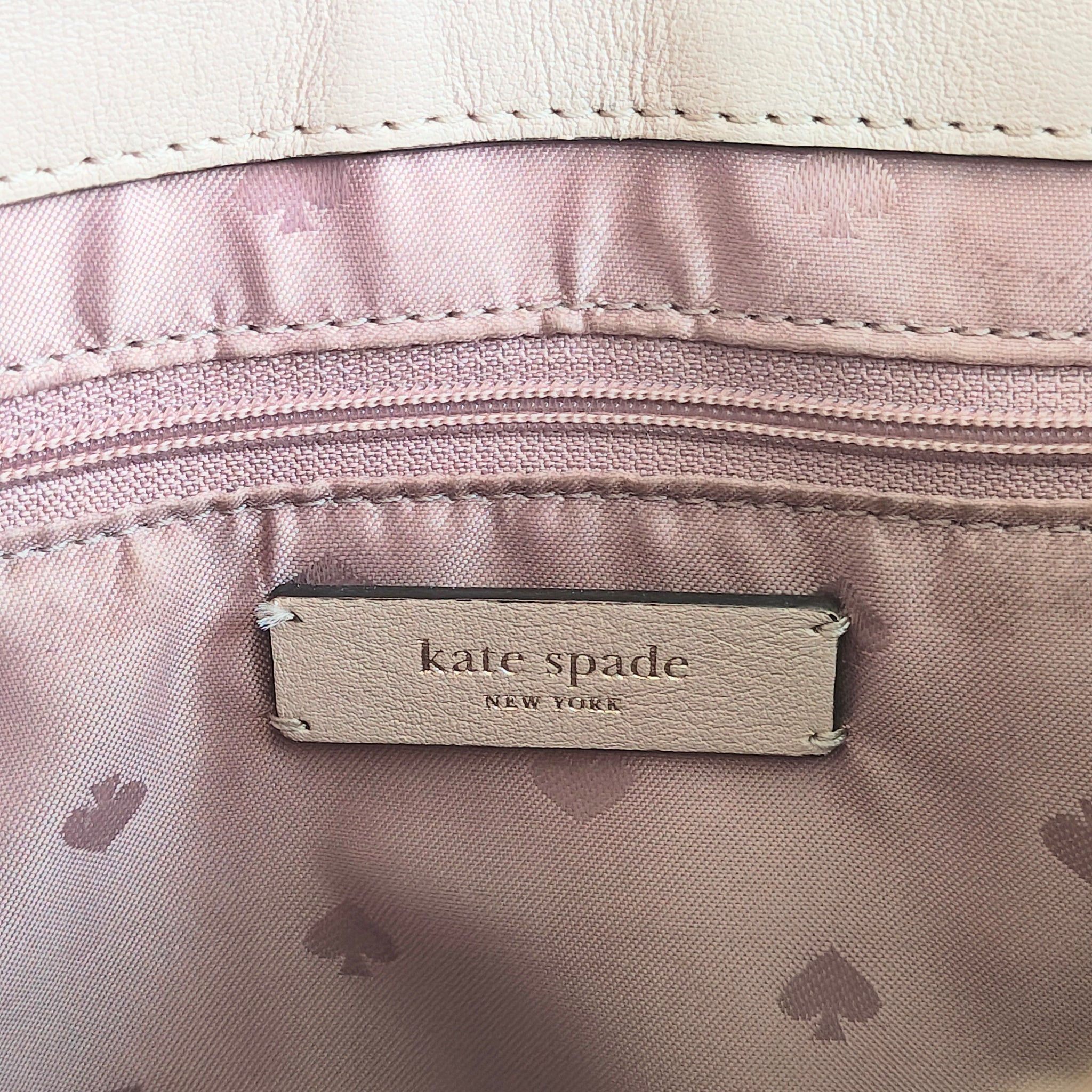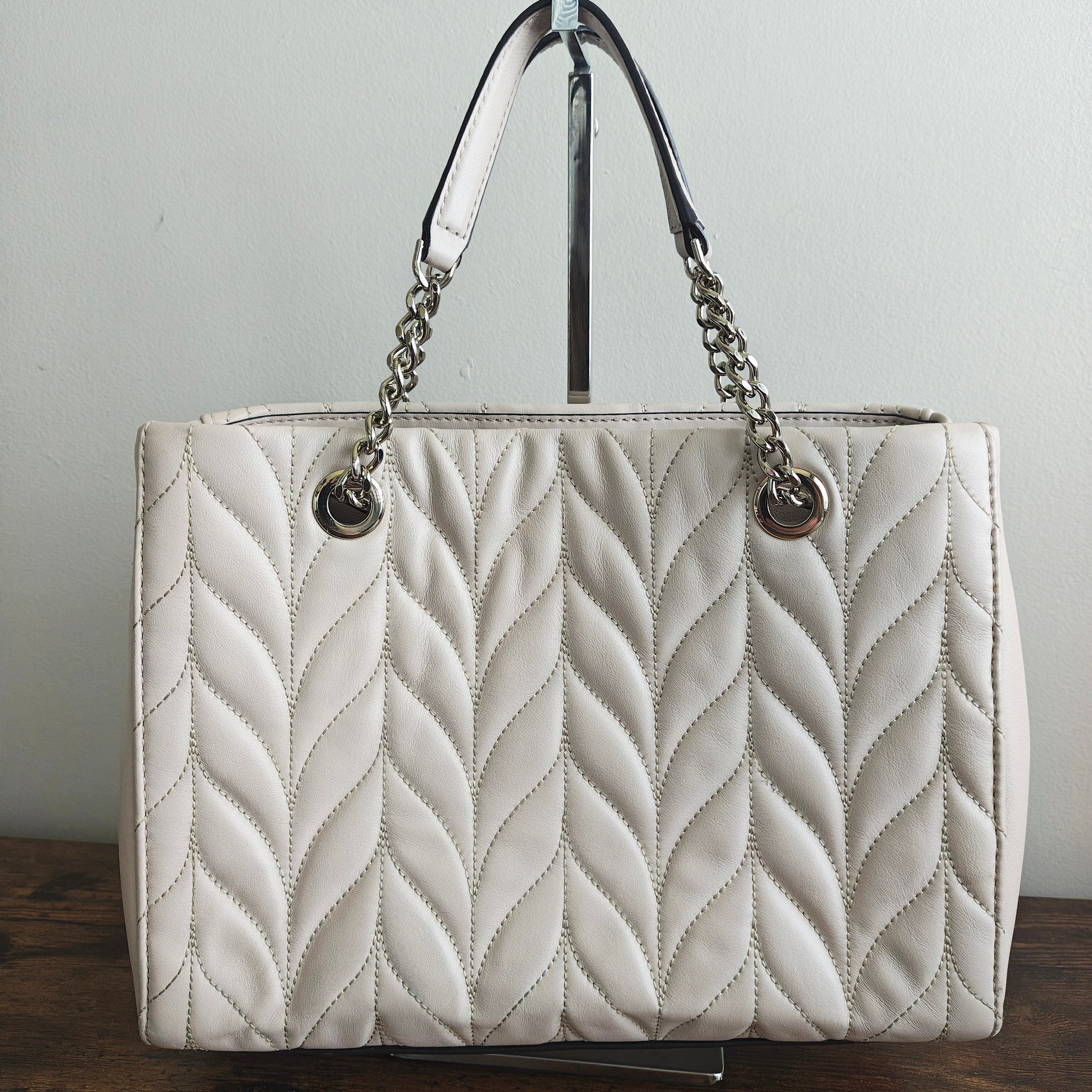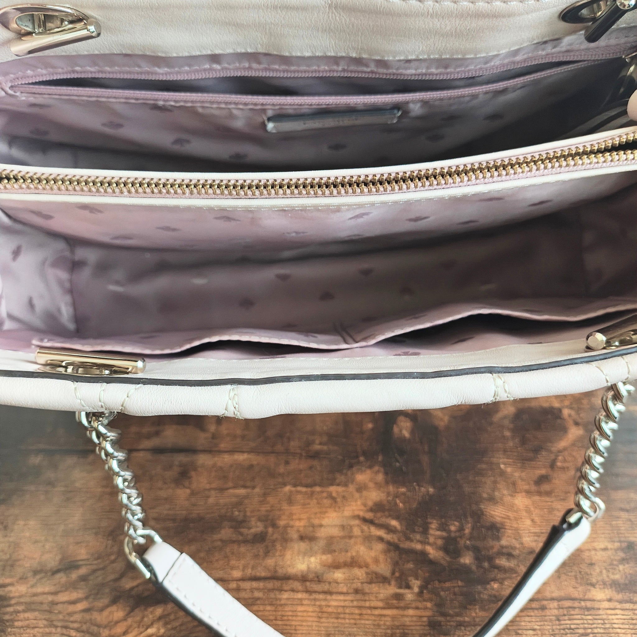 Kate Spade Briar Lane Quilted Meena tote. It is crafted from smooth cow leather with a distinctive chevron or V-shaped quilted pattern.