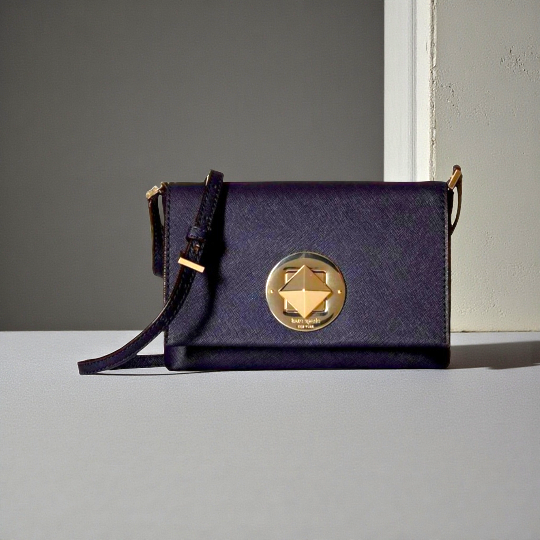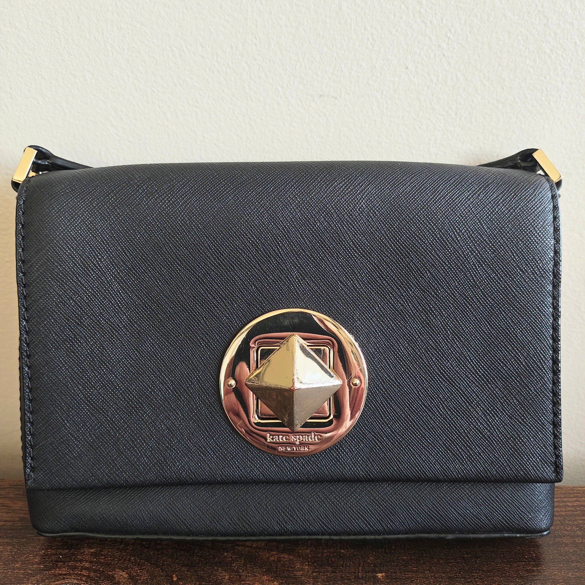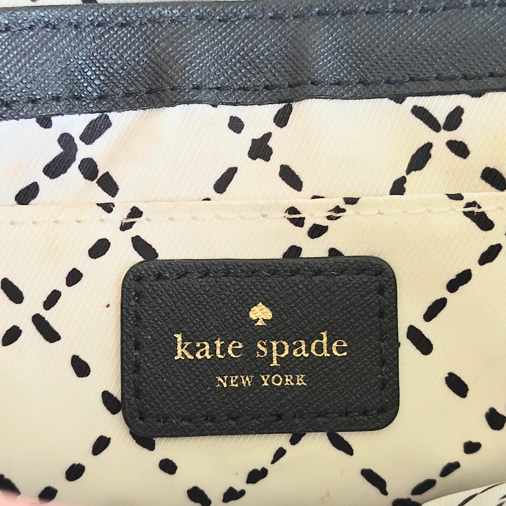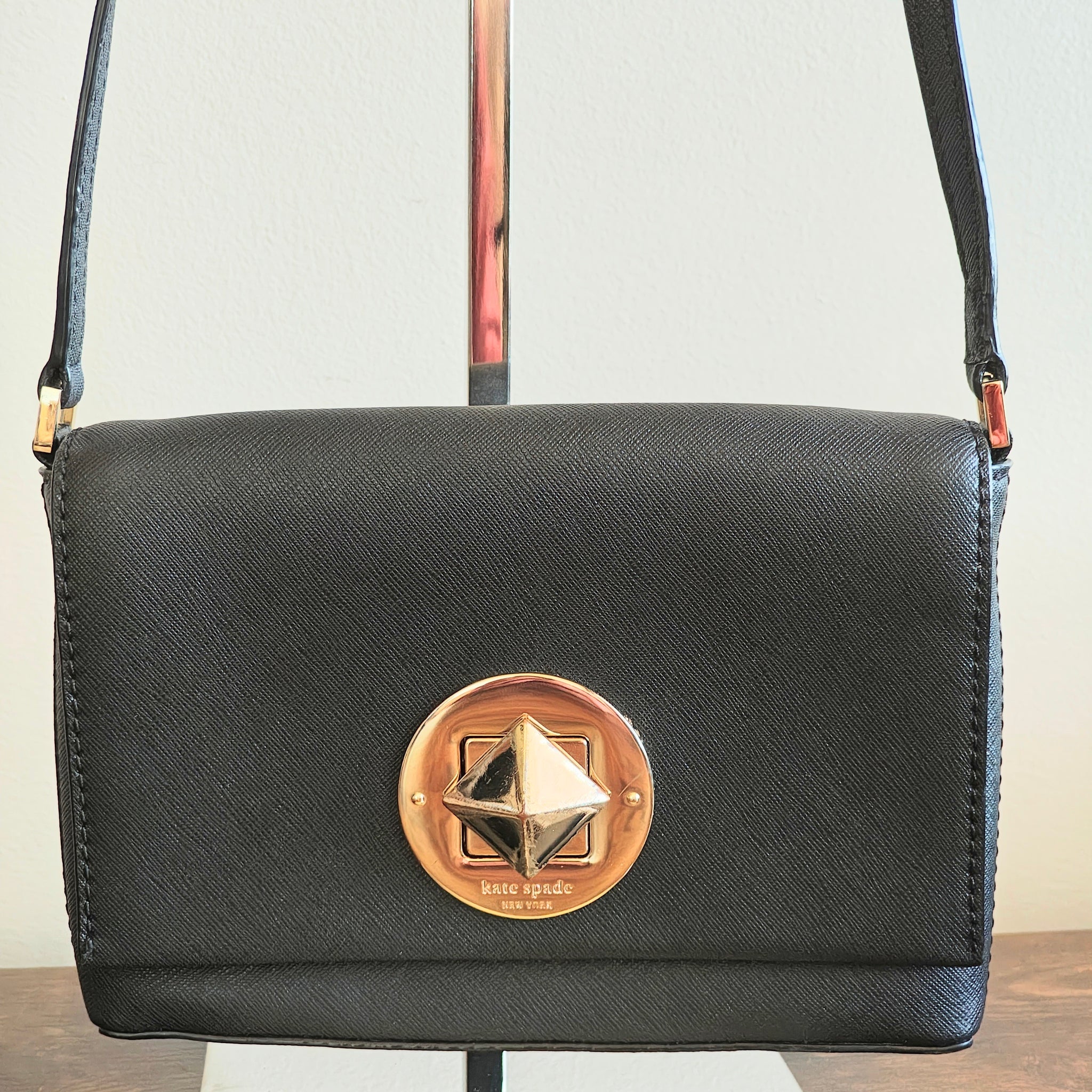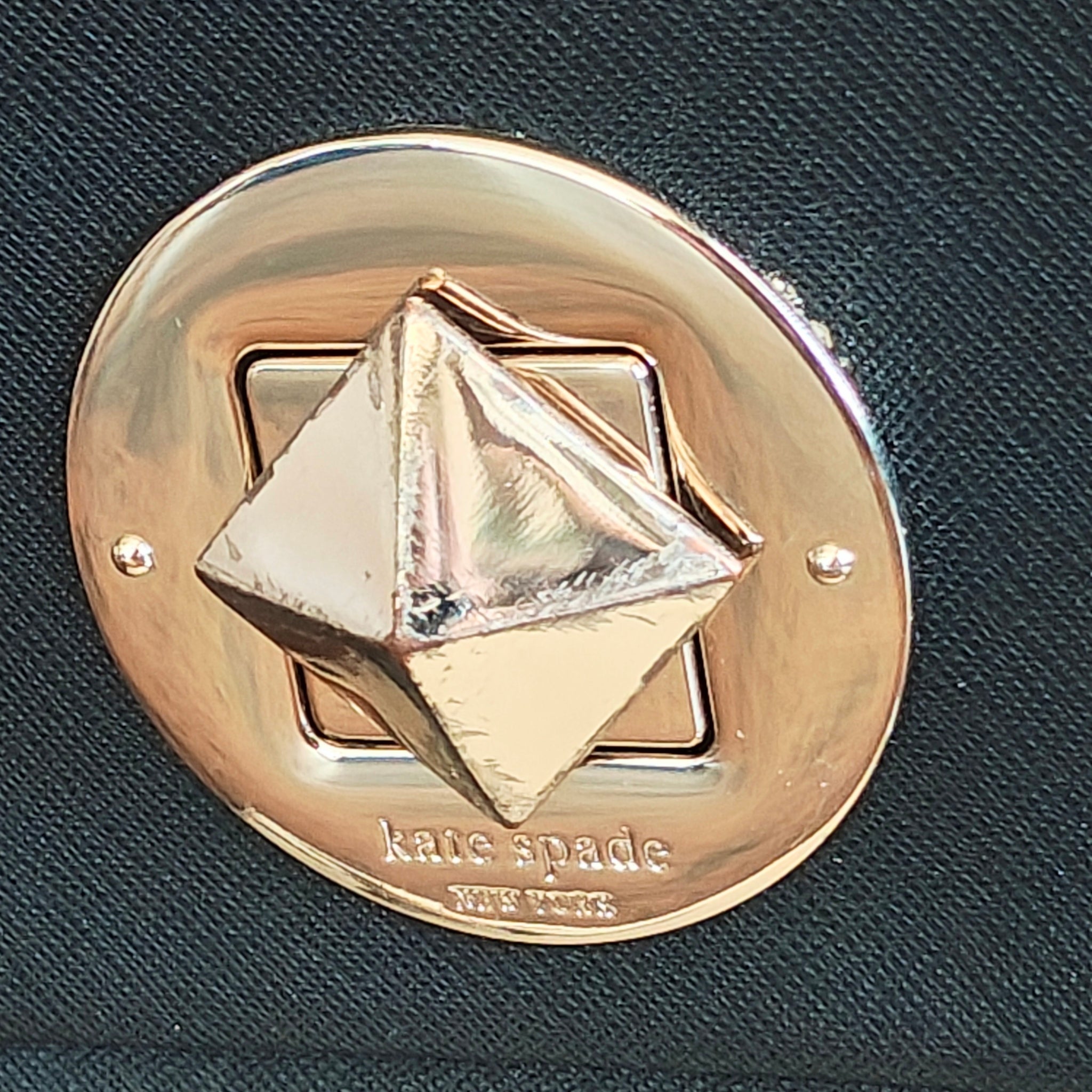 Closure: A signature turn-lock mechanism engraved with "kate spade new york".
