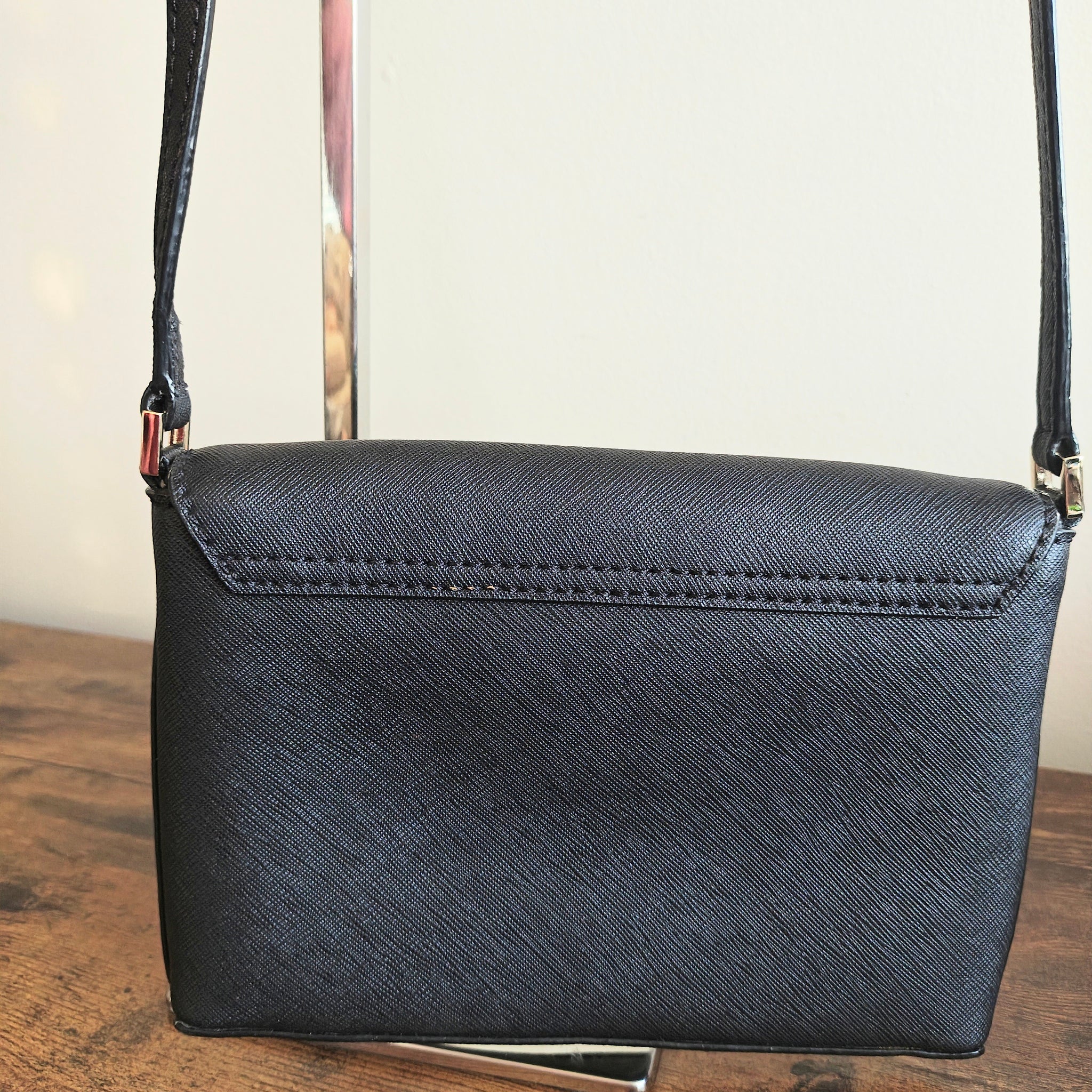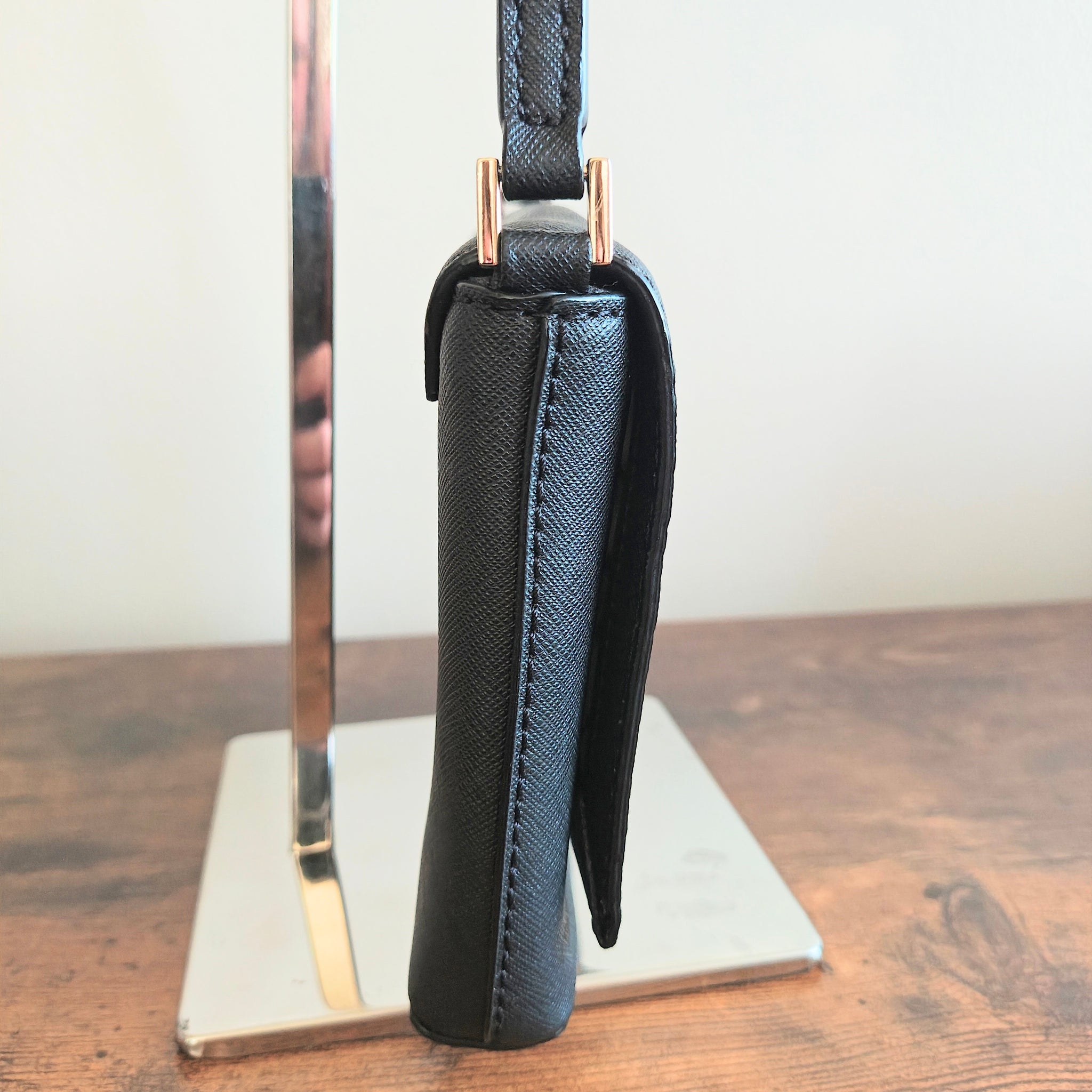 Strap: An adjustable leather crossbody strap, allowing it to be worn hands-free or carried as a clutch.