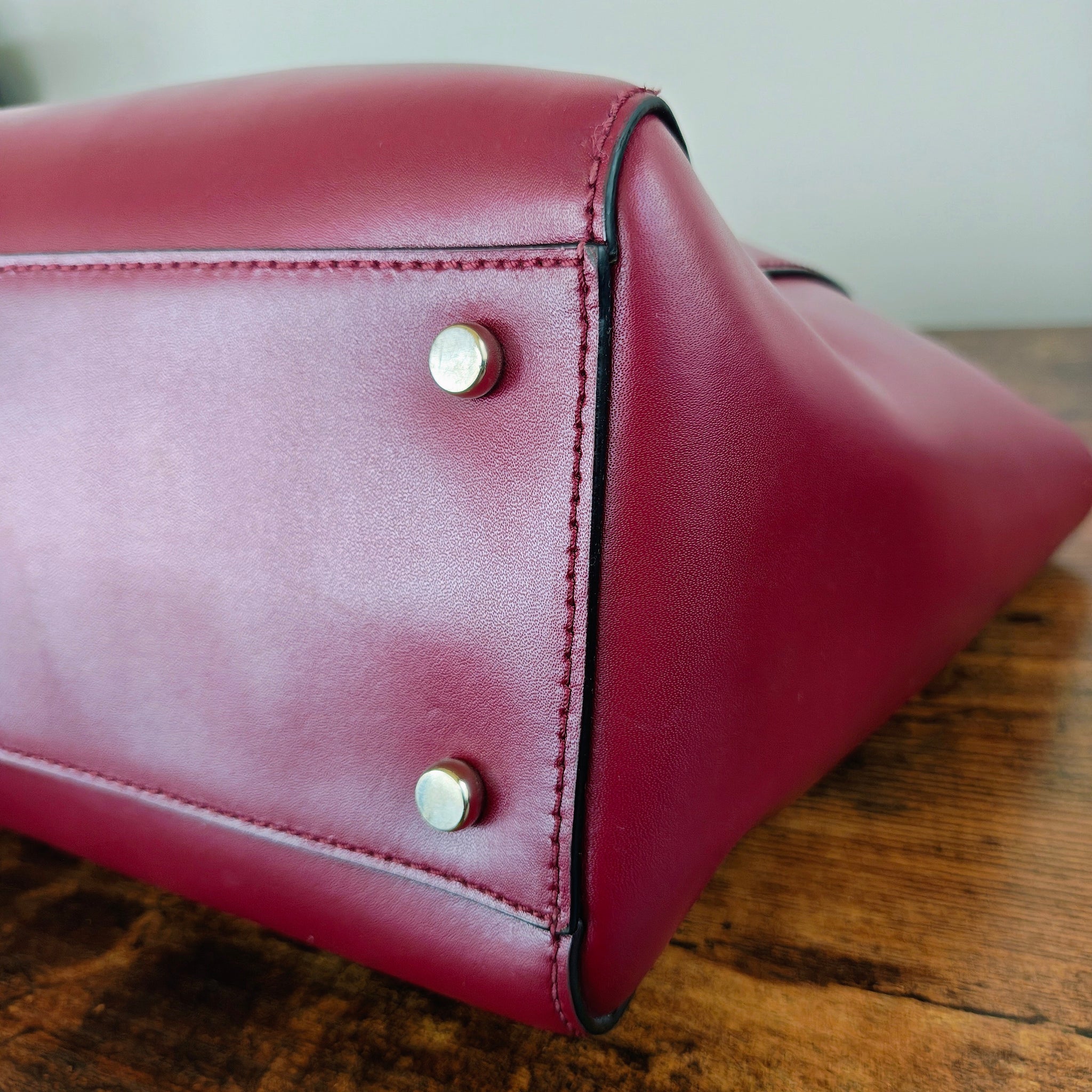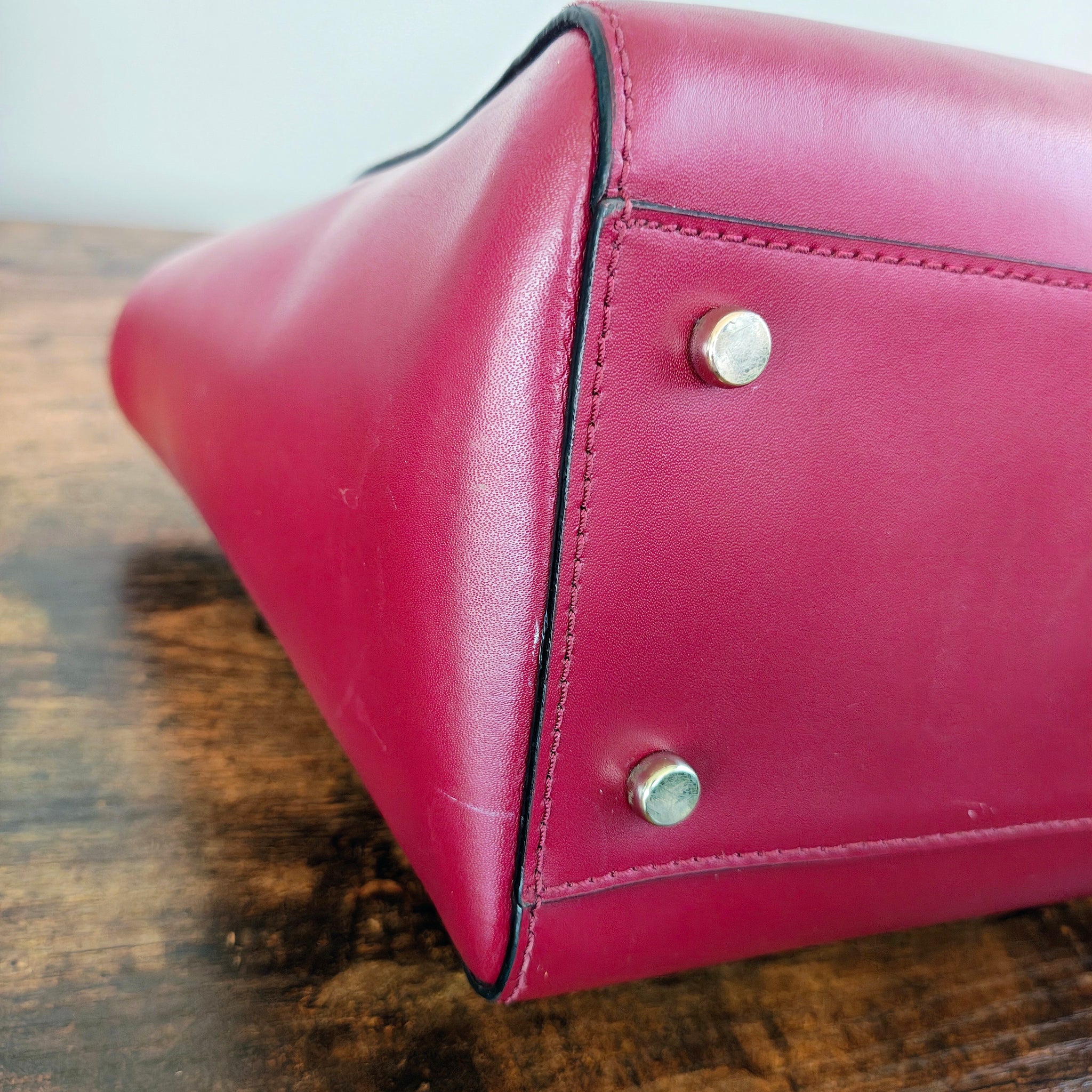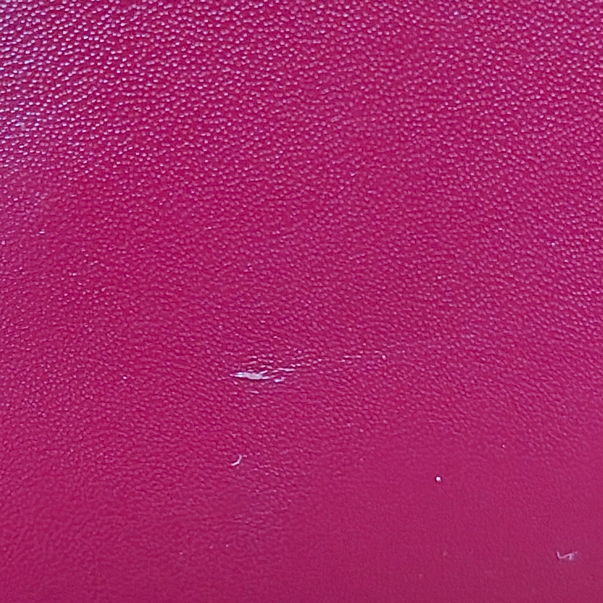 This bag is pre-owned. Several small spots, shown in the photos, but not all that noticeable. Interior has a few minor stains, leather shows no notable wear, hardware is bright with minimal scratching. Please see photos for exact condition.