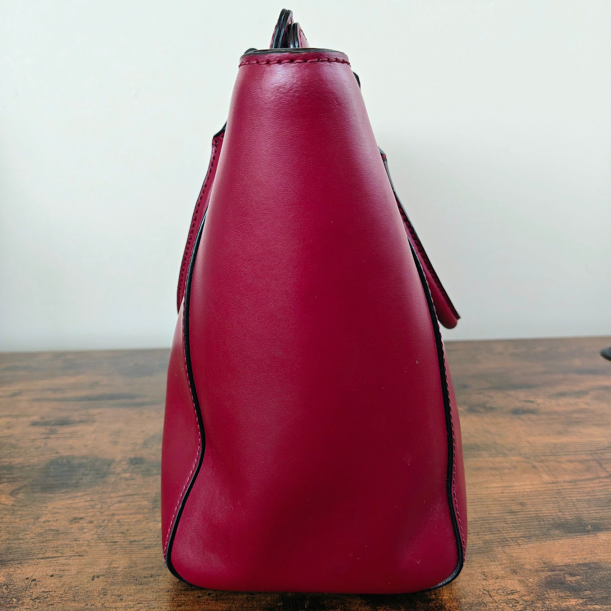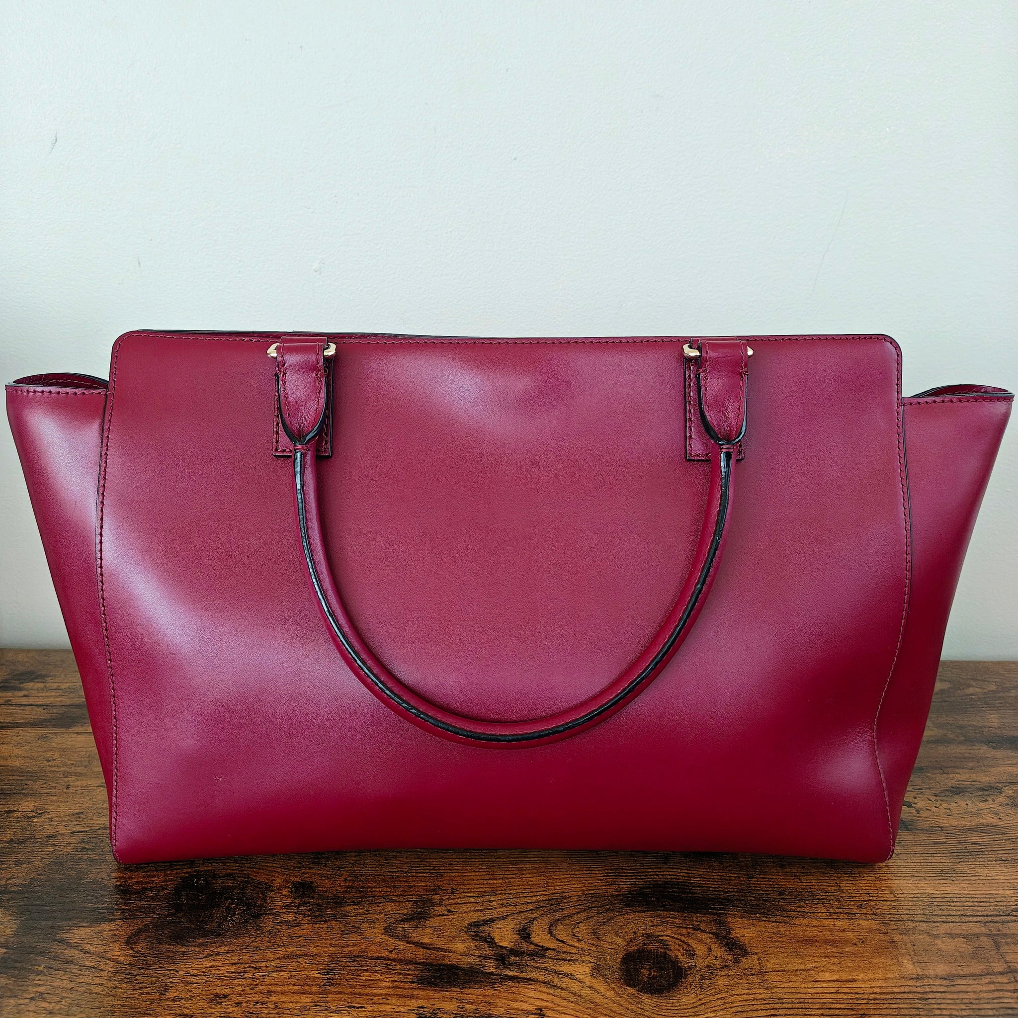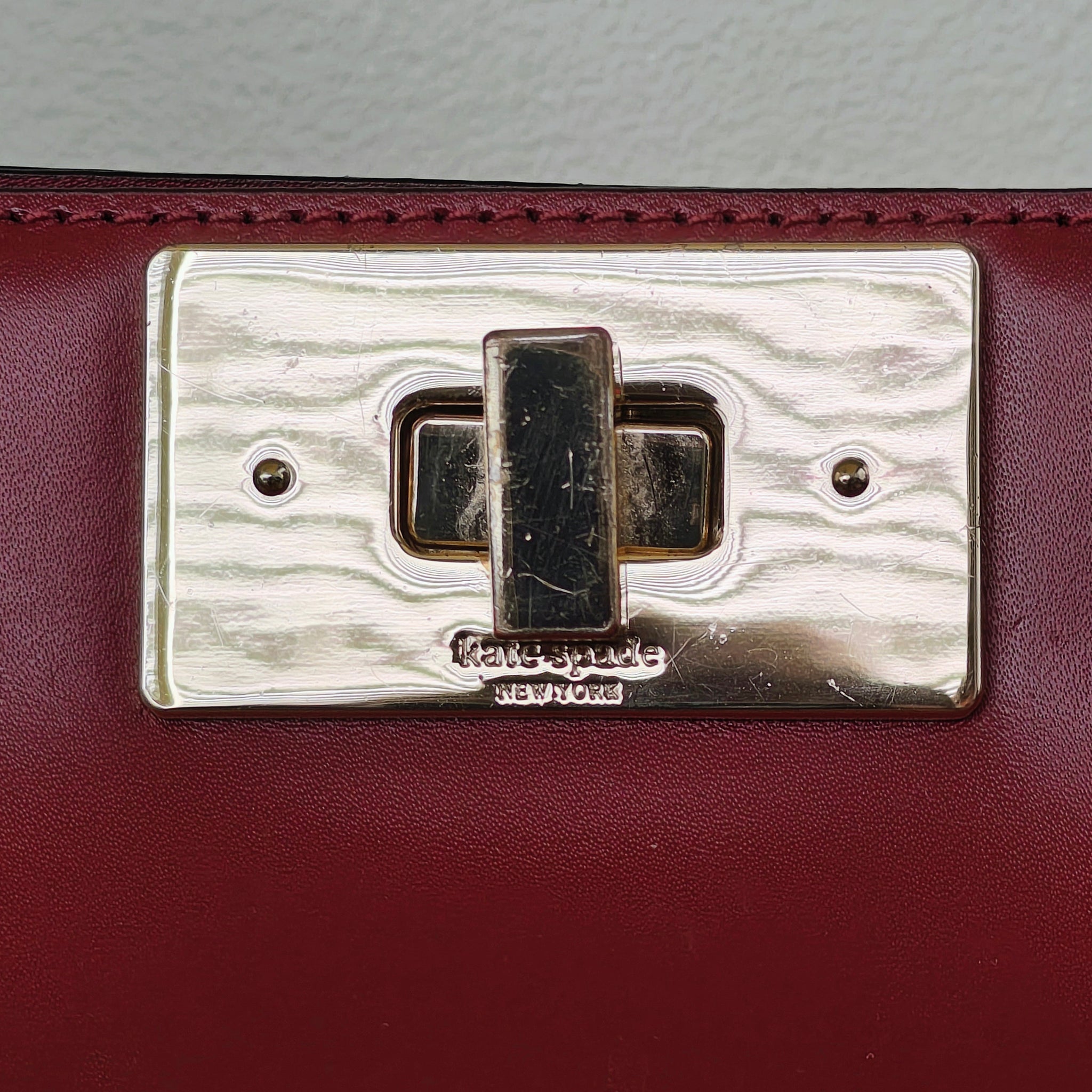 Kate Spade Orchard Valley Smooth Kelsey satchel in a deep red or burgundy color. It features a structured, smooth leather design with a top turnlock closure and gold-toned hardware.