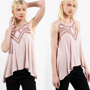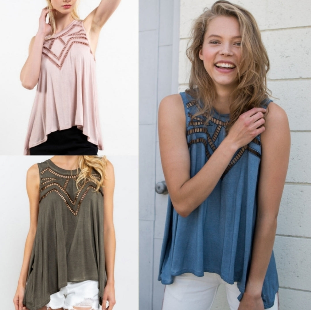 This Lace Inlay Flyaway Tank is comfortable and stylish, thanks to its soft rayon spandex jersey material and a flyaway back. Its intricate lace inlay adds a delicate detail while its washed finish provides a soft, broken-in look.