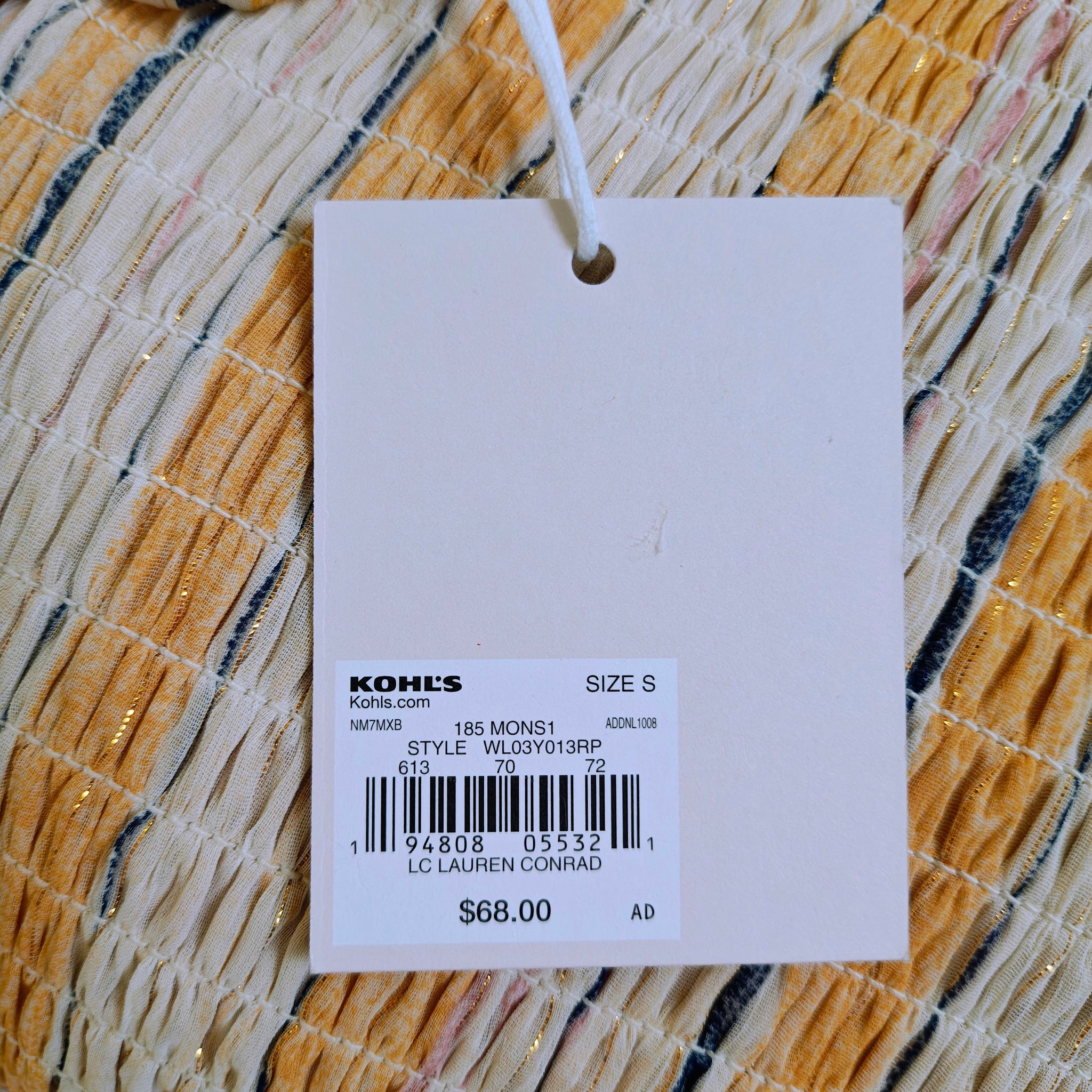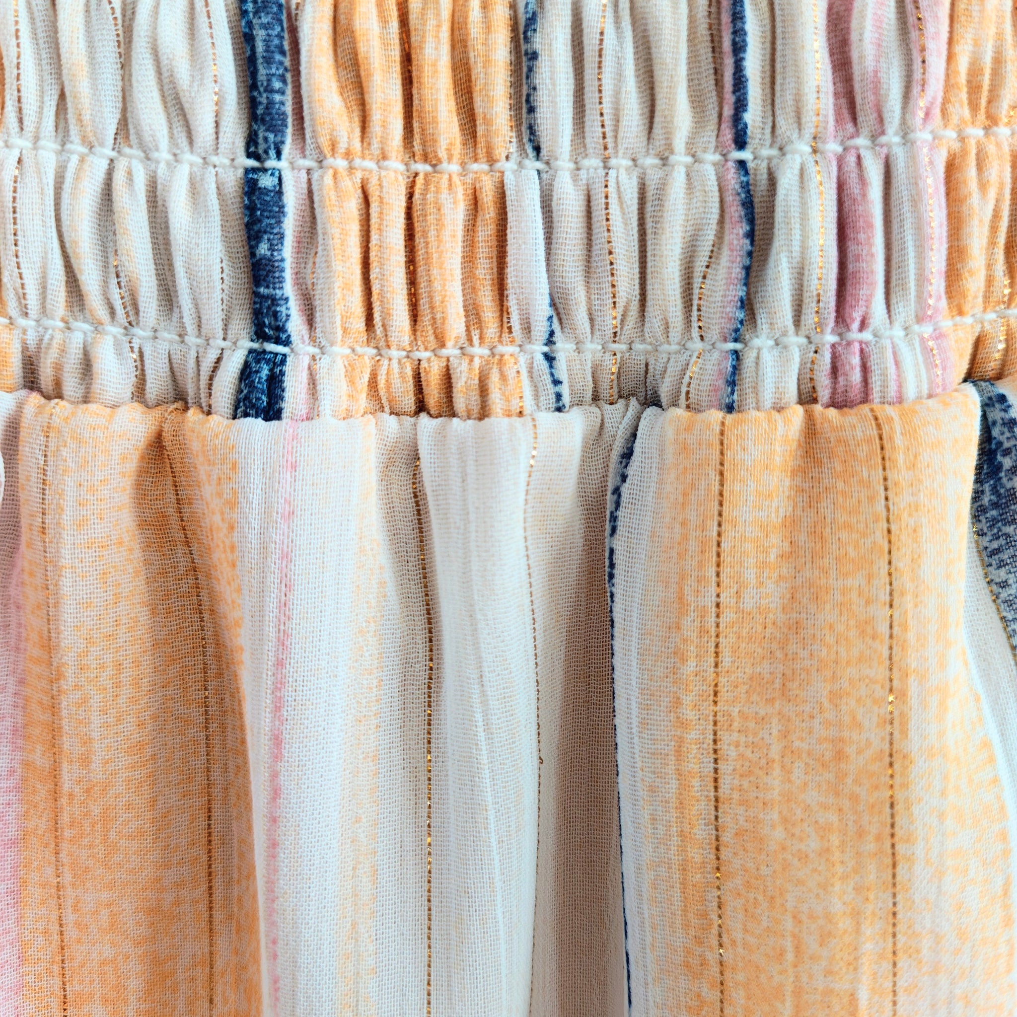 Color/Pattern: A "Creamsicle" inspired orange and white vertical stripe pattern, often accented with thin metallic or dark blue stripes.