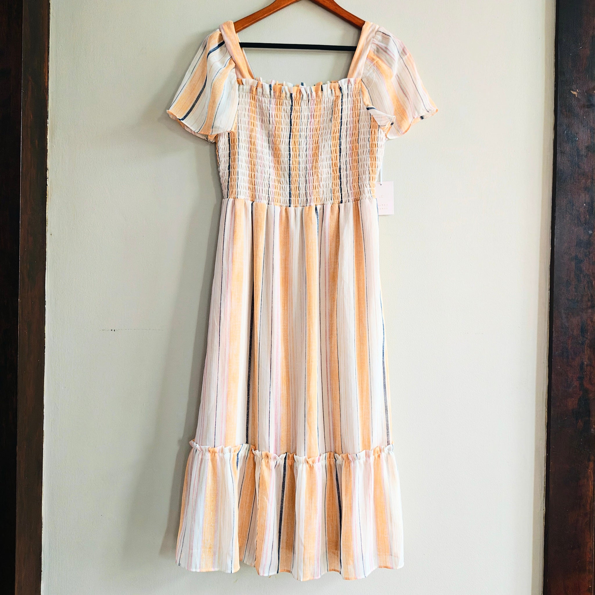 Skirt: The dress has a midi length with a ruffled, tiered hem.