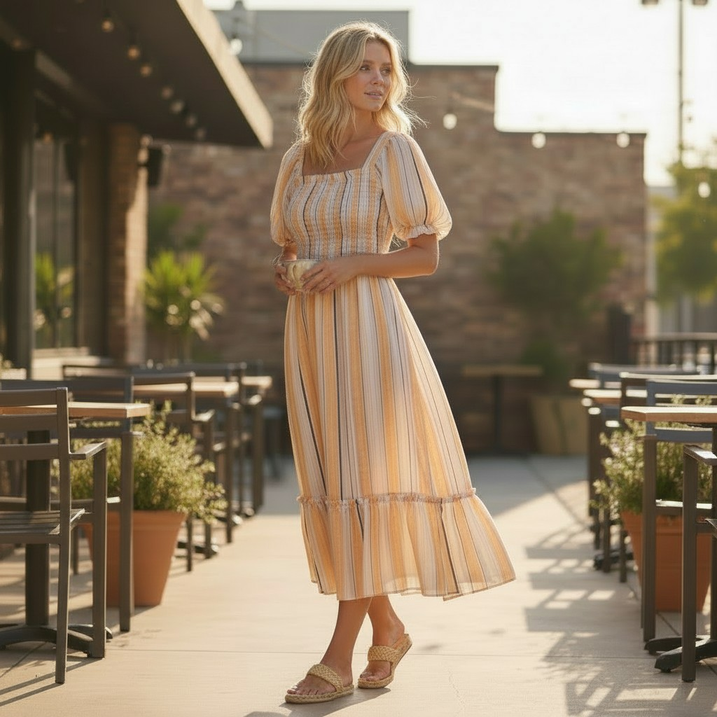 Design: Features a square neck, smocked bodice for a flexible fit, and short flutter sleeves.