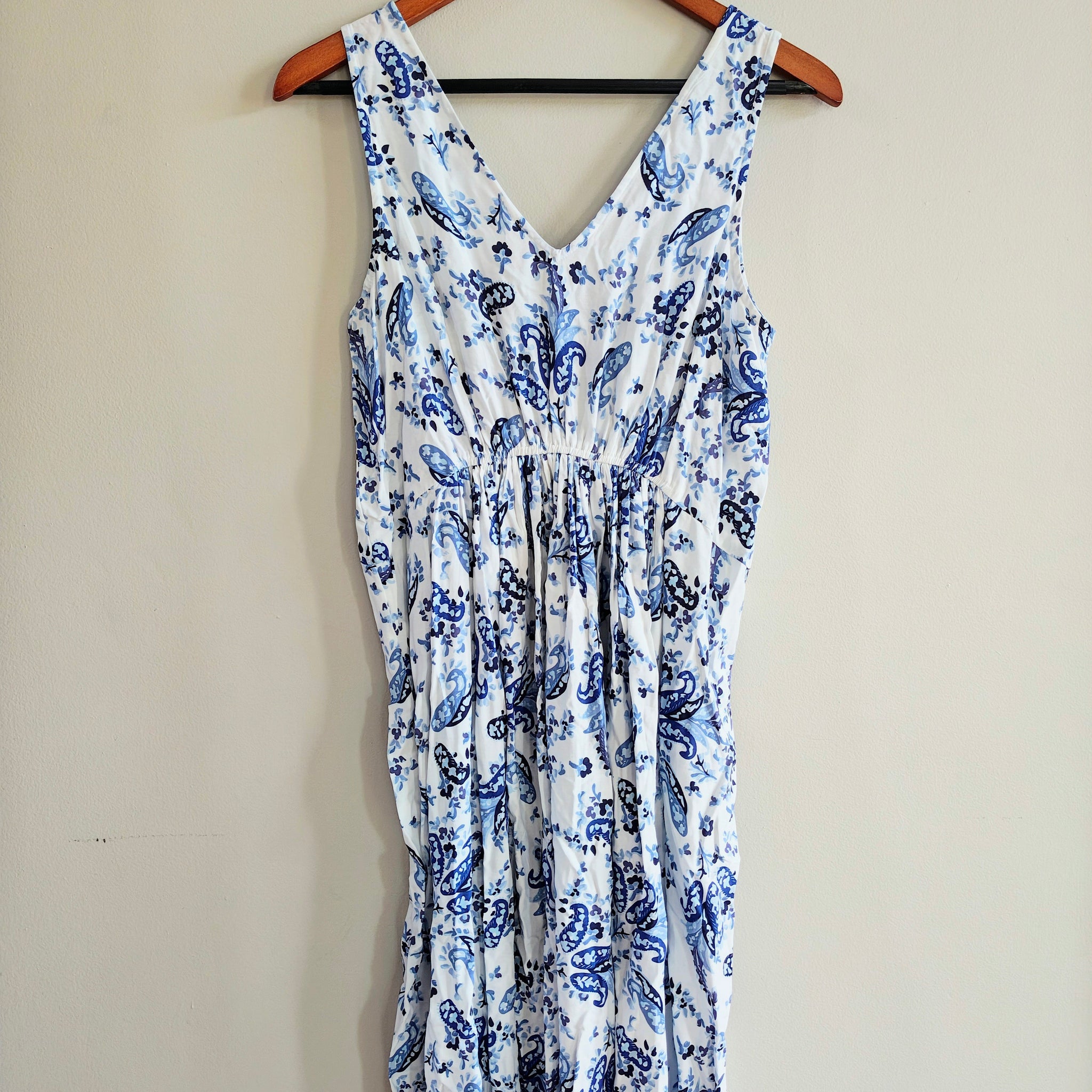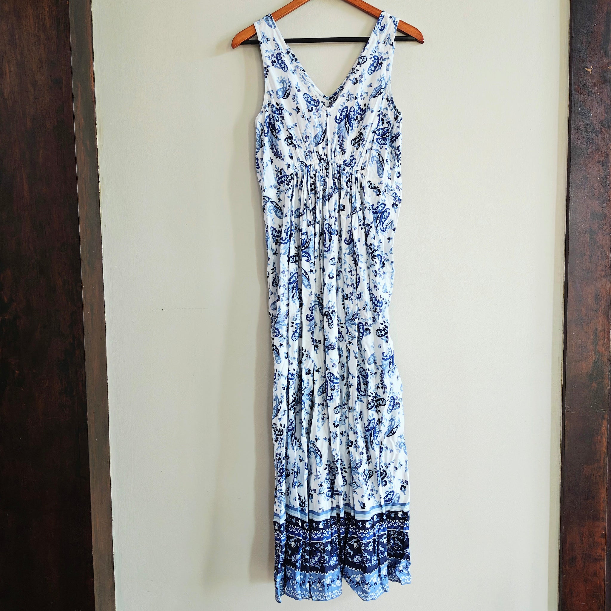 Lucky Brand Strappy V-Neck Gathered Floral Maxi Dress features a vibrant blue and white paisley-inspired "cottagecore" floral print.