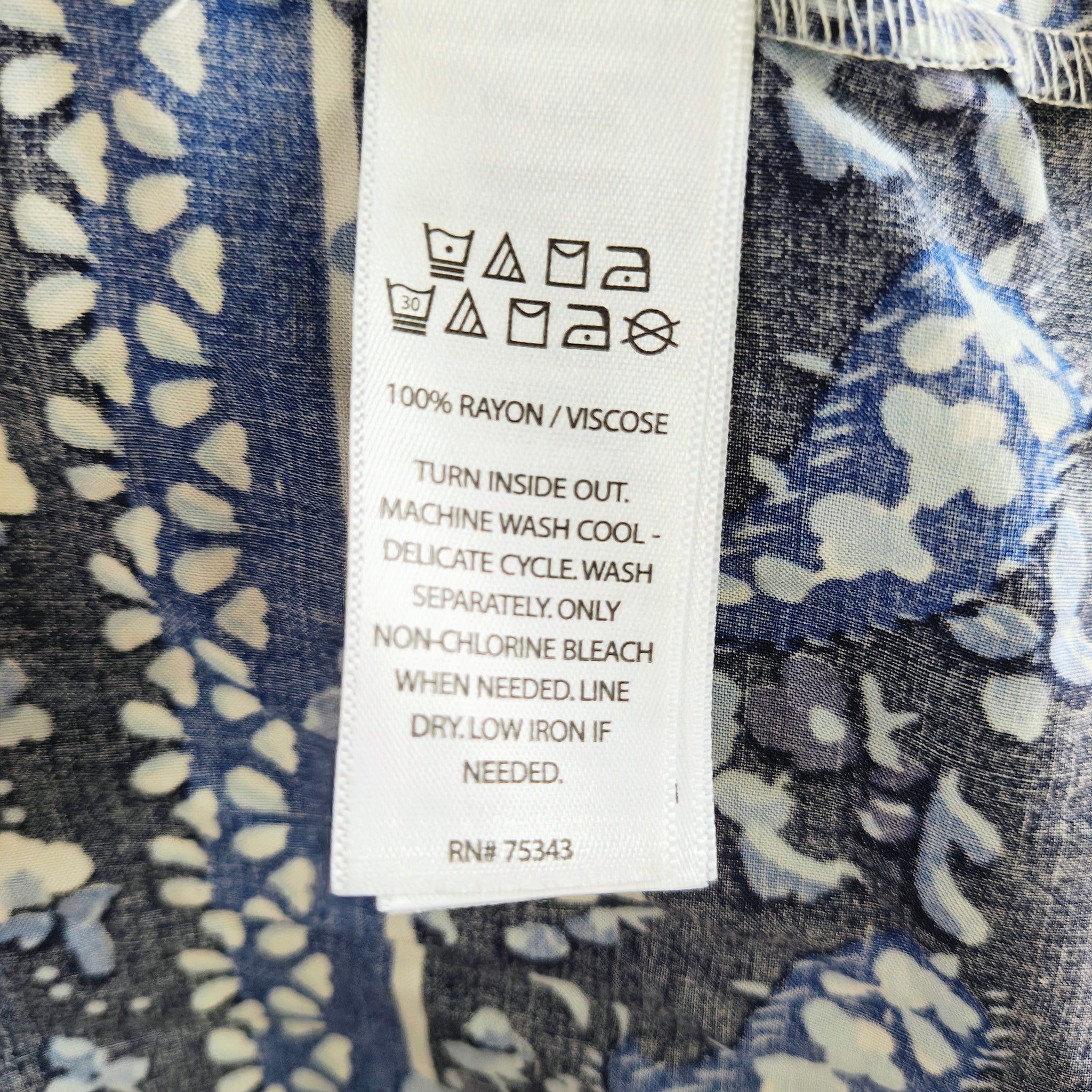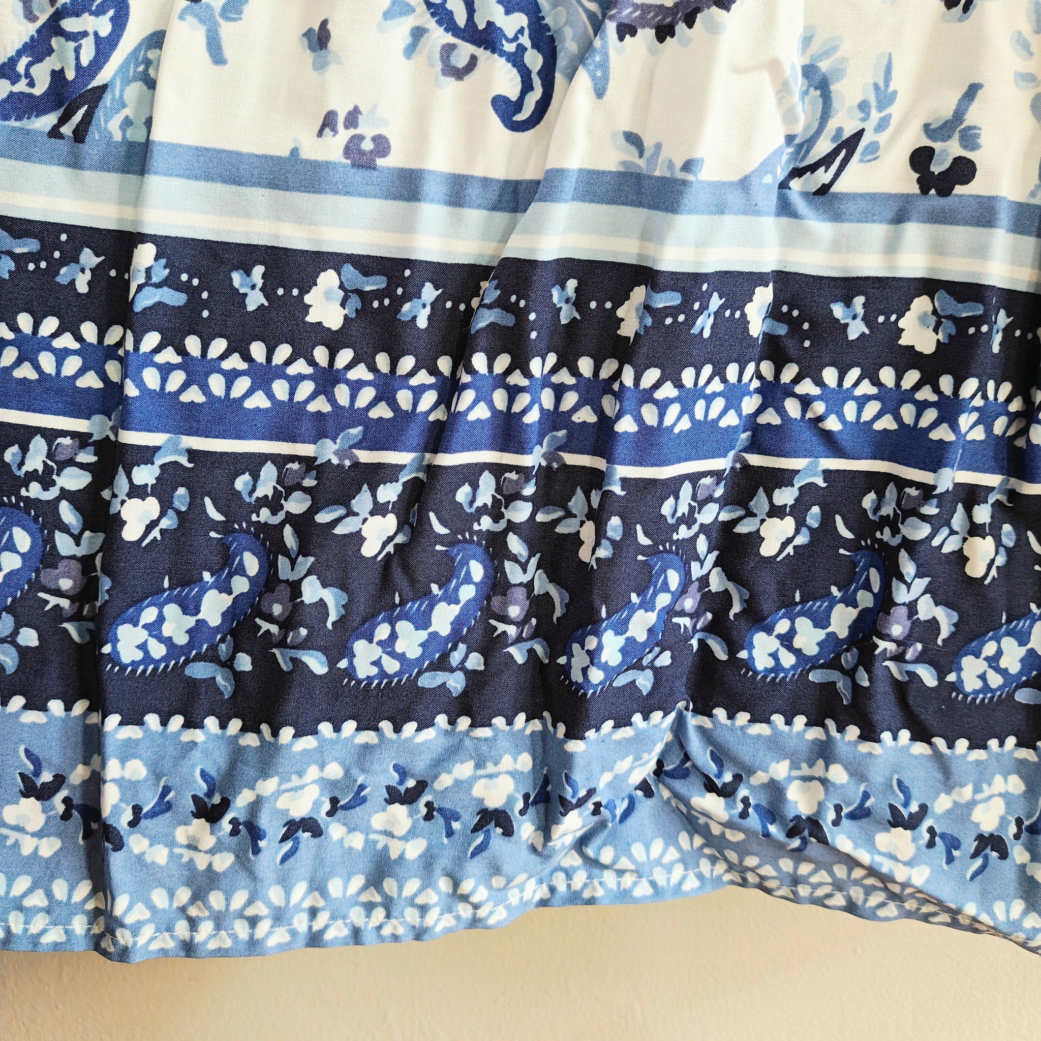 Hem: The bottom features a decorative wide border print with intricate geometric and floral patterns in varying shades of blue.