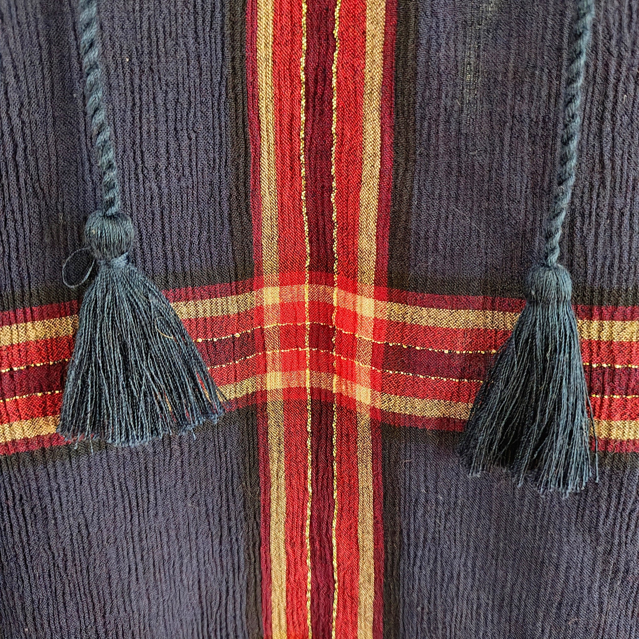 Color: Navy blue, red, with metallic thread accents