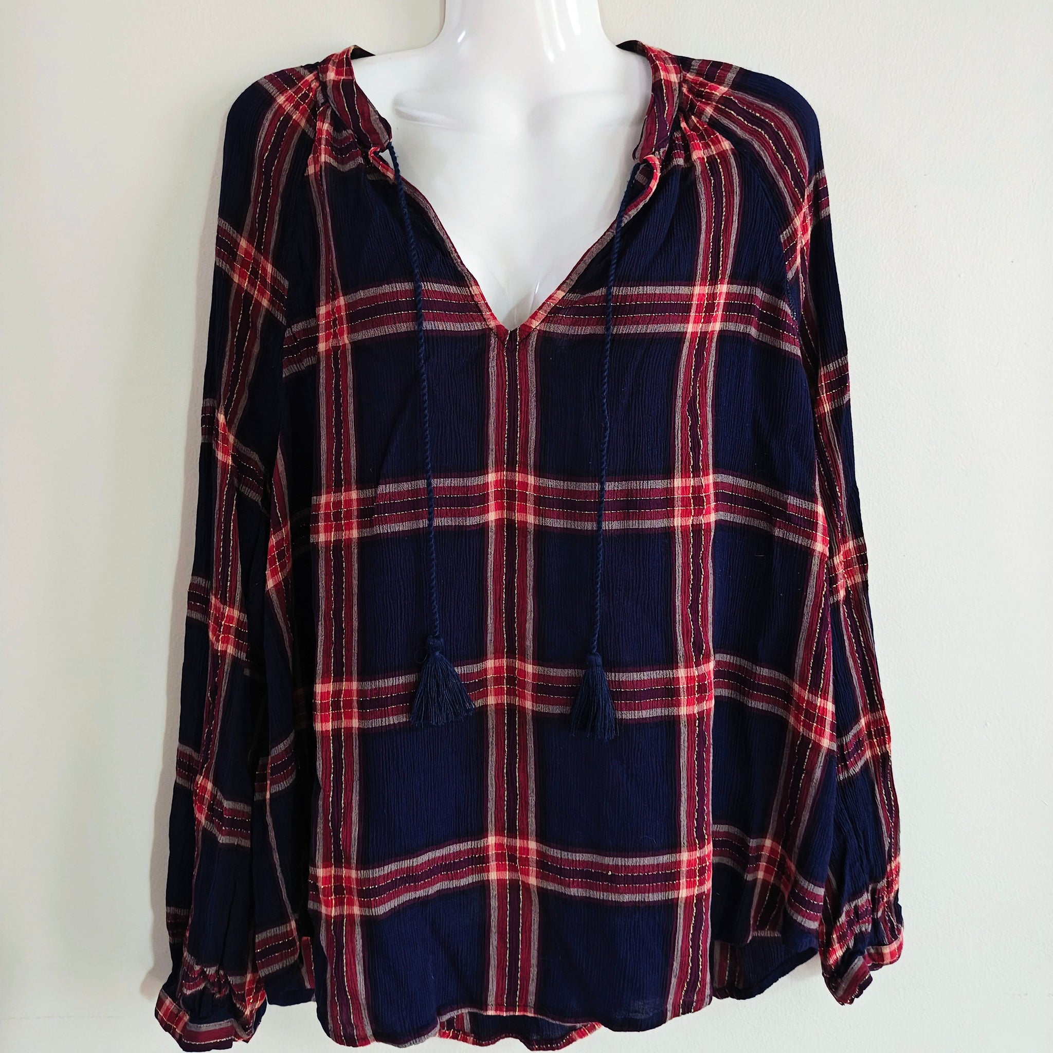 Features: V-neck with tassel tie closure, long sleeves with elastic cuffs, lightweight fabric