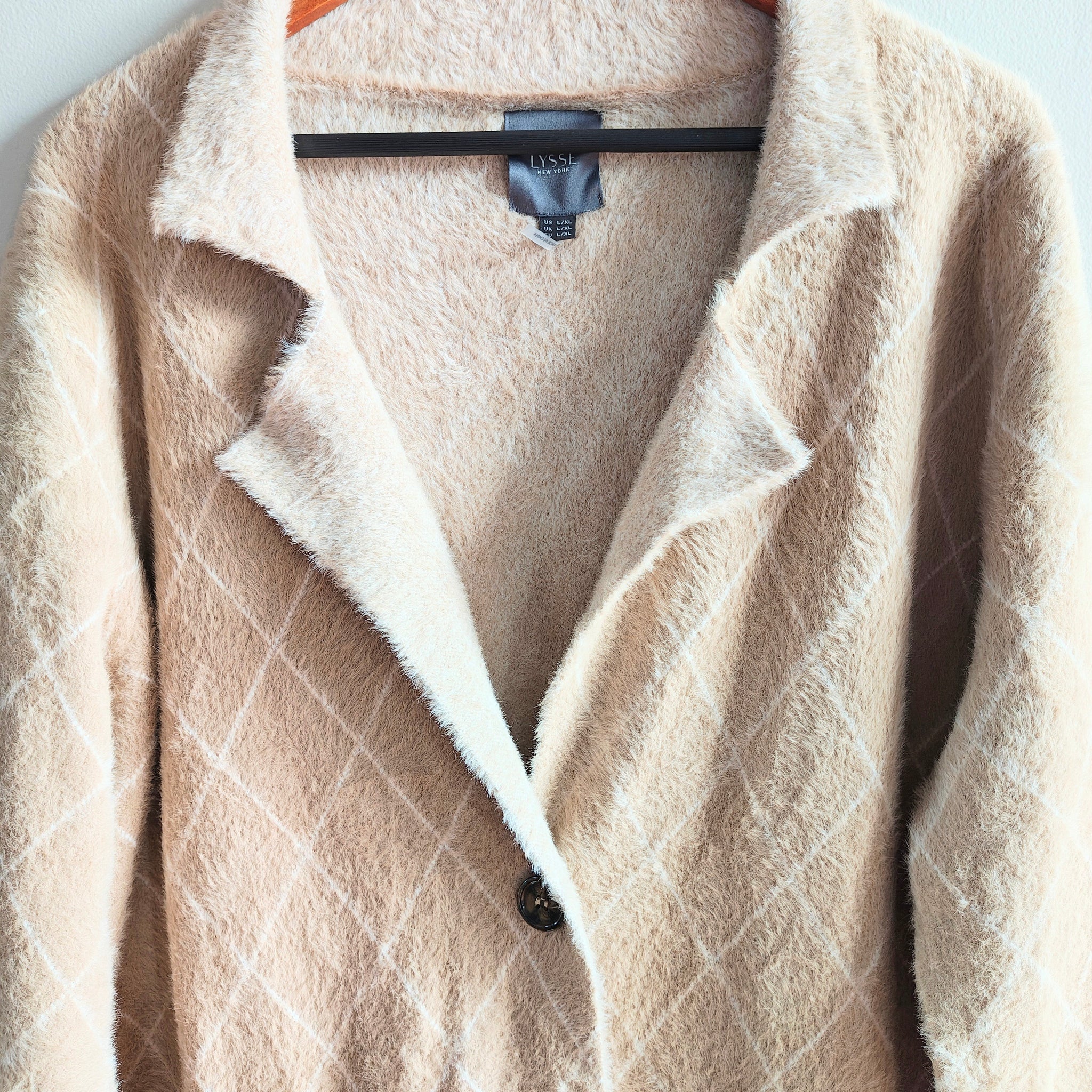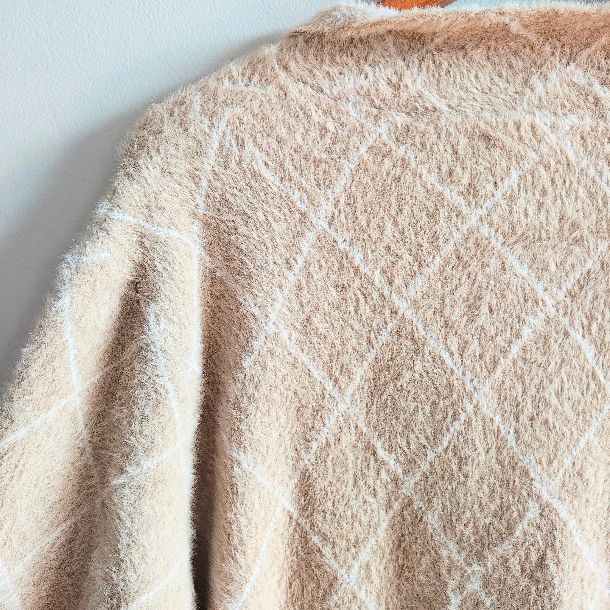 Long, fuzzy coat with a distinctive beige diamond pattern. It is often described as a faux mink duster coat. The coat features a collared, two-button design with large patch pockets, ideal for warmth and layering during cooler months.