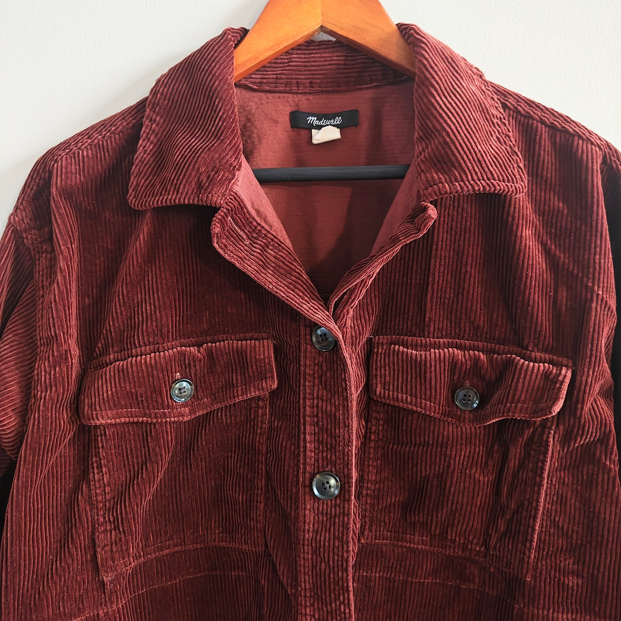 Madewell Corduroy Yorkway Shacket in a rich red or burgundy color, often described as "Stained Mahogany". This piece is popular as a versatile layering item made of soft, stretch-cotton corduroy.