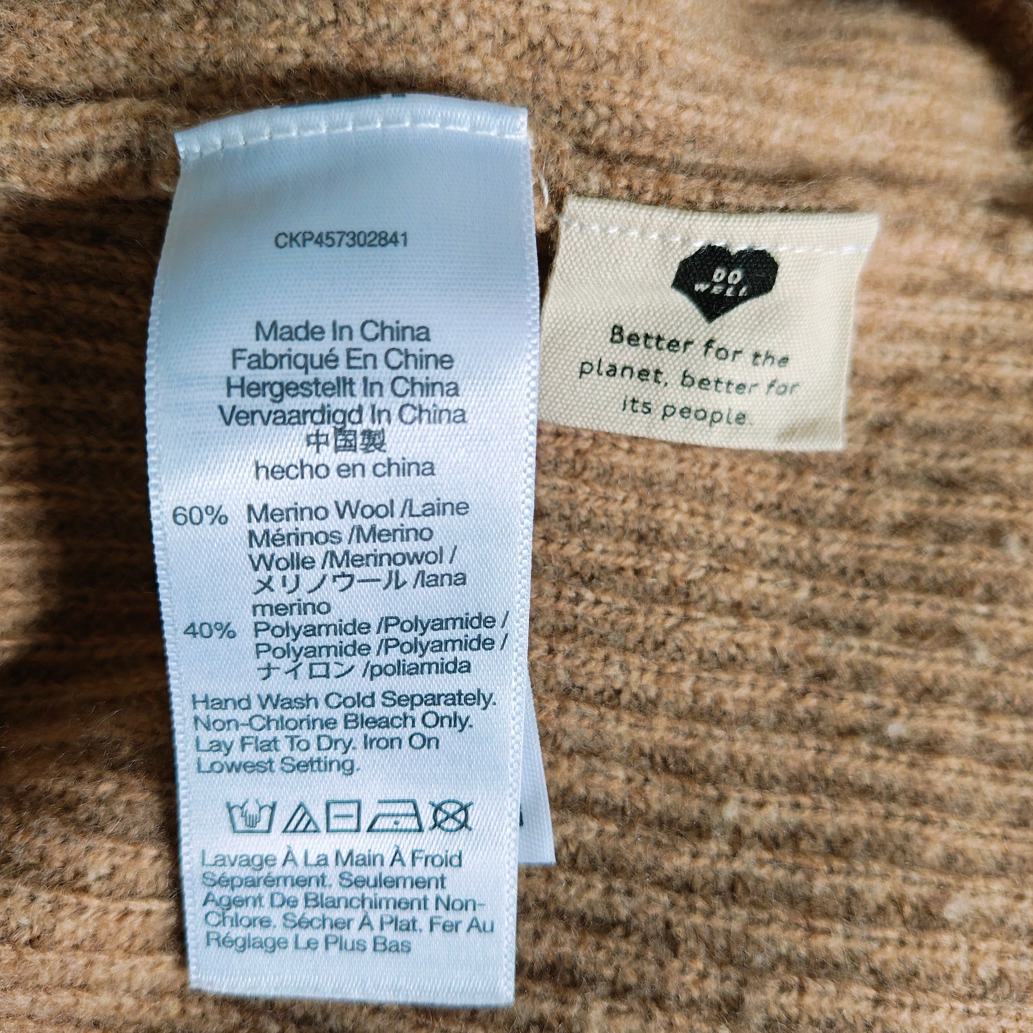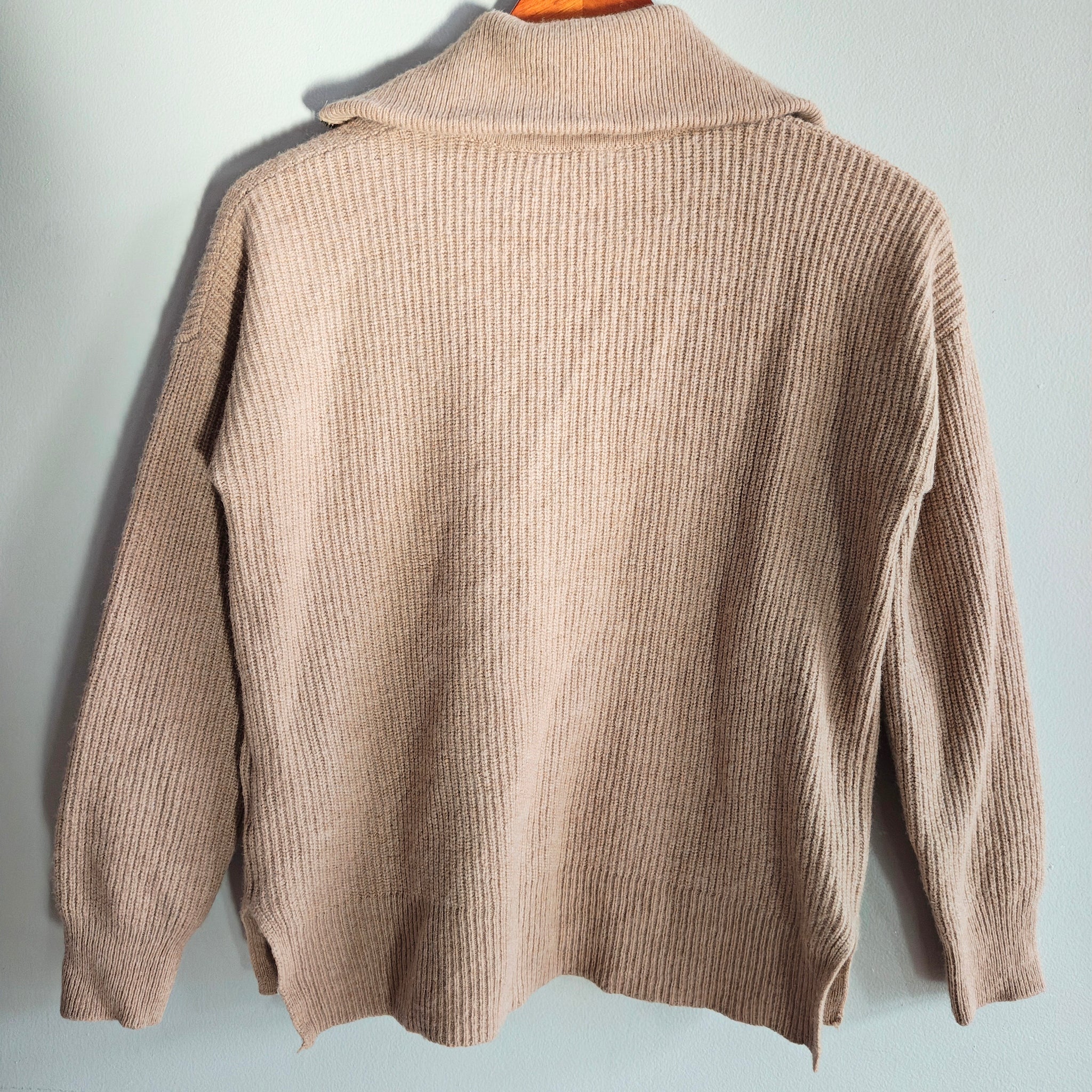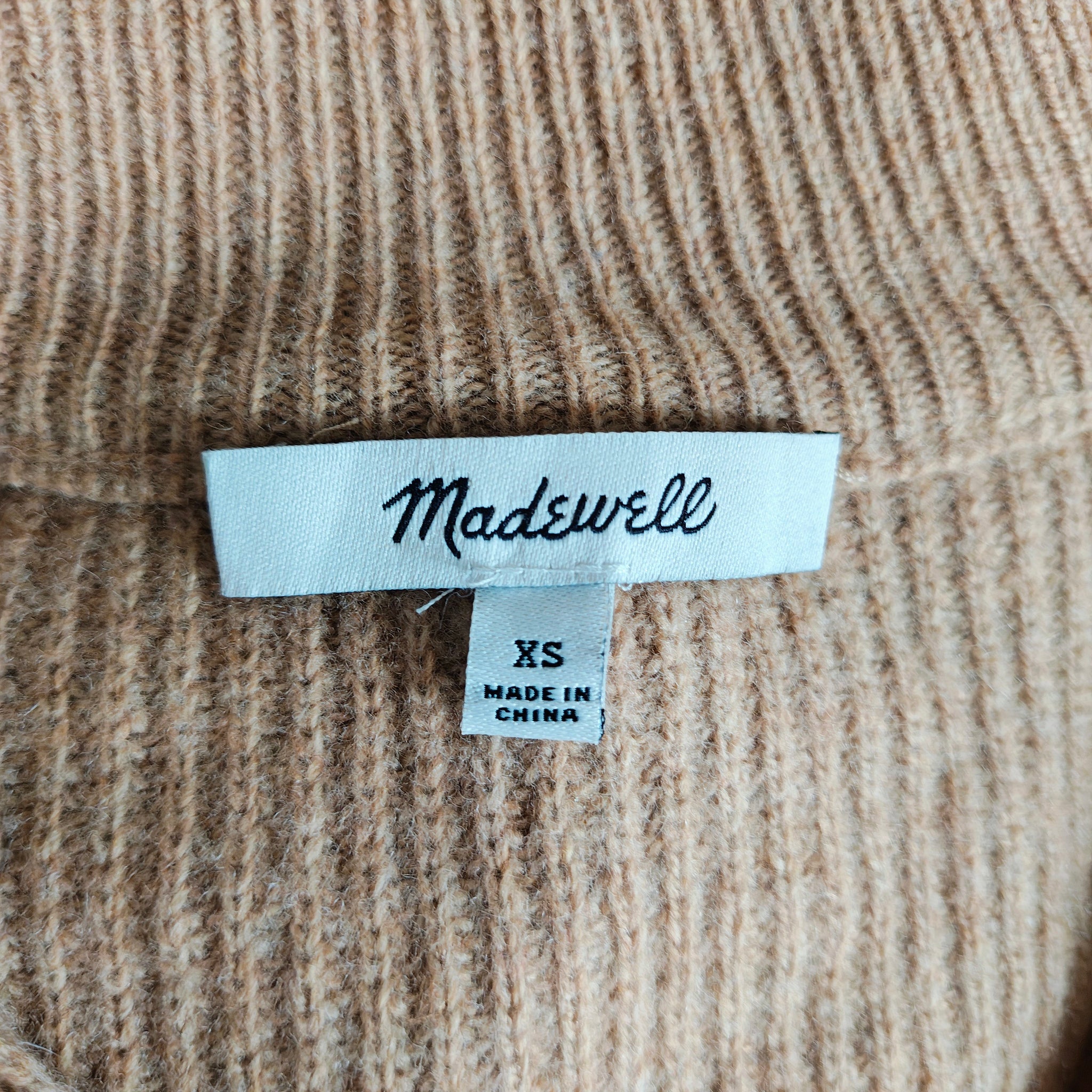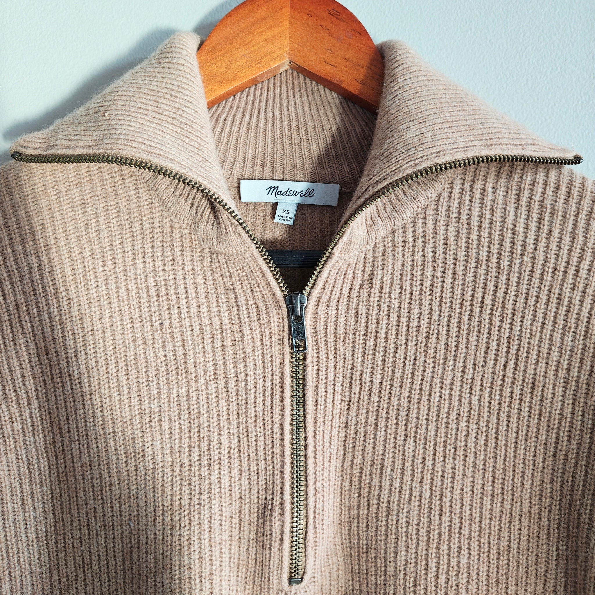 Madewell Glenbrook Half-Zip Pullover Sweater. It is a ribbed knit in a tan or camel color, made from a warm merino wool-blend yarn, and features a foldover half-zip collar and front patch pockets.