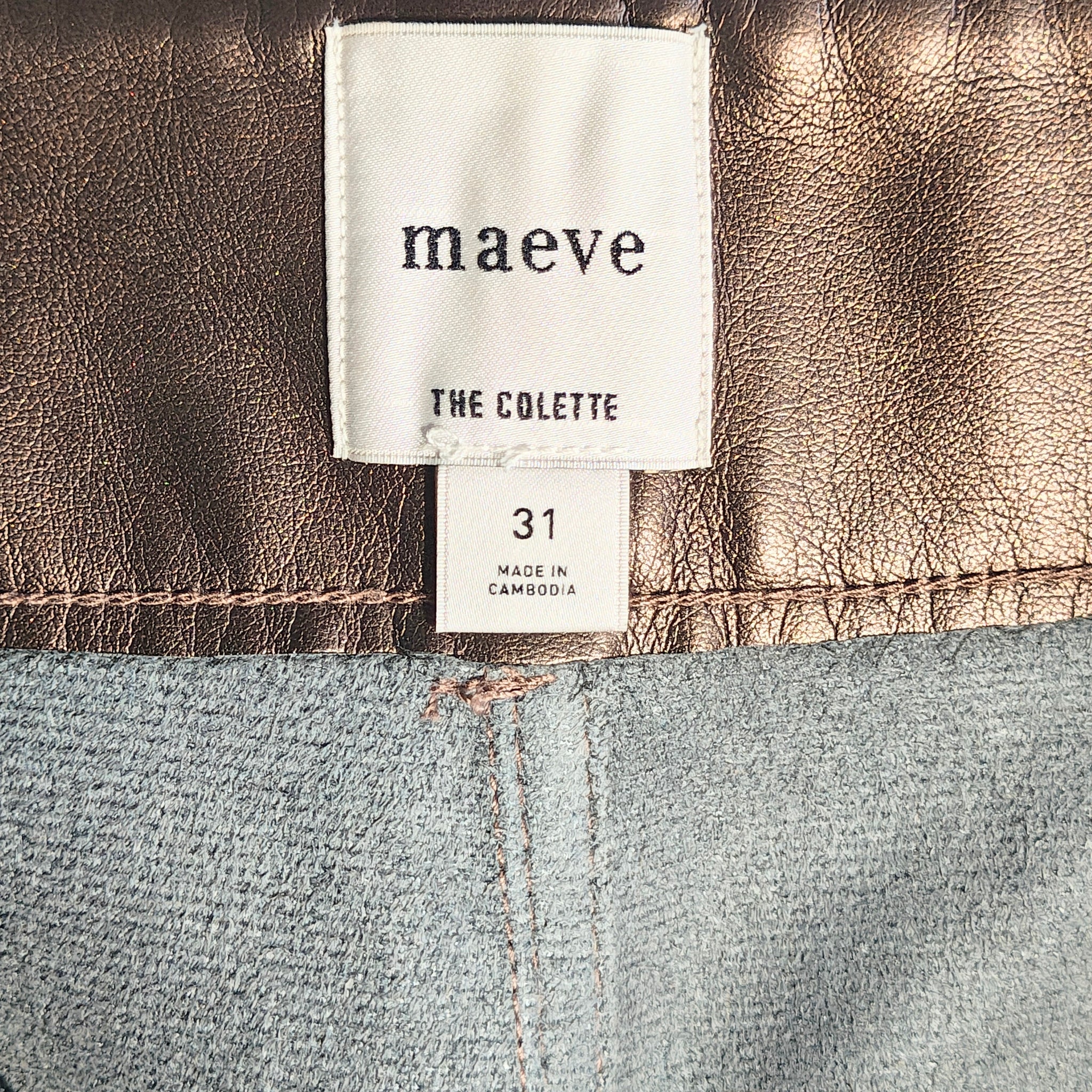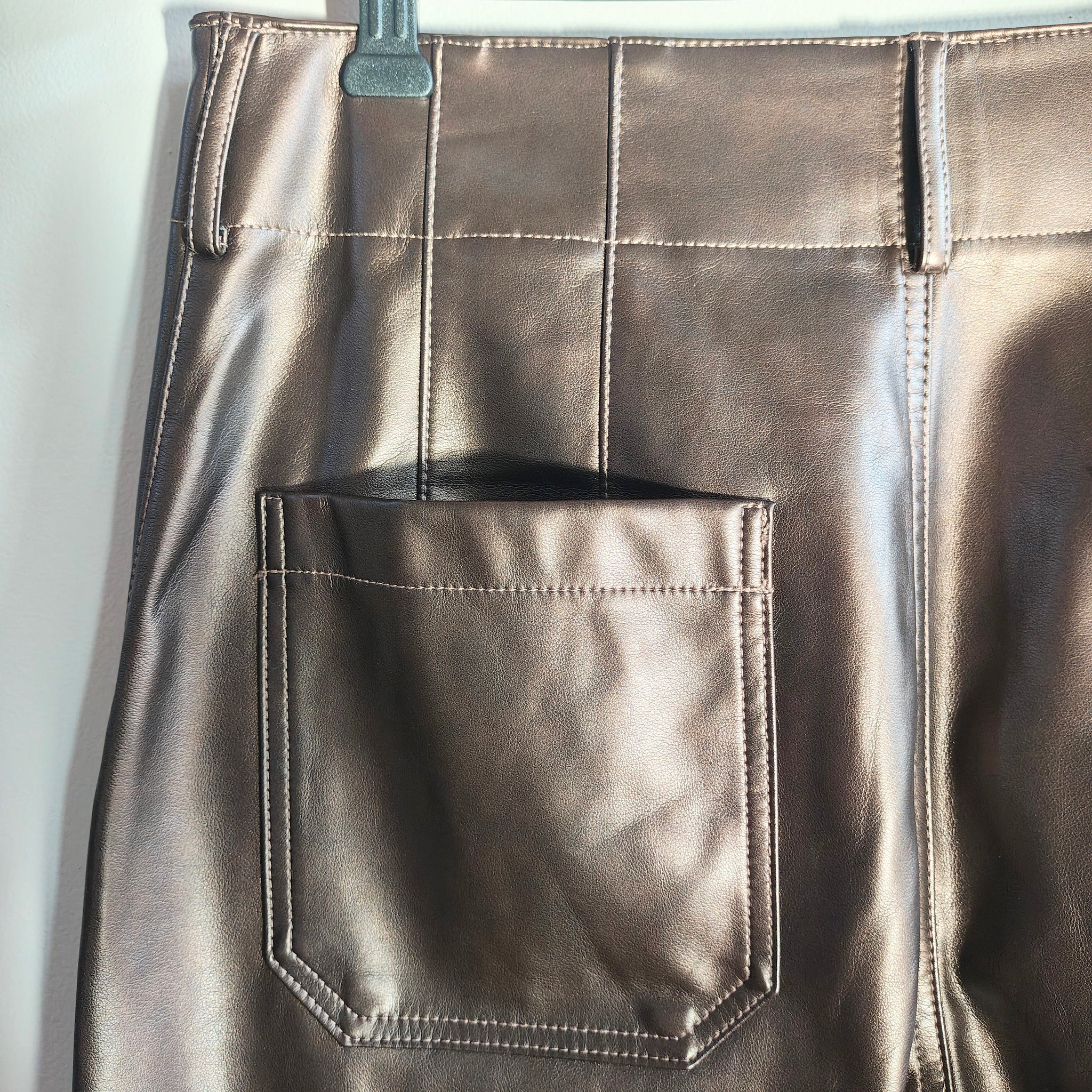 Anthropologie The Colette Cropped Wide-Leg Pants by the brand Maeve, specifically in a metallic faux-leather finish and a bronze or brown color. This specific style is known for its wide-leg silhouette, high rise, cropped length, and signature front and back patch pockets.