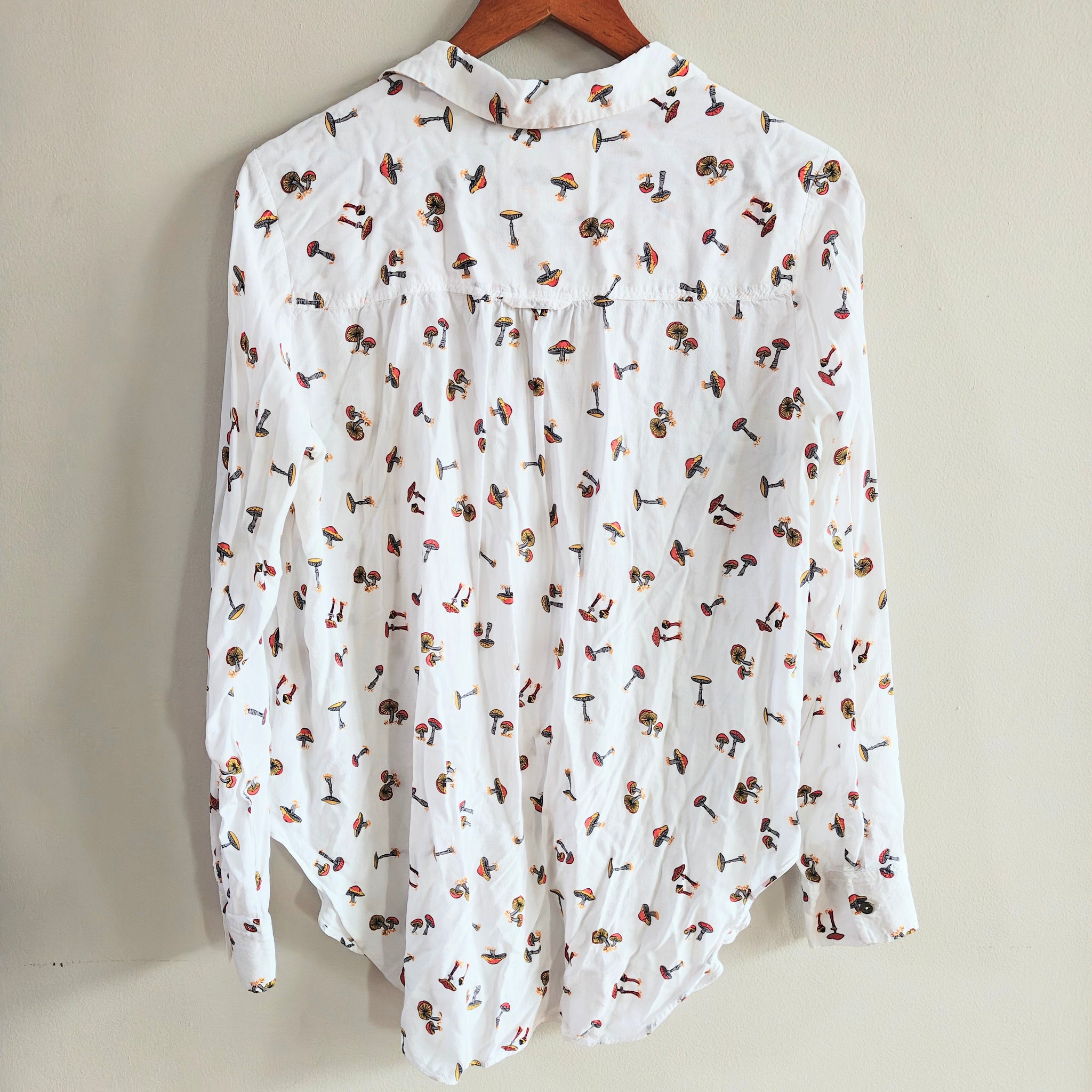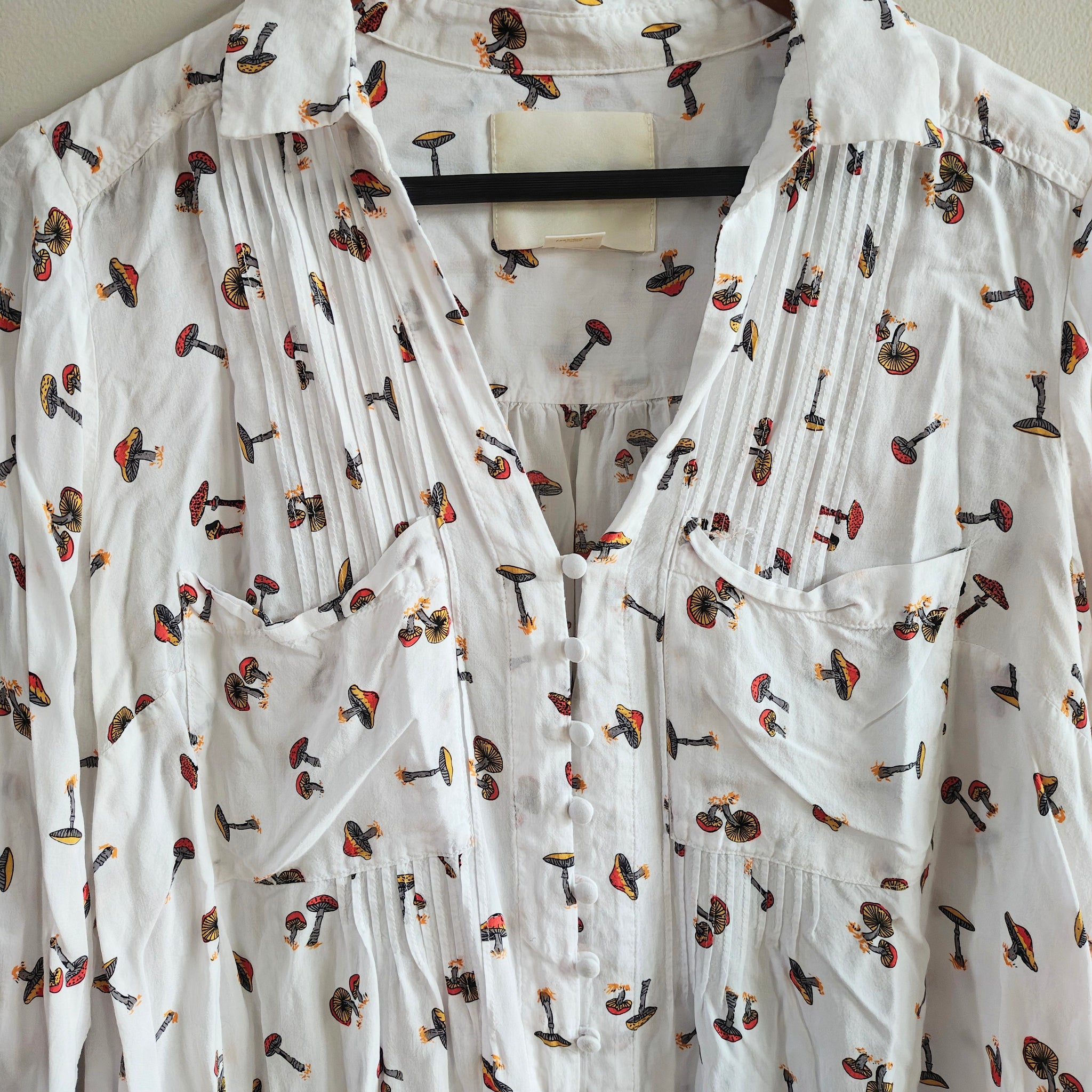 Anthropologie Maeve Matilda mushroom blouse. This long-sleeve, button-down shirt is made of rayon and features a whimsical mushroom and toadstool print. It often includes pintuck pleat detailing on the front and a high-low hem.