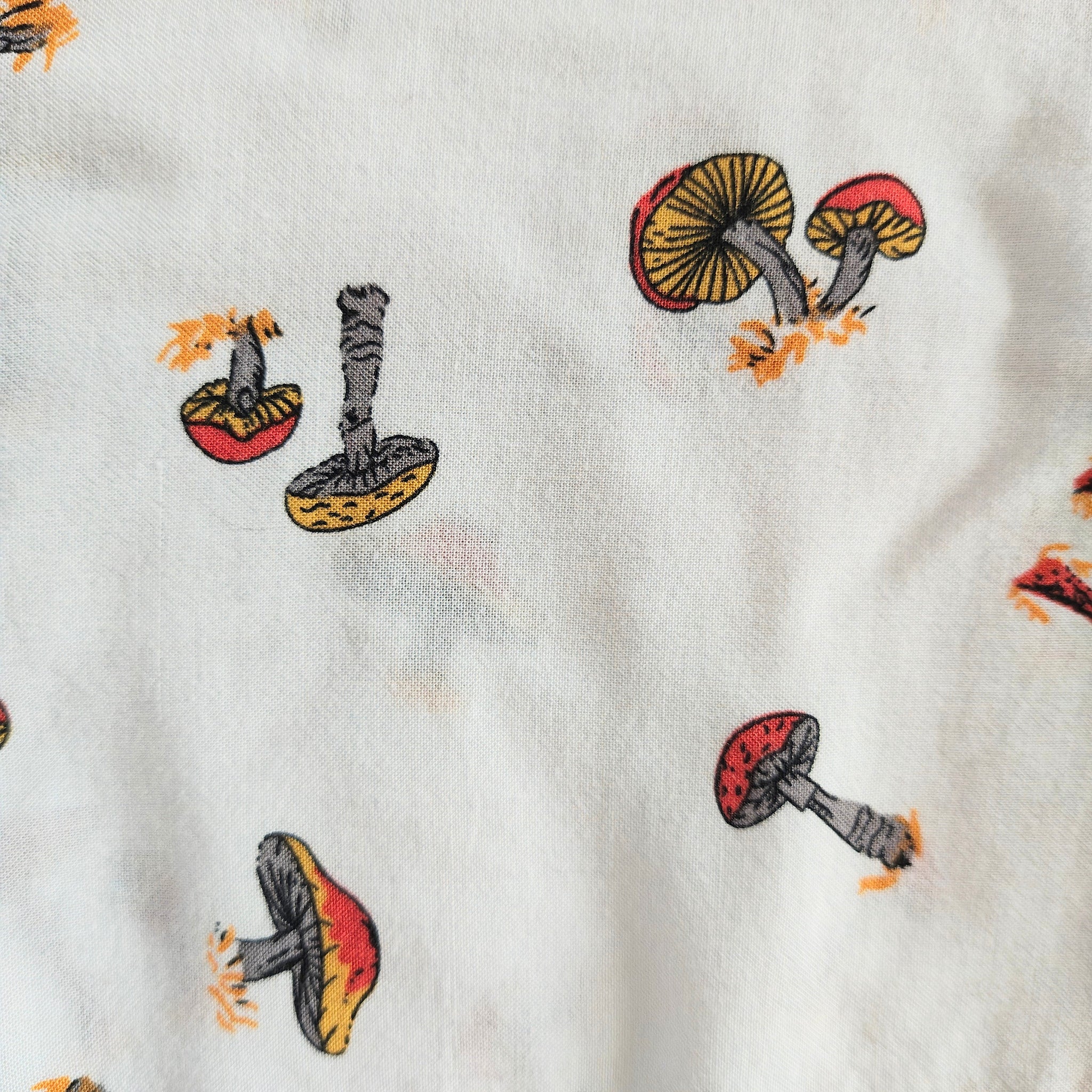 Design: White base with a colorful mushroom and toadstool pattern, V-neckline, full button closure, and pintuck pleating