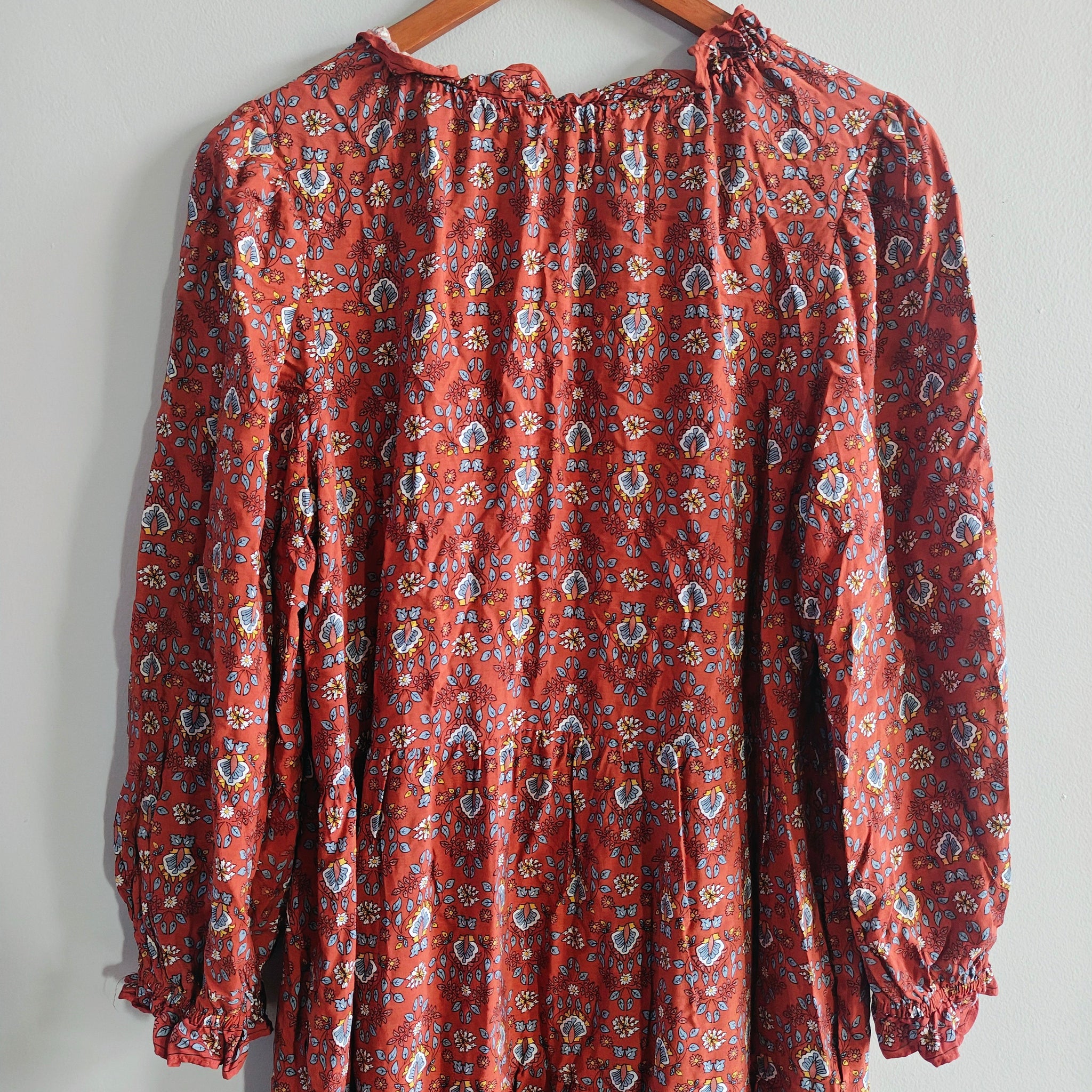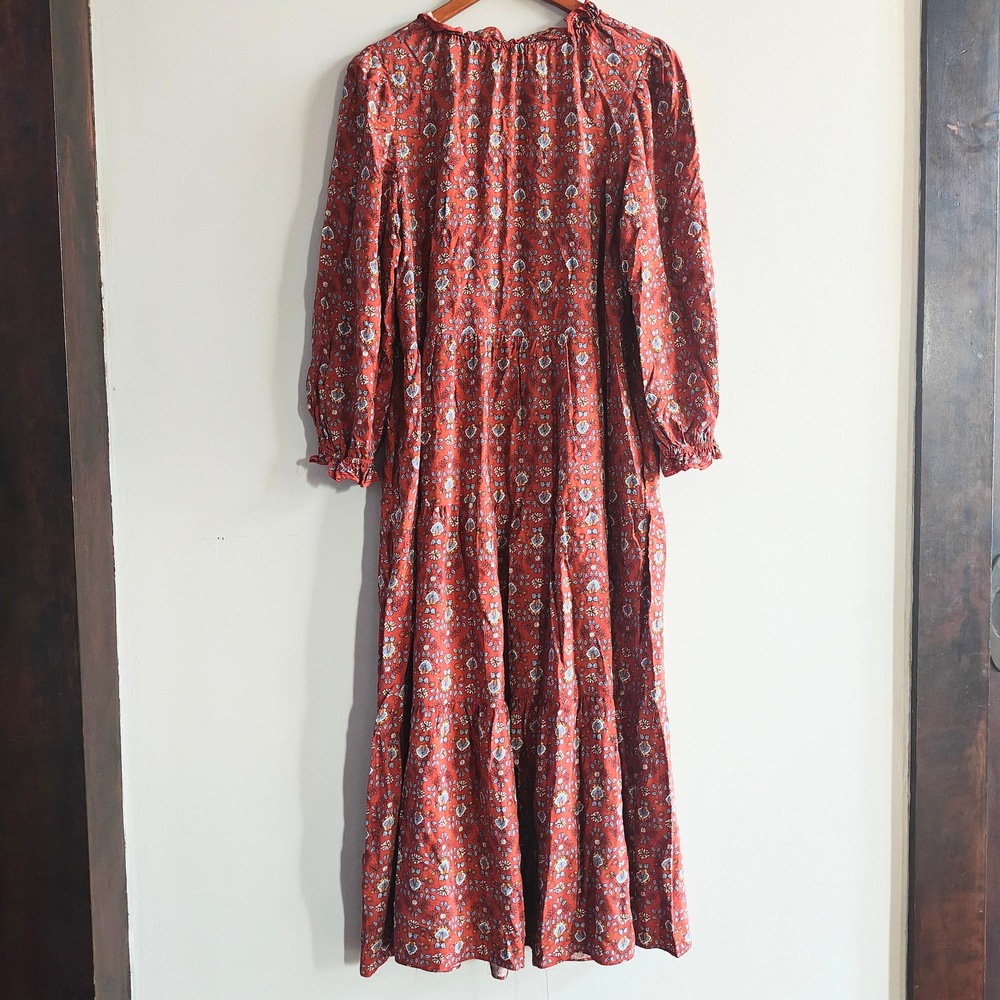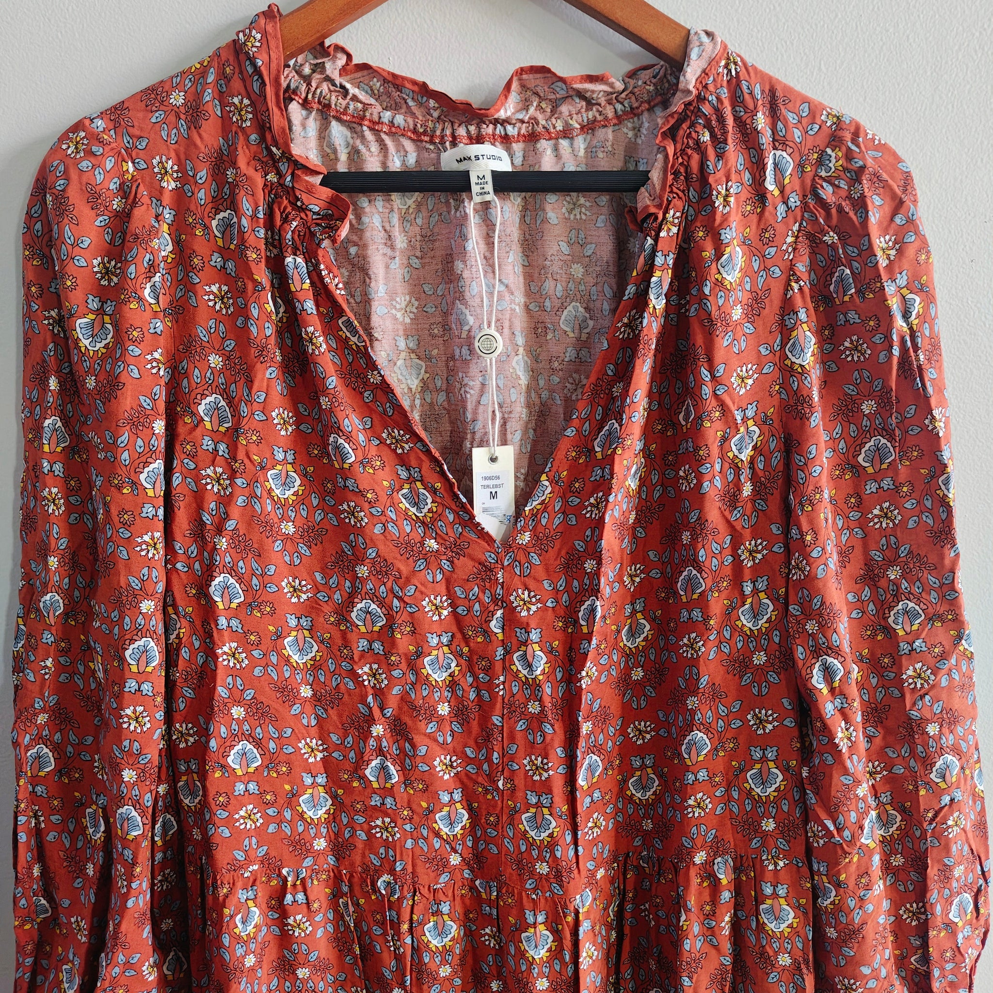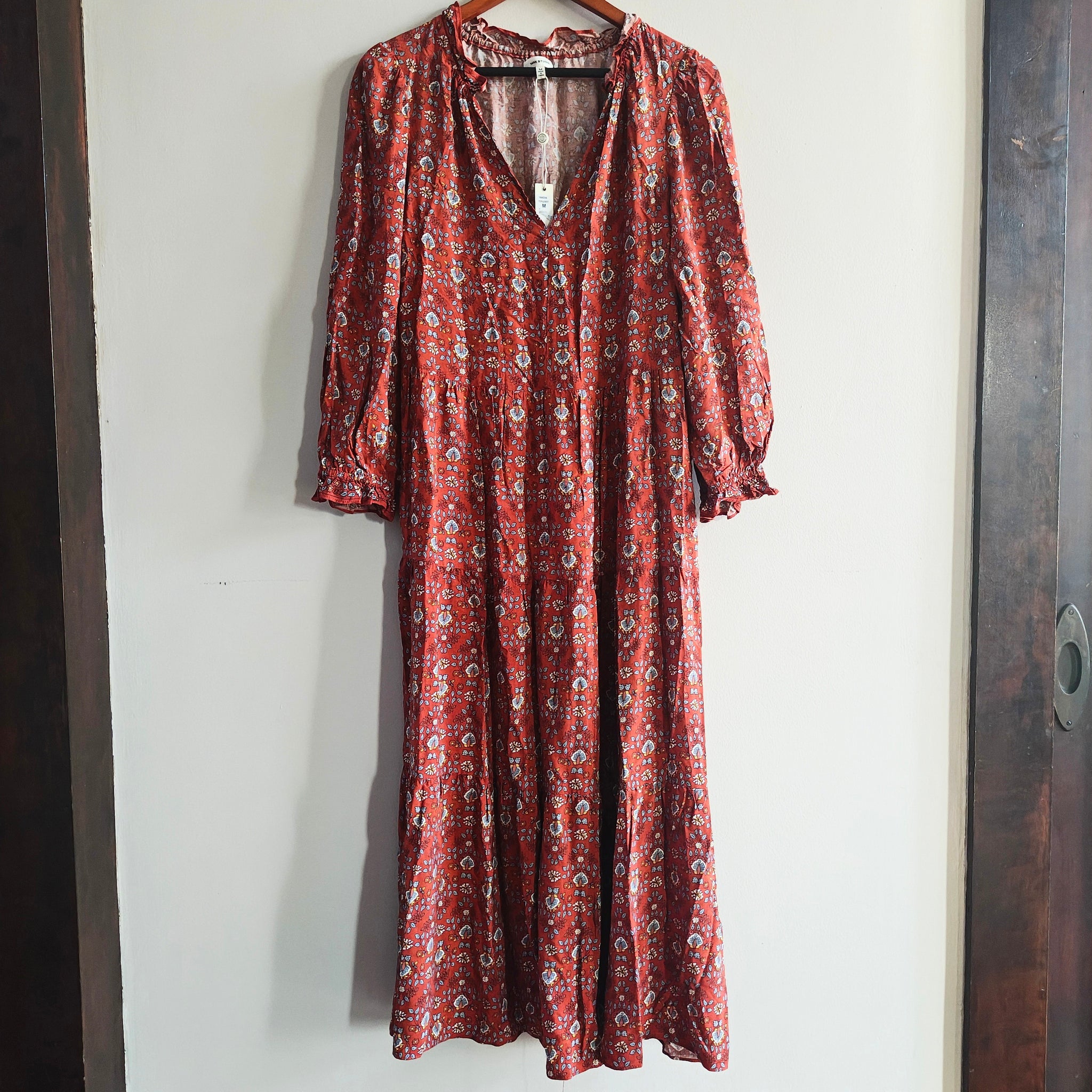 Max Studio long-sleeved, tiered maxi dress with a V-neck keyhole and a rust/reddish floral pattern.