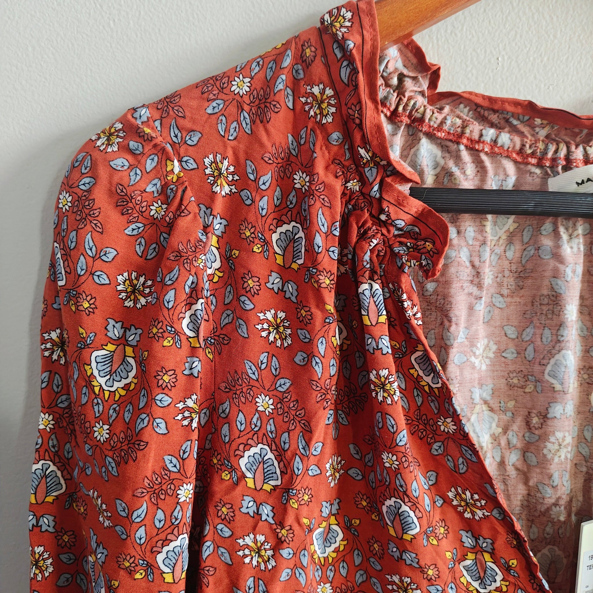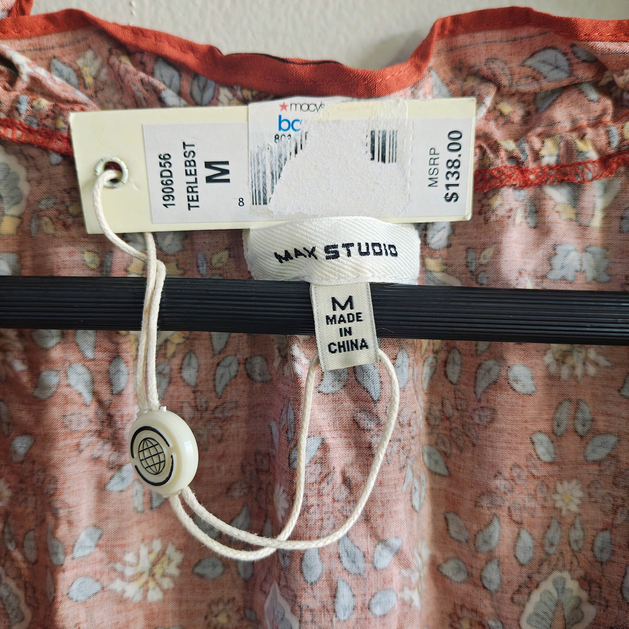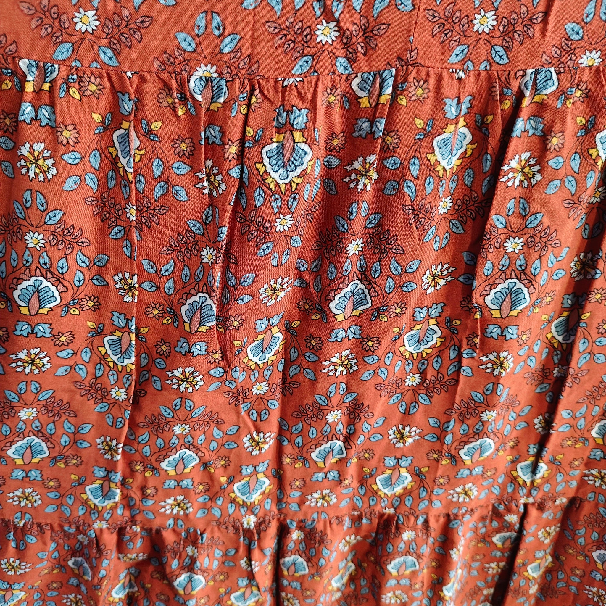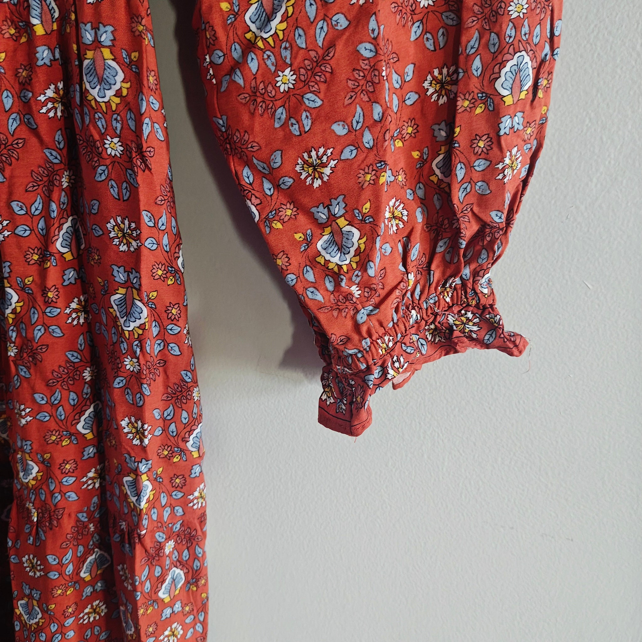 Max Studio long-sleeved, tiered maxi dress with a V-neck keyhole and a rust/reddish floral pattern.