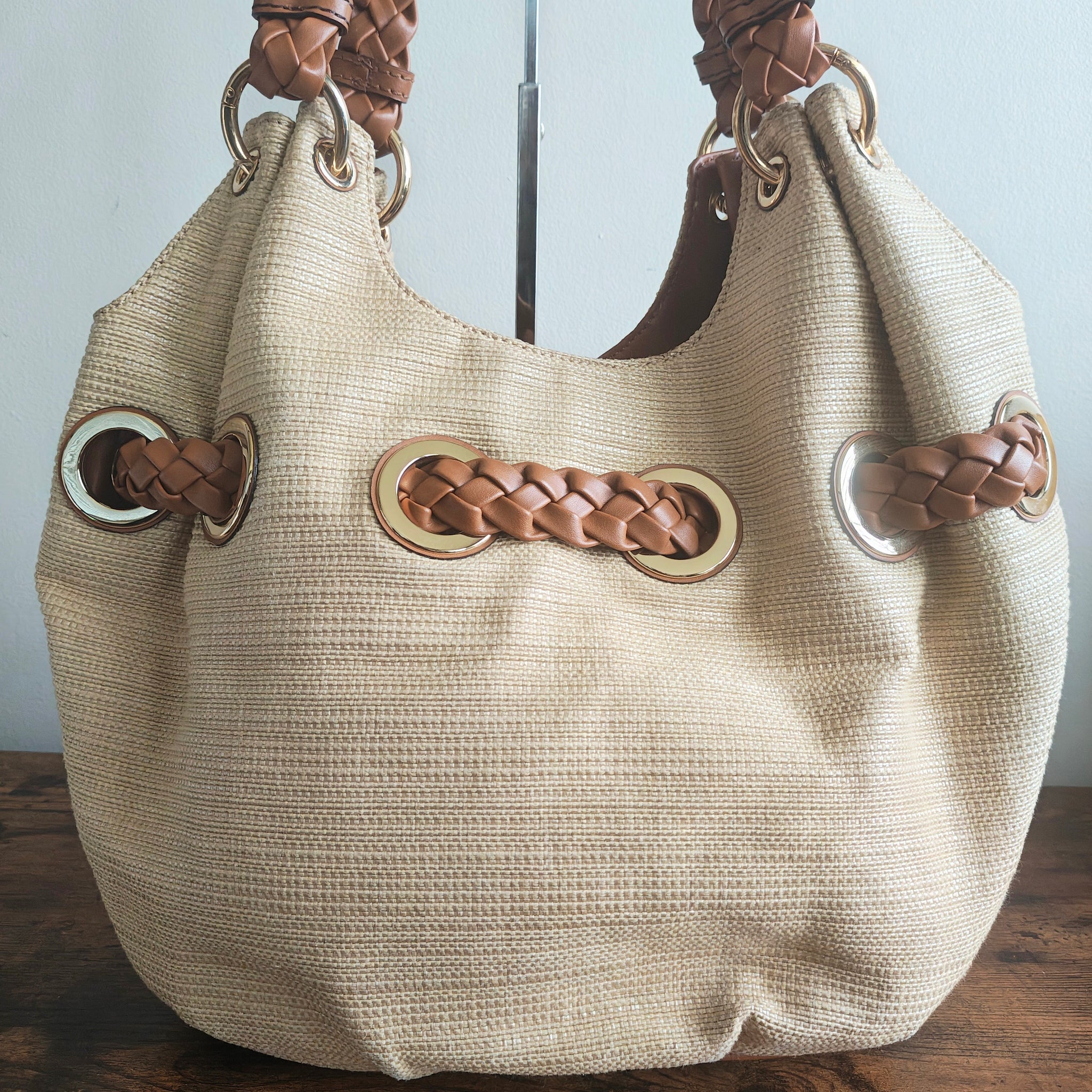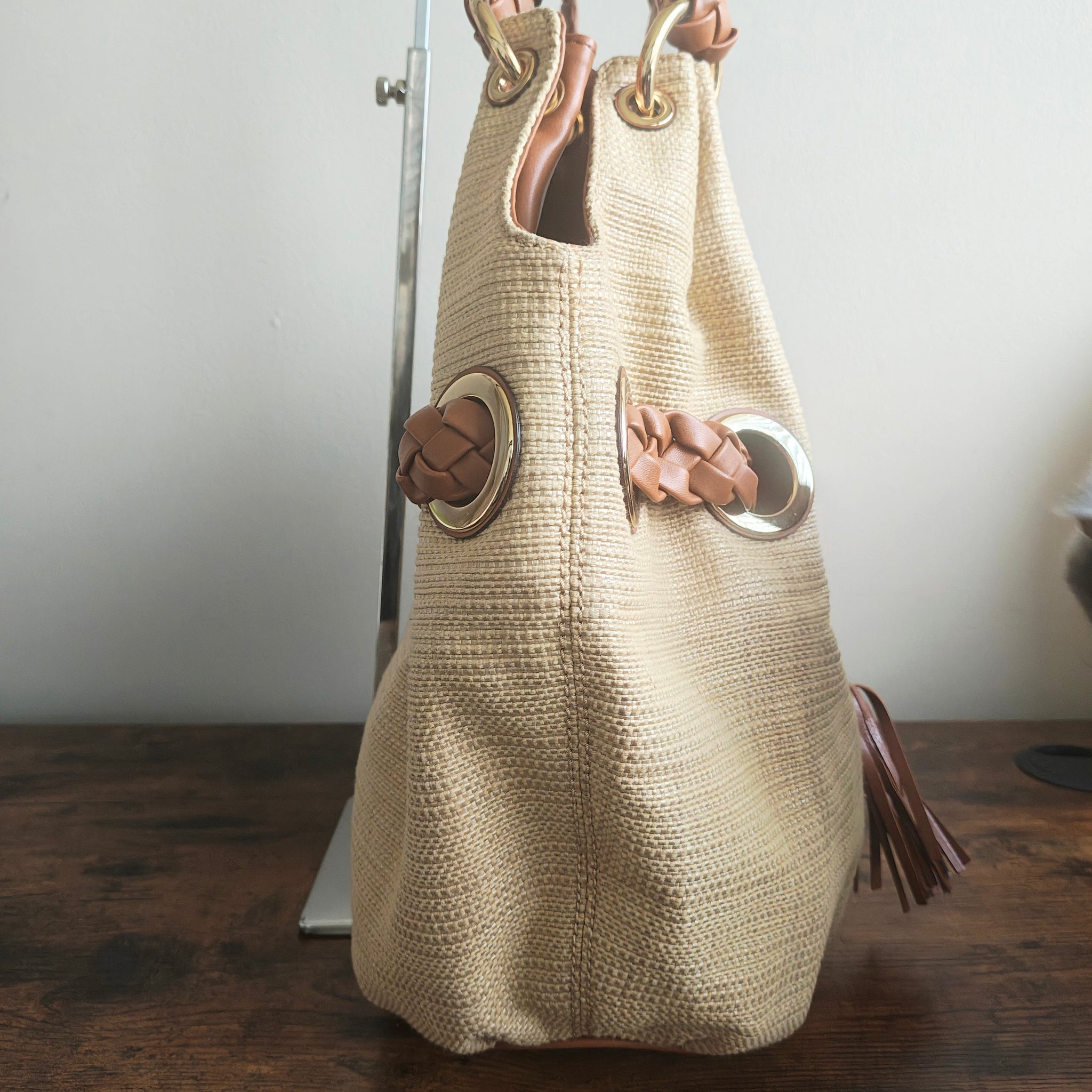 Michael Kors Large 'Carlton' Straw Tote, a breezy shoulder bag featuring a natural tan hue with rich brown leather accents.