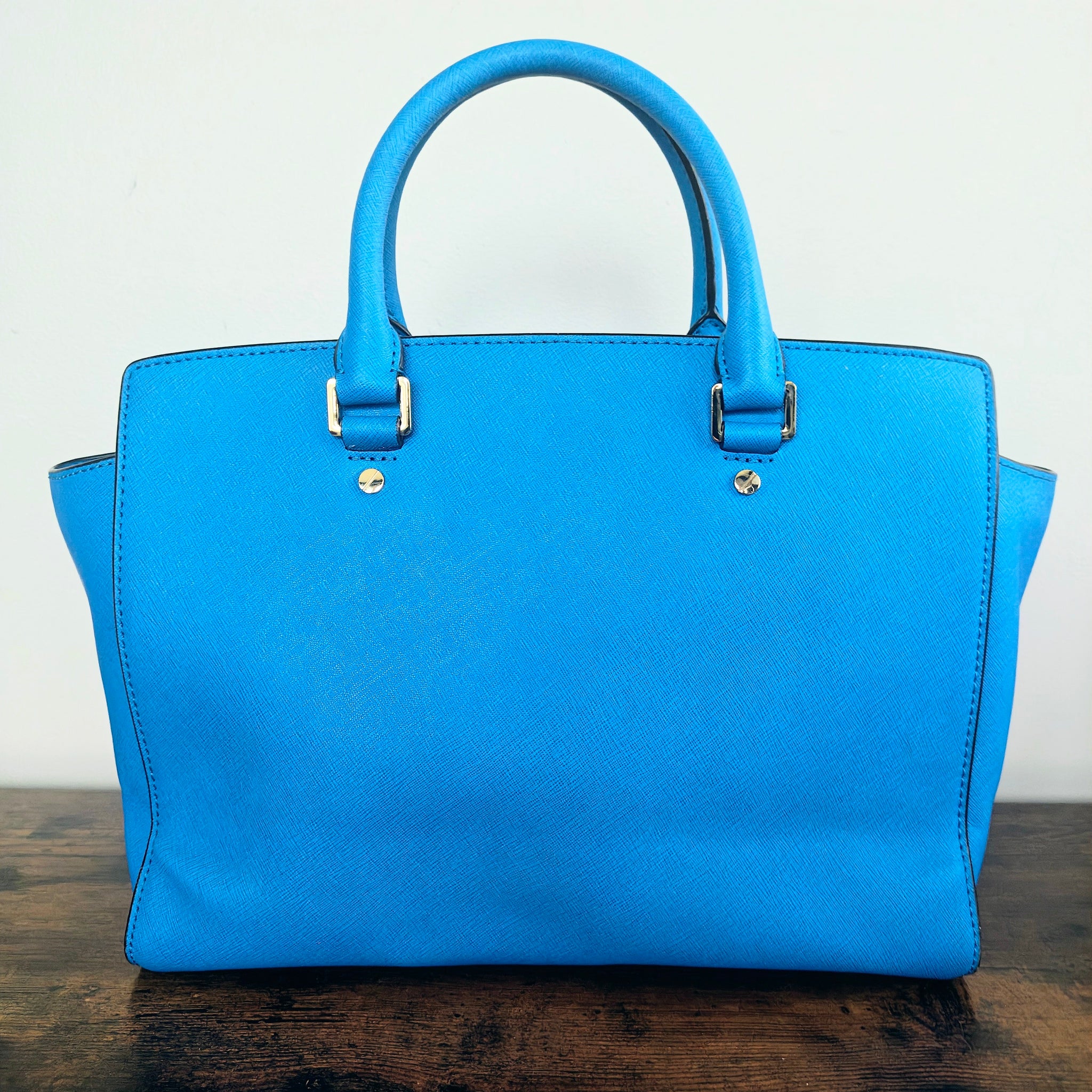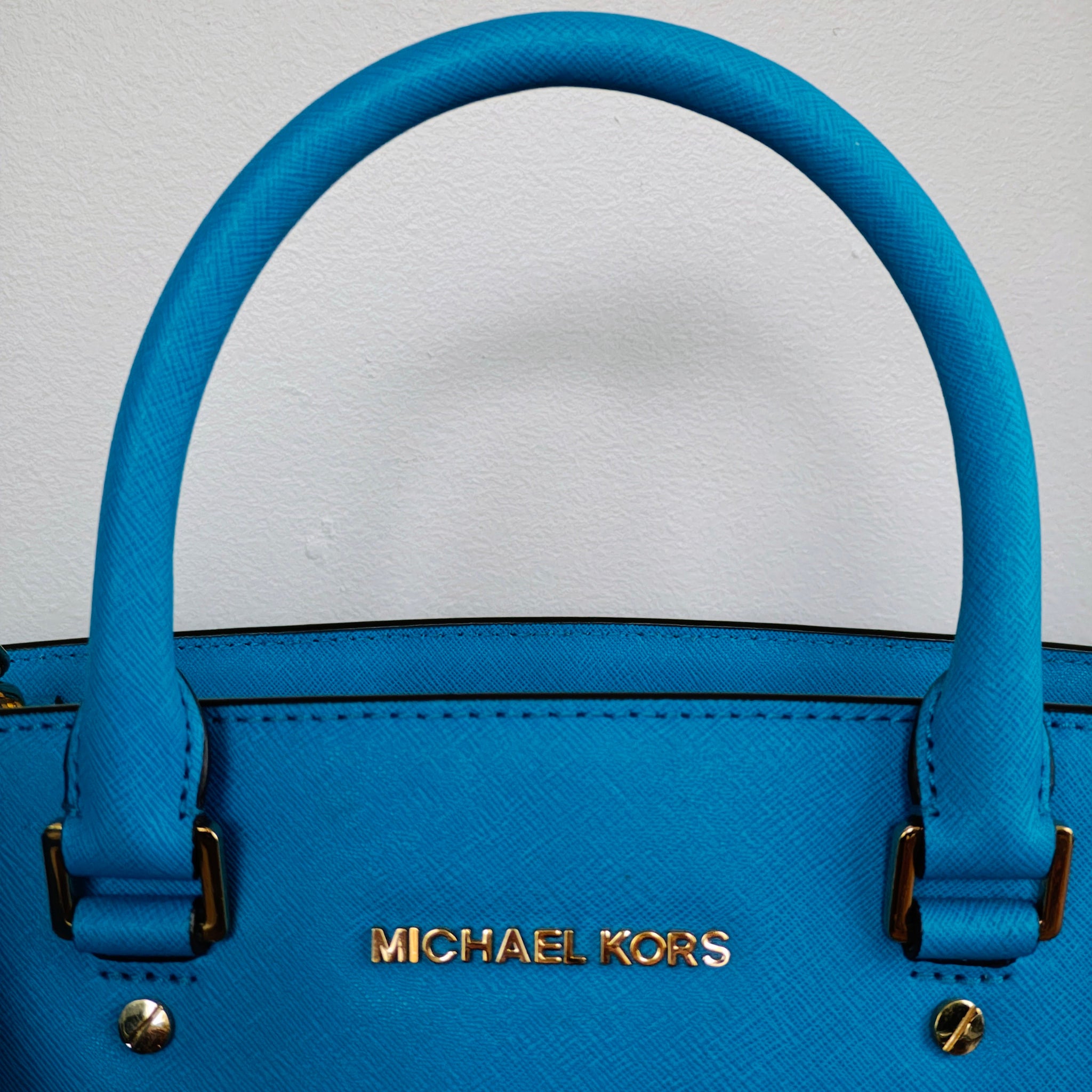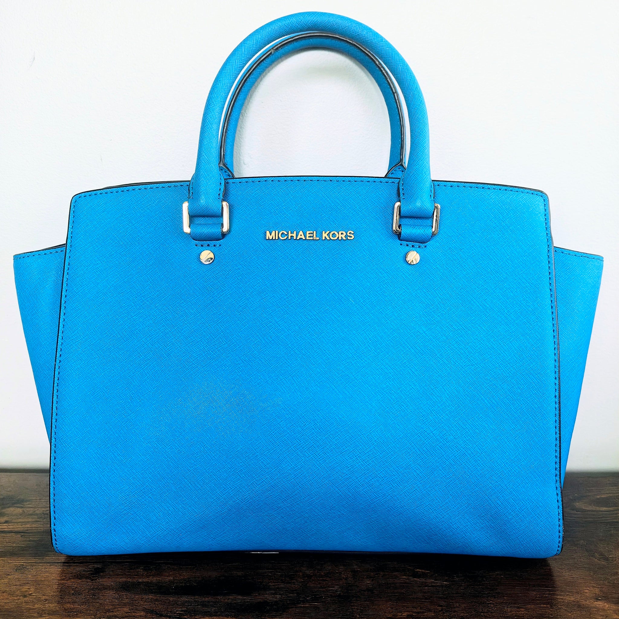 Michael Kors Large EW Selma Satchel in the color Heritage Blue (also referred to as "Summer Blue" or "Light Blue"). It is crafted from Saffiano leather and features a structured silhouette, rolled top handles, and a detachable shoulder strap.