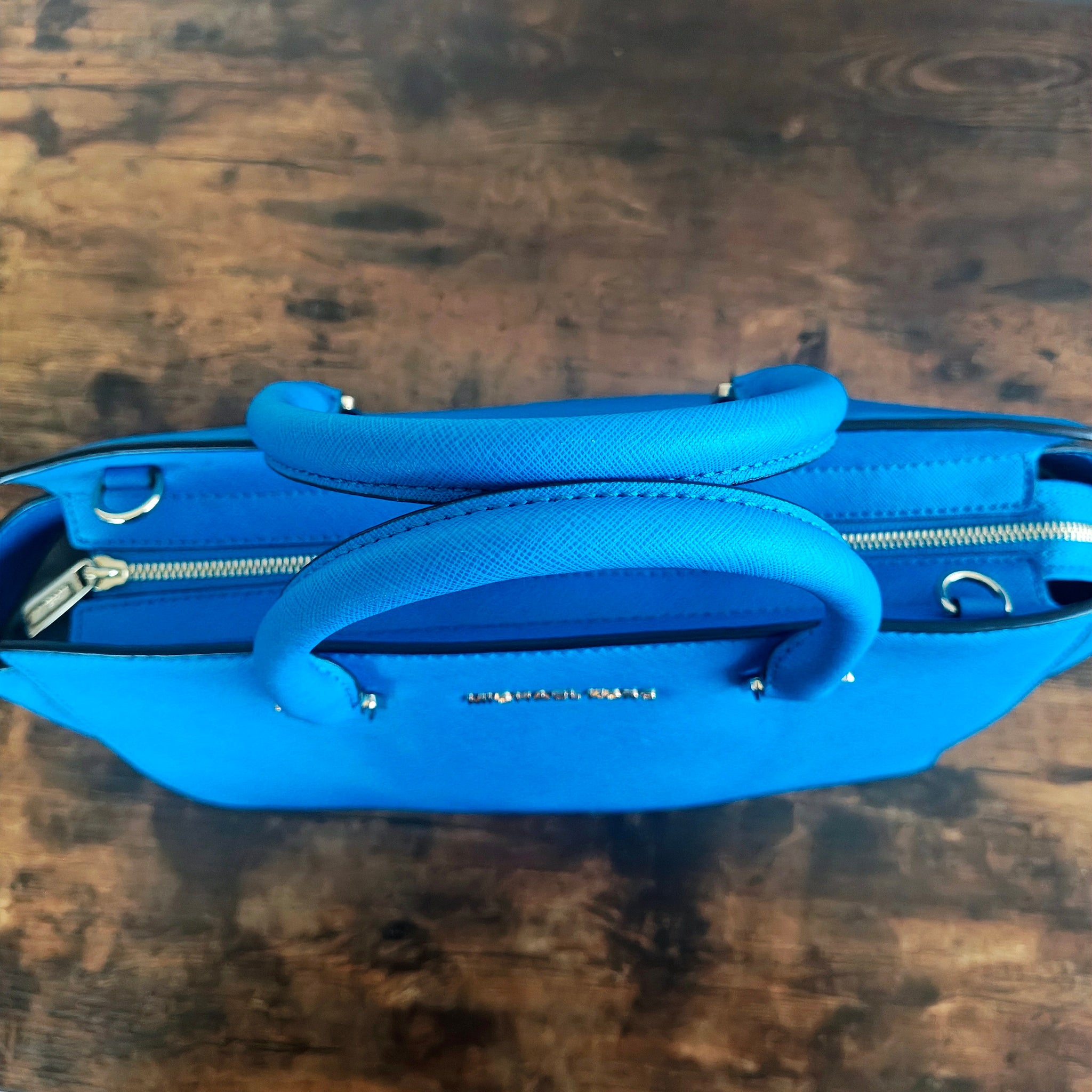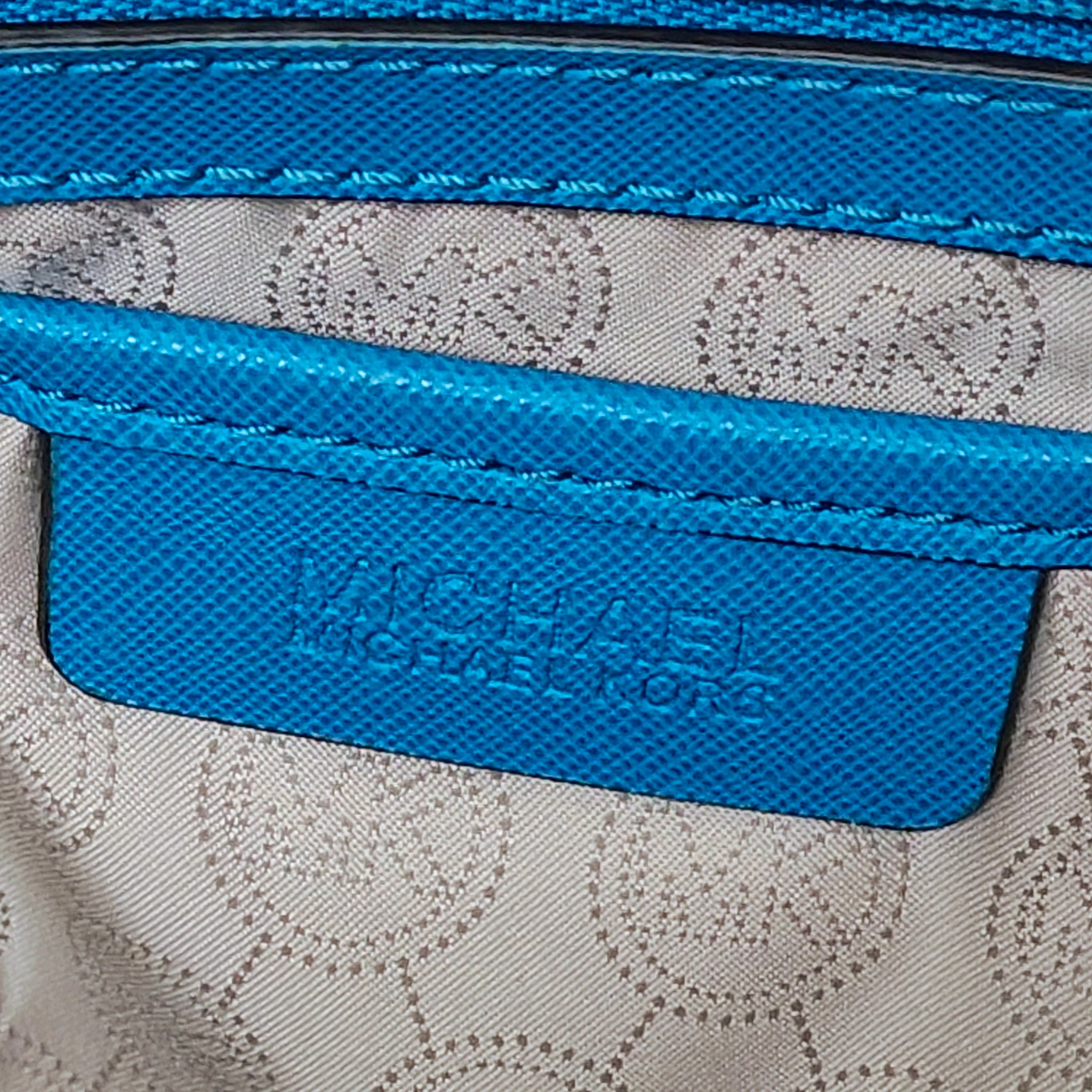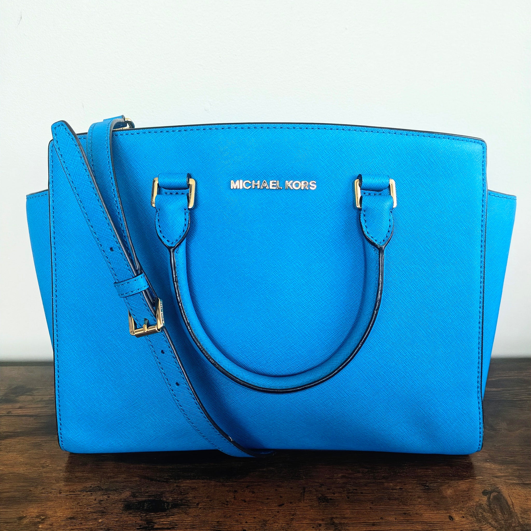 Michael Kors Large EW Selma Satchel in the color Heritage Blue (also referred to as "Summer Blue" or "Light Blue"). It is crafted from Saffiano leather and features a structured silhouette, rolled top handles, and a detachable shoulder strap.
