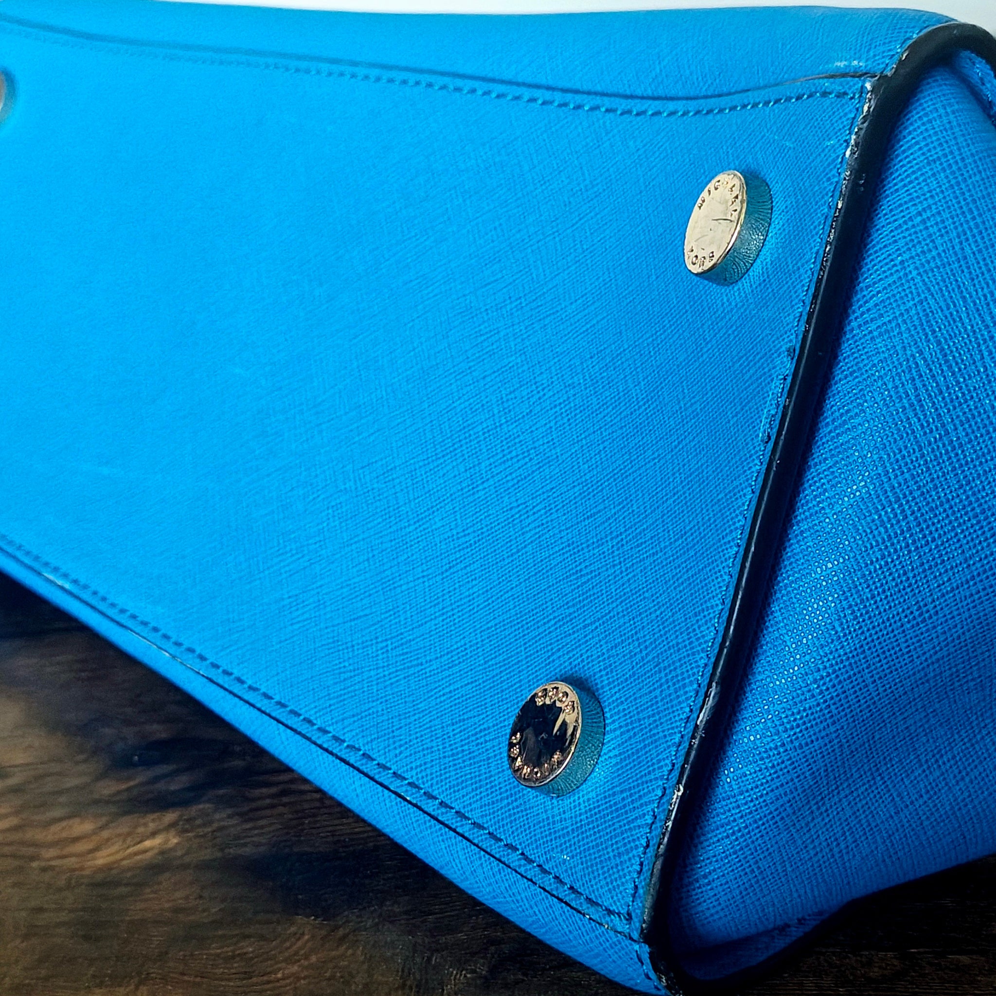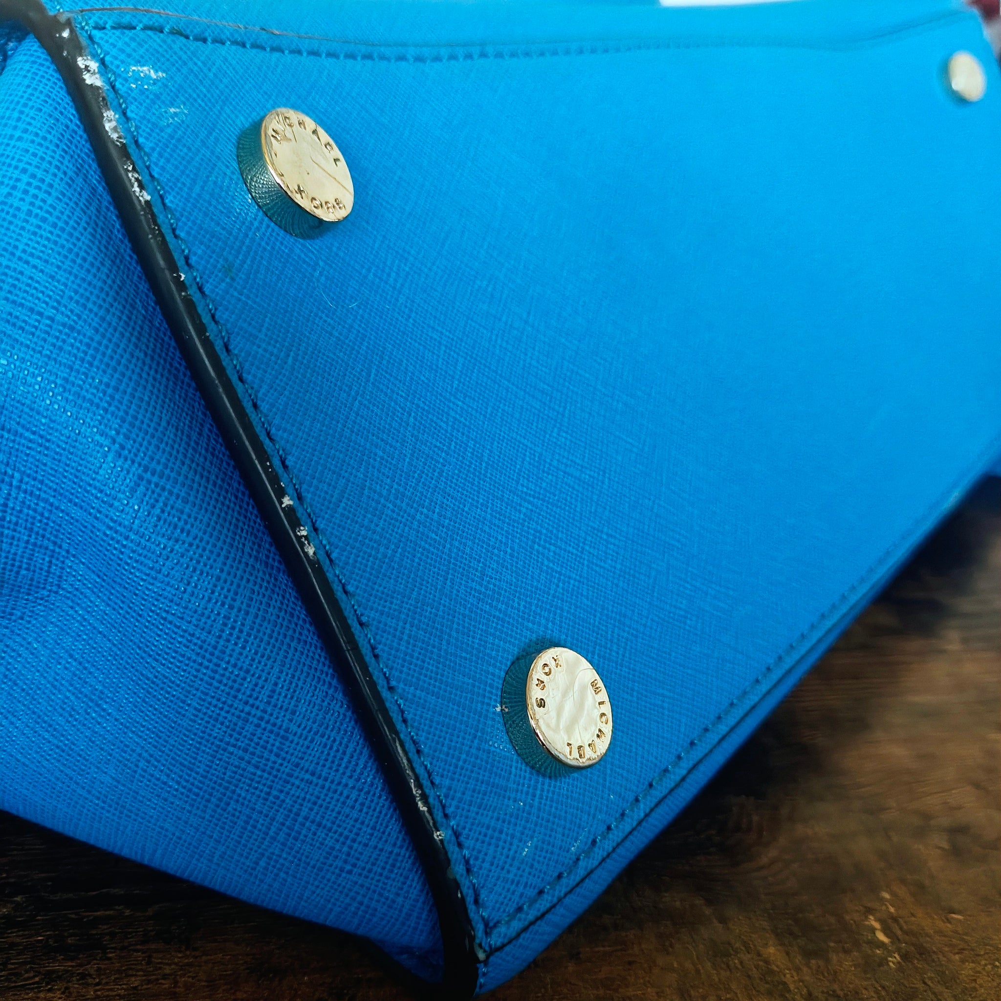 Bag is in good pre-owned condition overall, but see photos. Small white spot, dark smudge, and scuffs on button edges. None of which are large or extremely noticeable when carried. Bag was folded over in storage. It is properly stuffed for storage now but we give no guarantees as to how long it will take to reshape the fold on the backside.