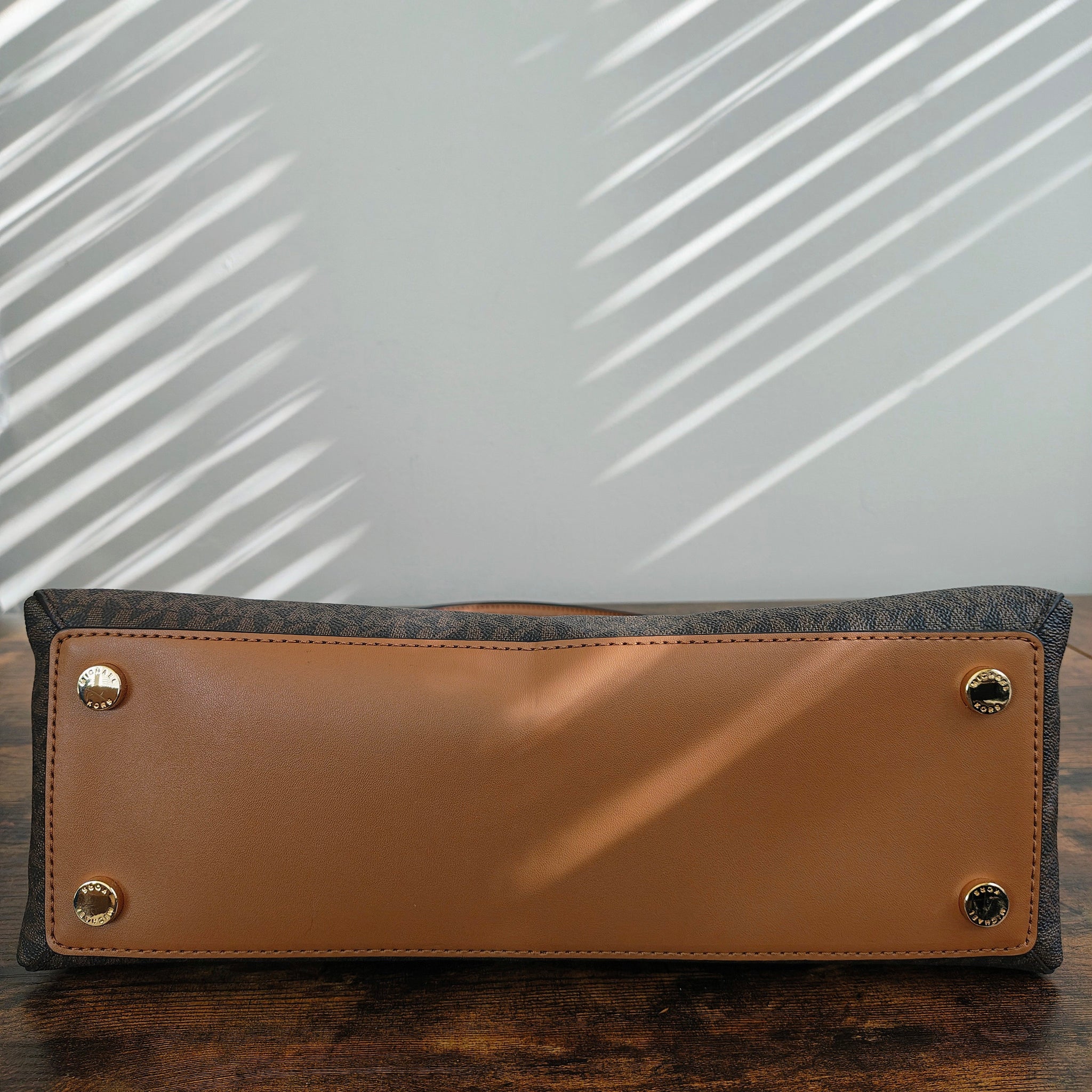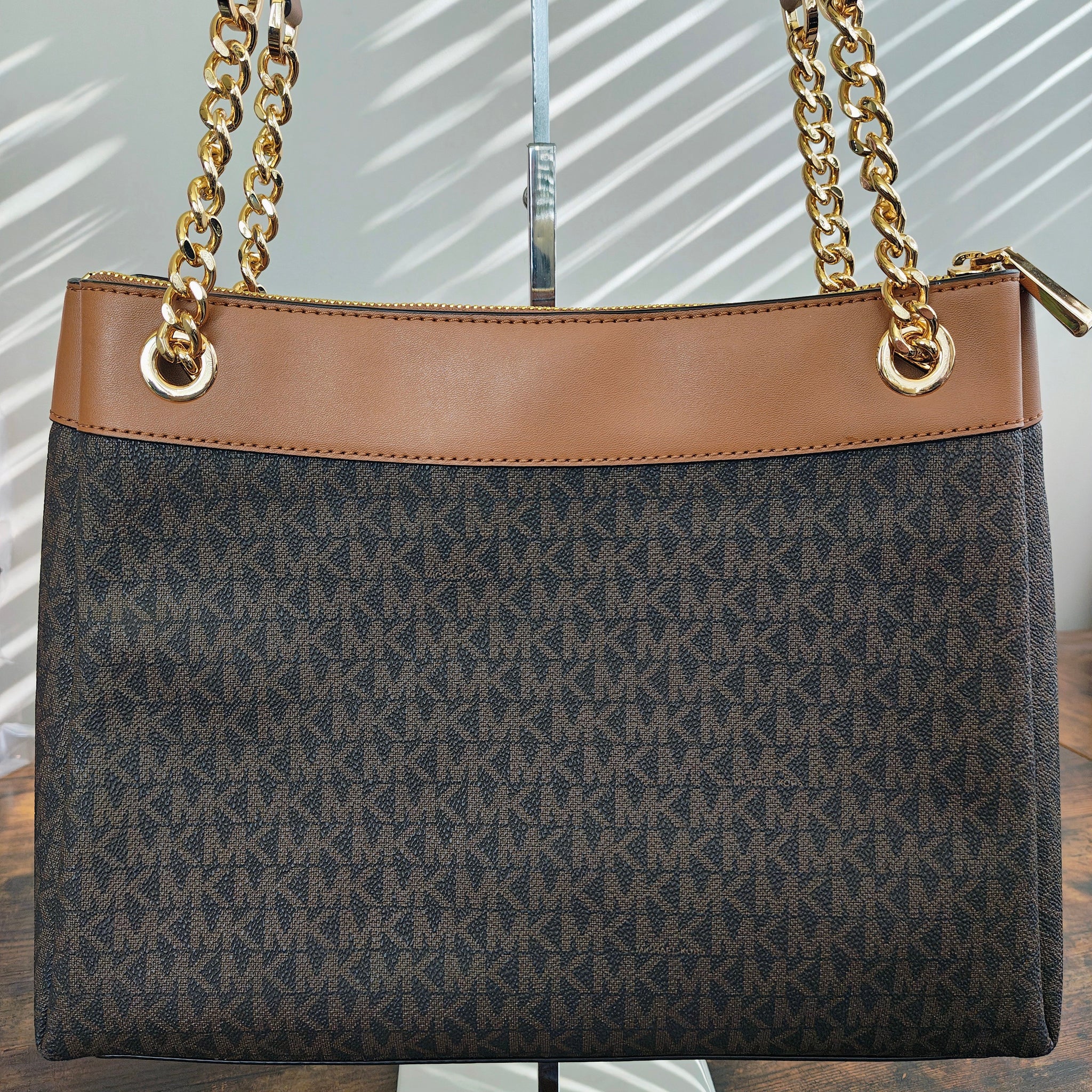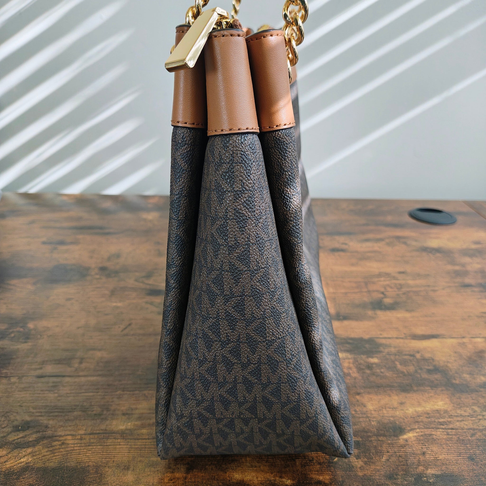 Embrace everyday glamour with the Signature print Lori bag, designed in a classic tote silhouette. The top zip fastening keeps your essentials safe, while two adjoining snap pockets offer added storage. Every detail is carefully considered, from the chain-link top handle to the protective feet at the base.