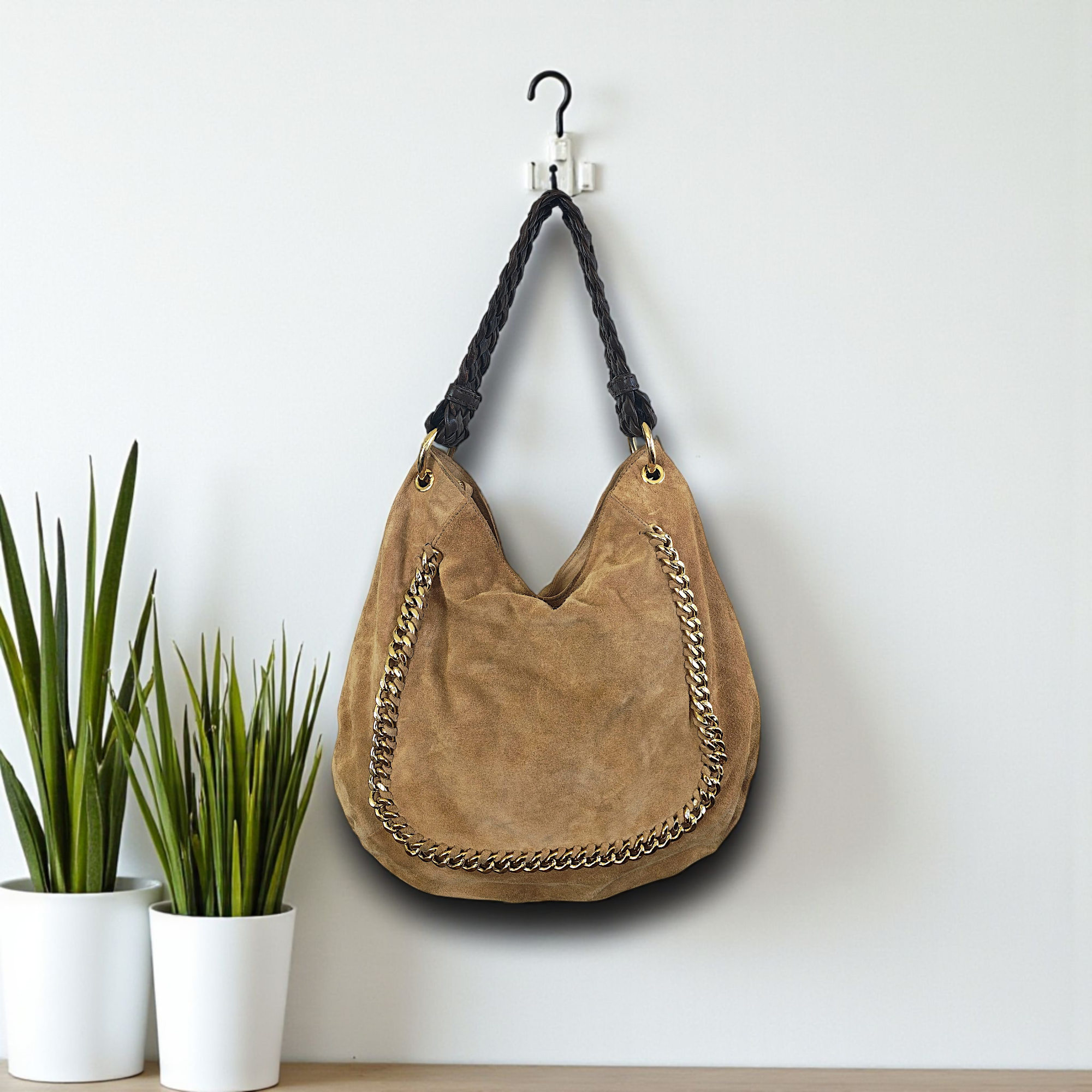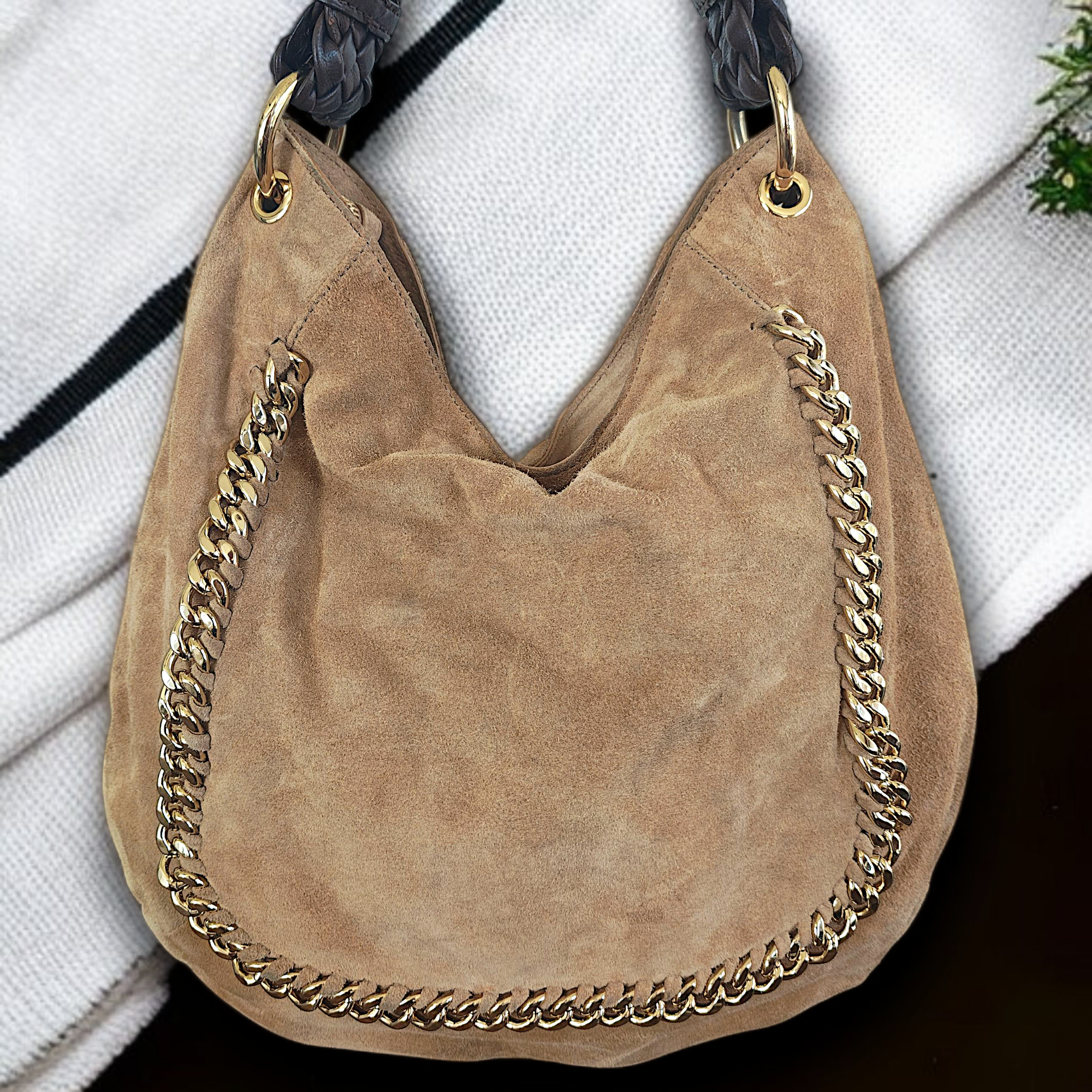 This effortless shoulder bag is one you’ll want to carry everywhere. Soft suede accented with gold-tone MK signature hardware, then finished with braided leather shoulder straps. An enduring daytime essential, it tops our list for being both practical and polished.
