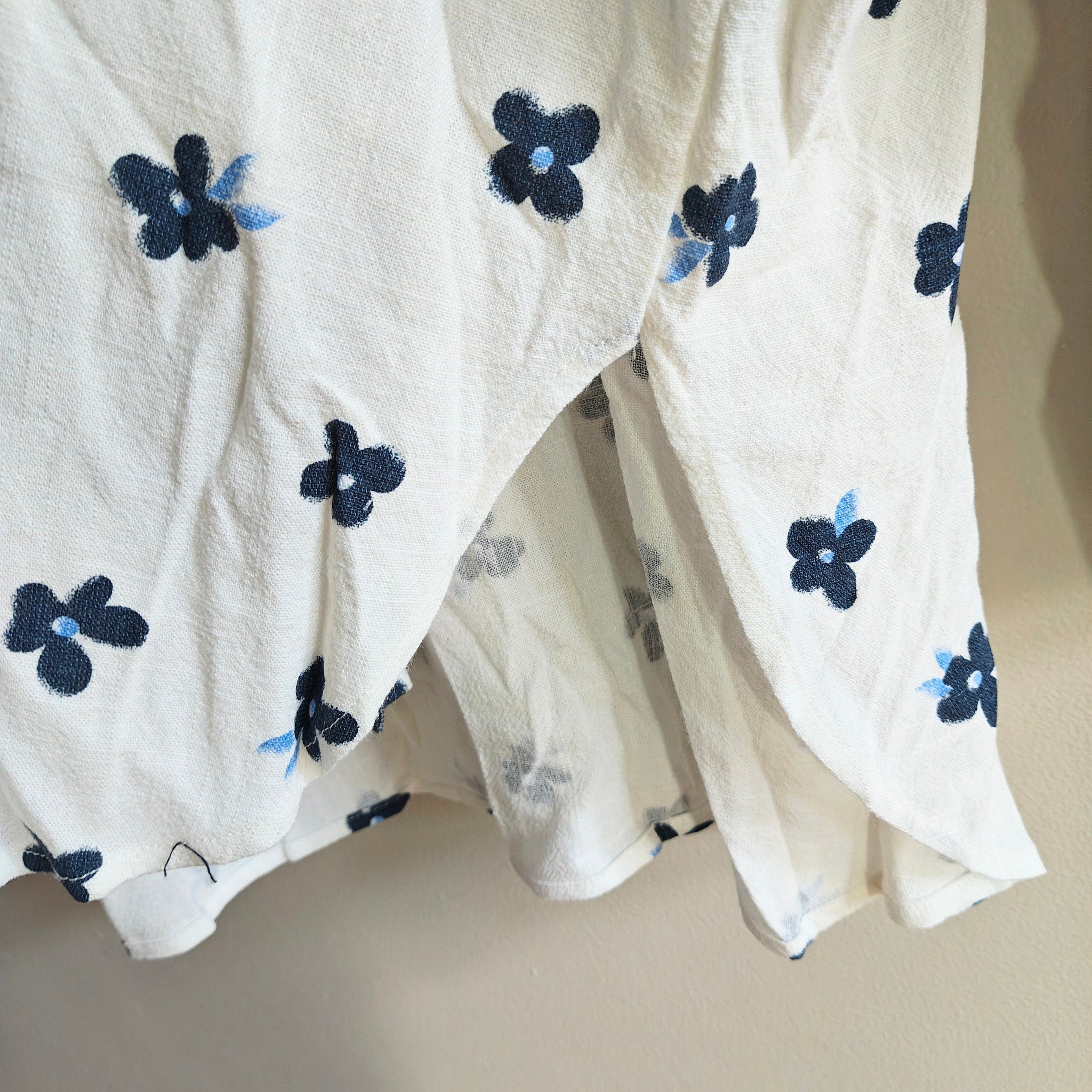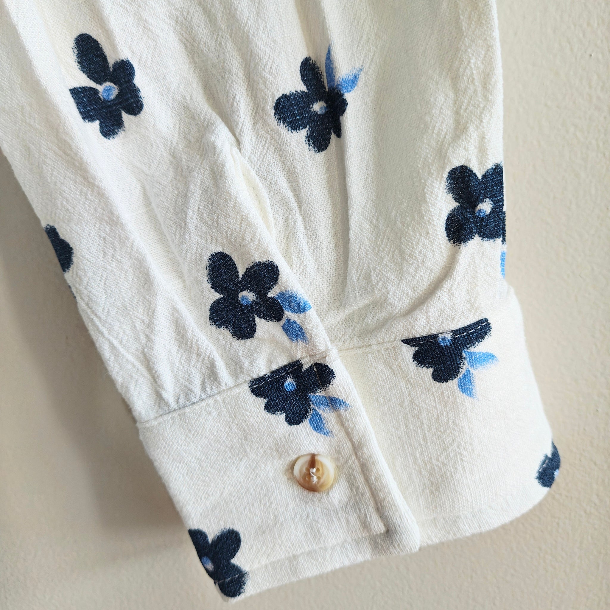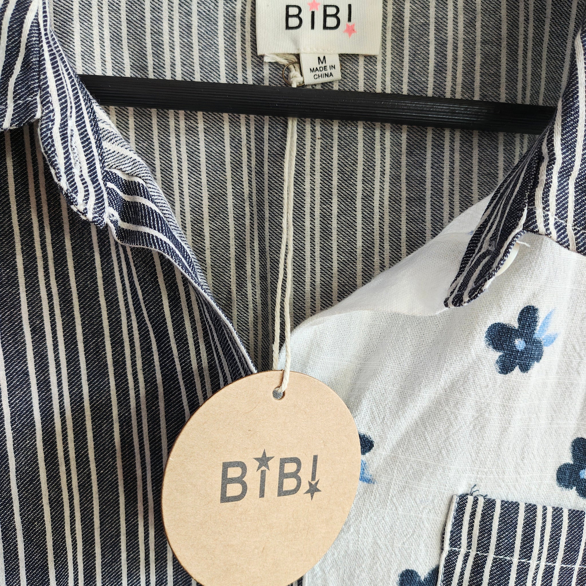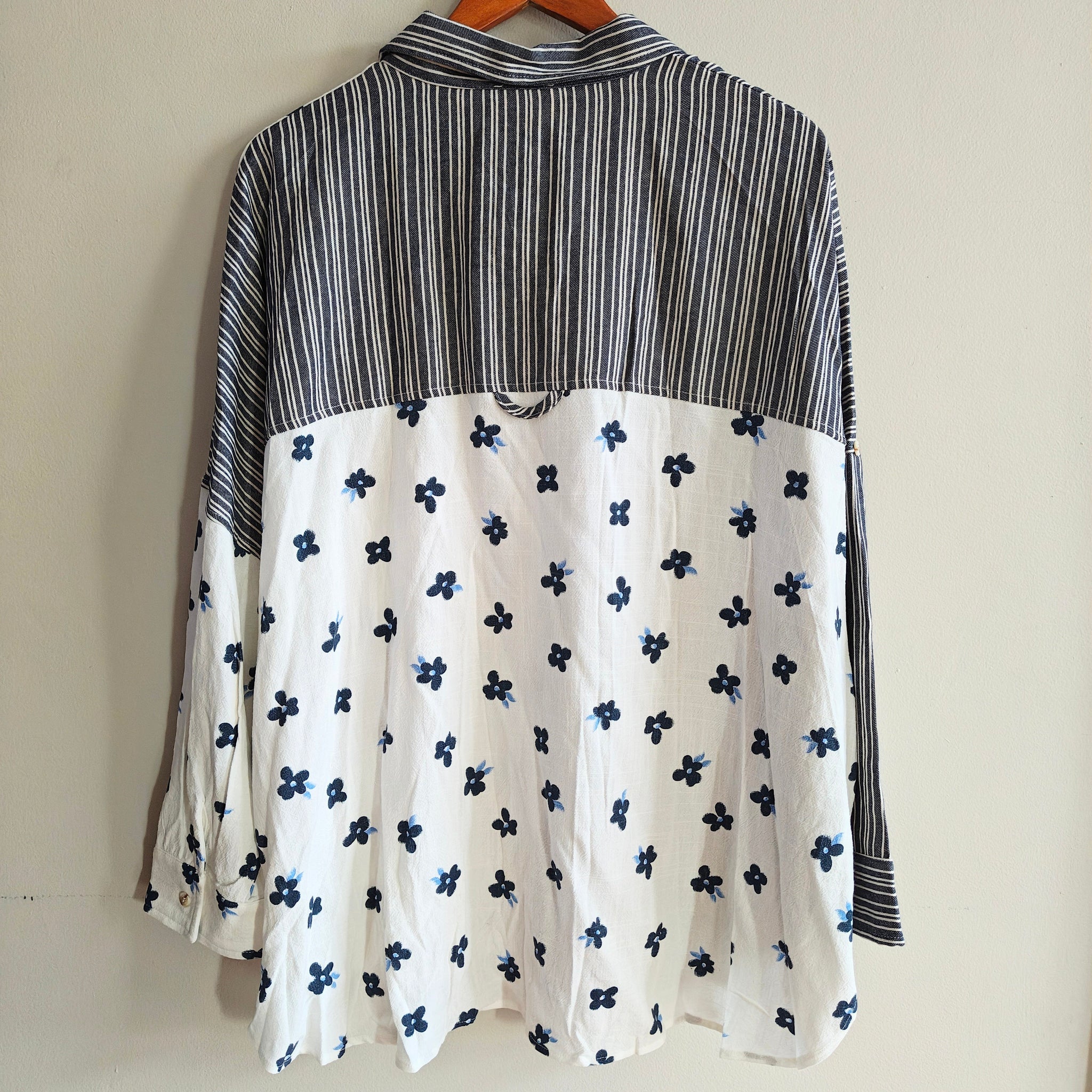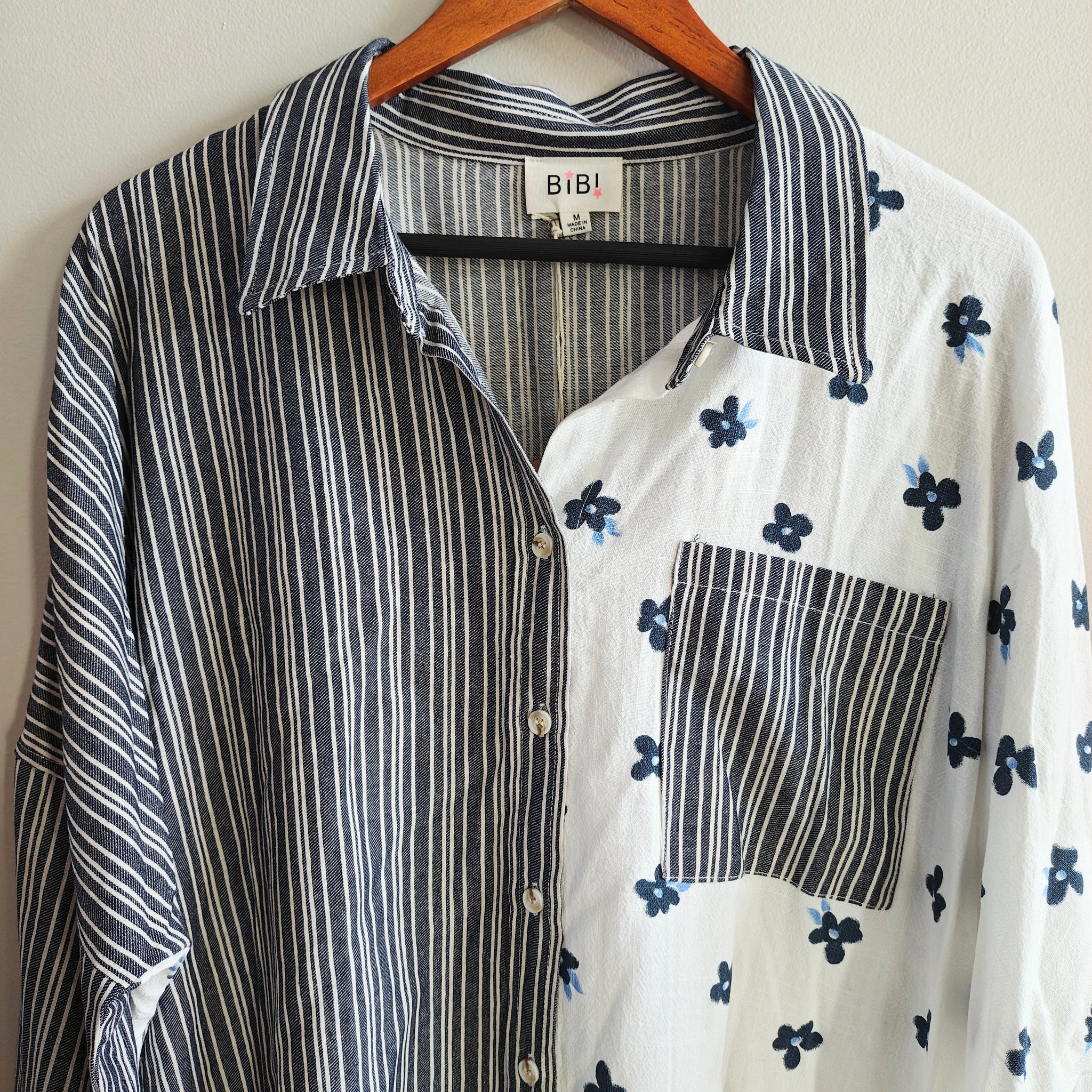 BiBi brand oversized mixed-print button-down shirt. The shirt features a patchwork design combining navy and white vertical stripes on the left side with a white fabric scattered with small navy floral motifs on the right side.