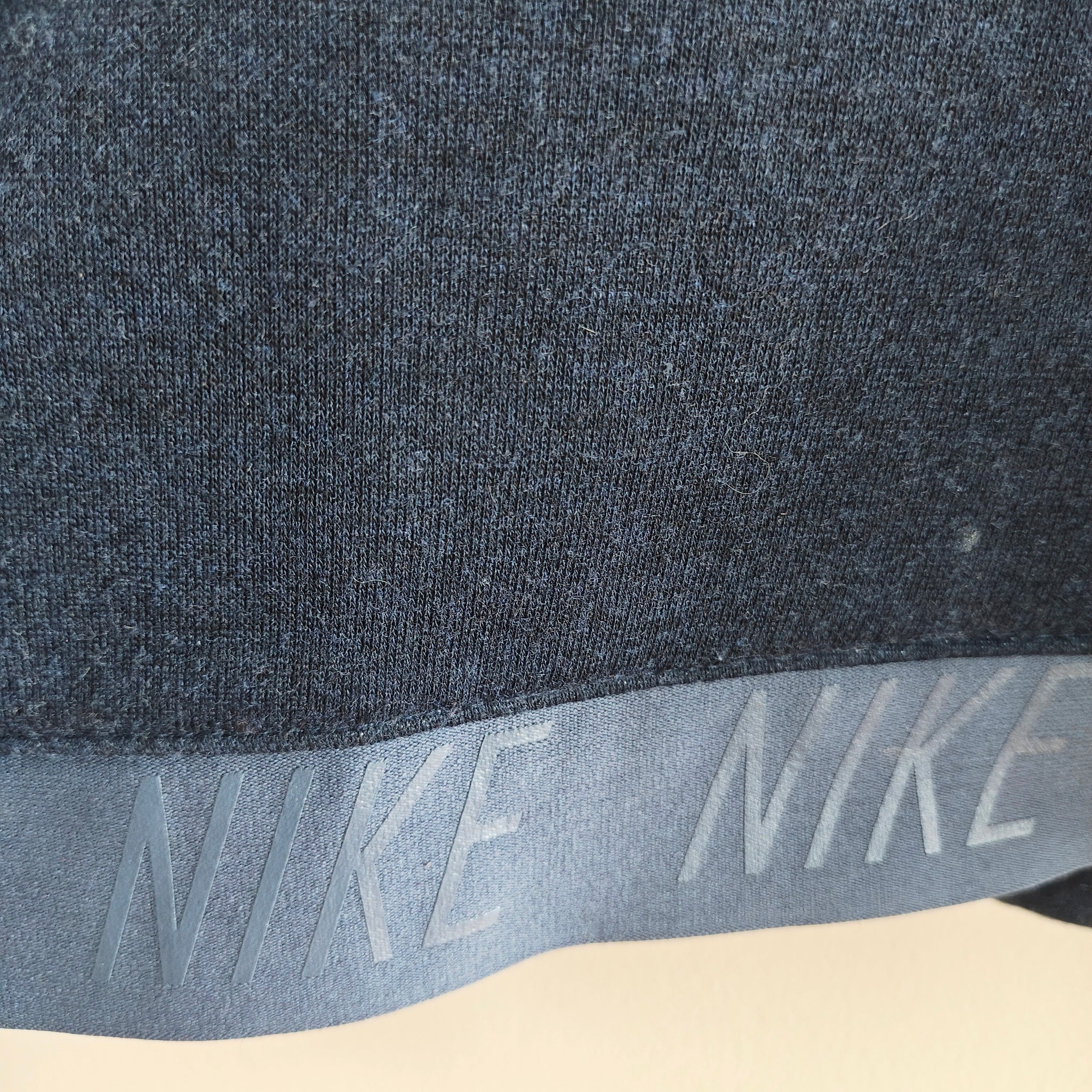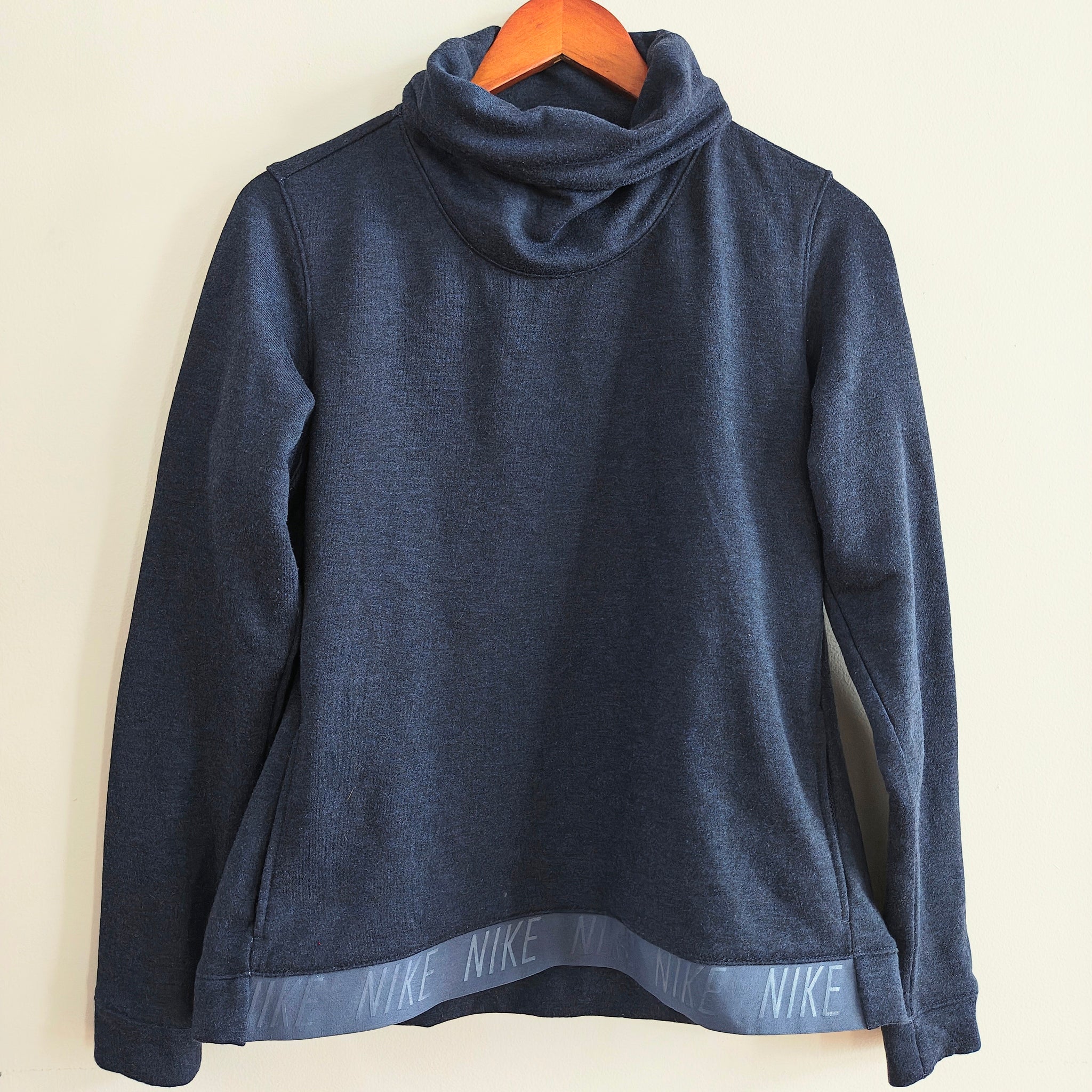 Design: A long-sleeve pullover with a high, slouchy cowl neck and front pockets. It features a prominent band at the hem with repeating "NIKE" text.