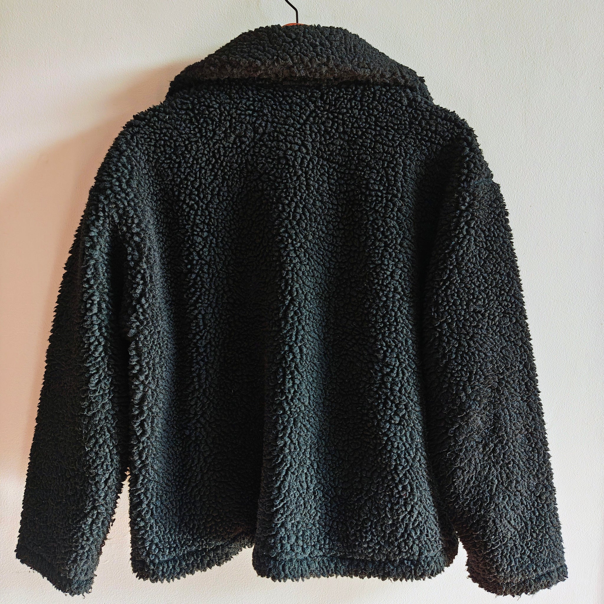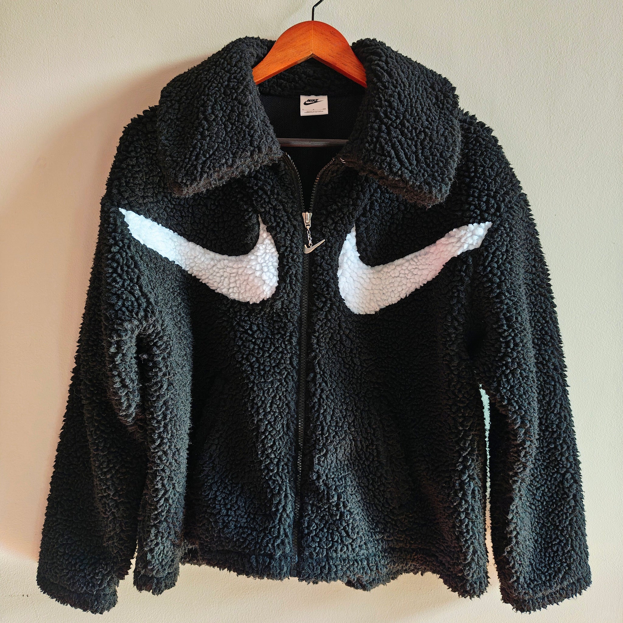 Nike Sportswear Swoosh Sherpa Jacket in a black and white colorway. It is a high-pile fleece jacket known for its soft, cozy feel and oversized design.