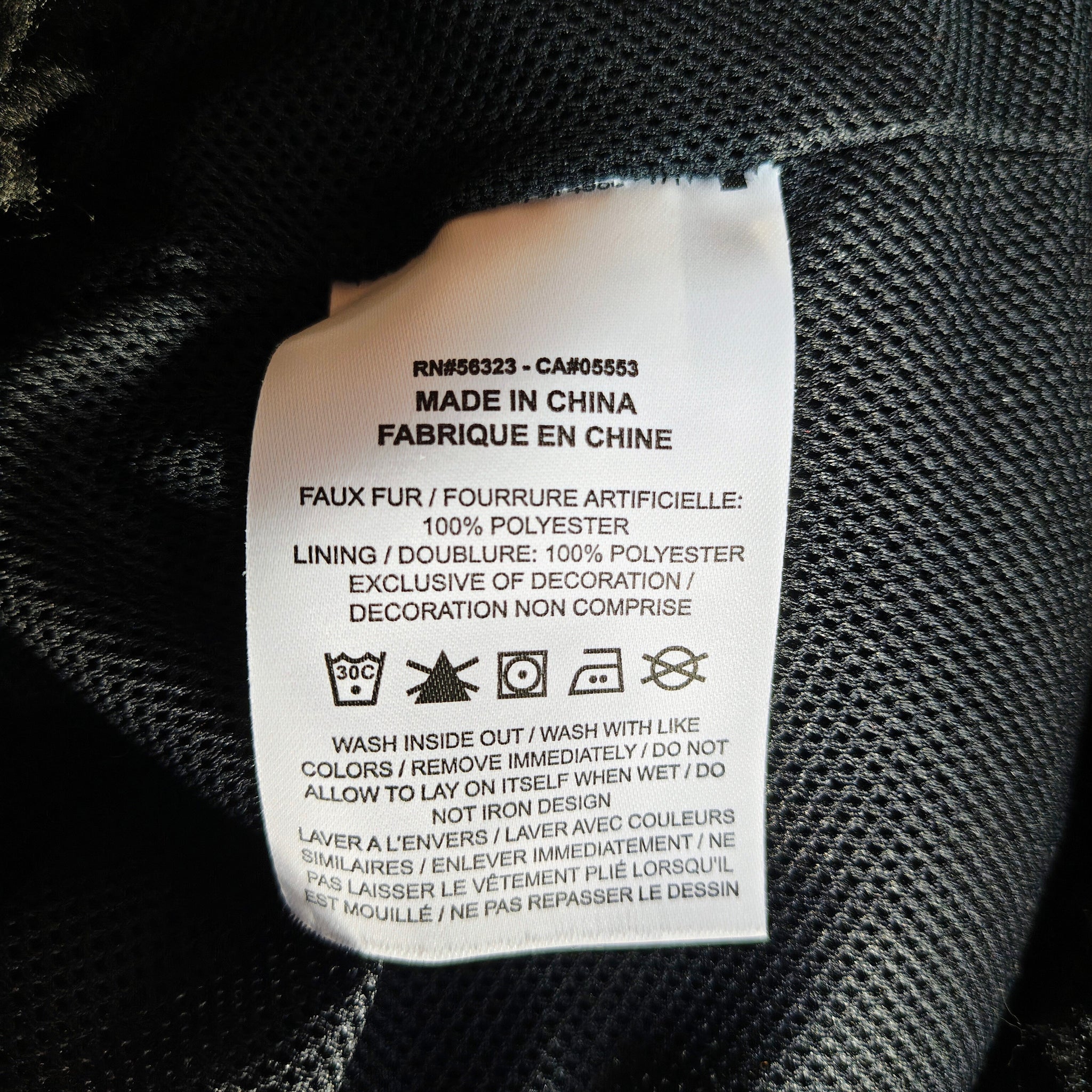 Material: 100% polyester faux fur exterior with a mesh lining