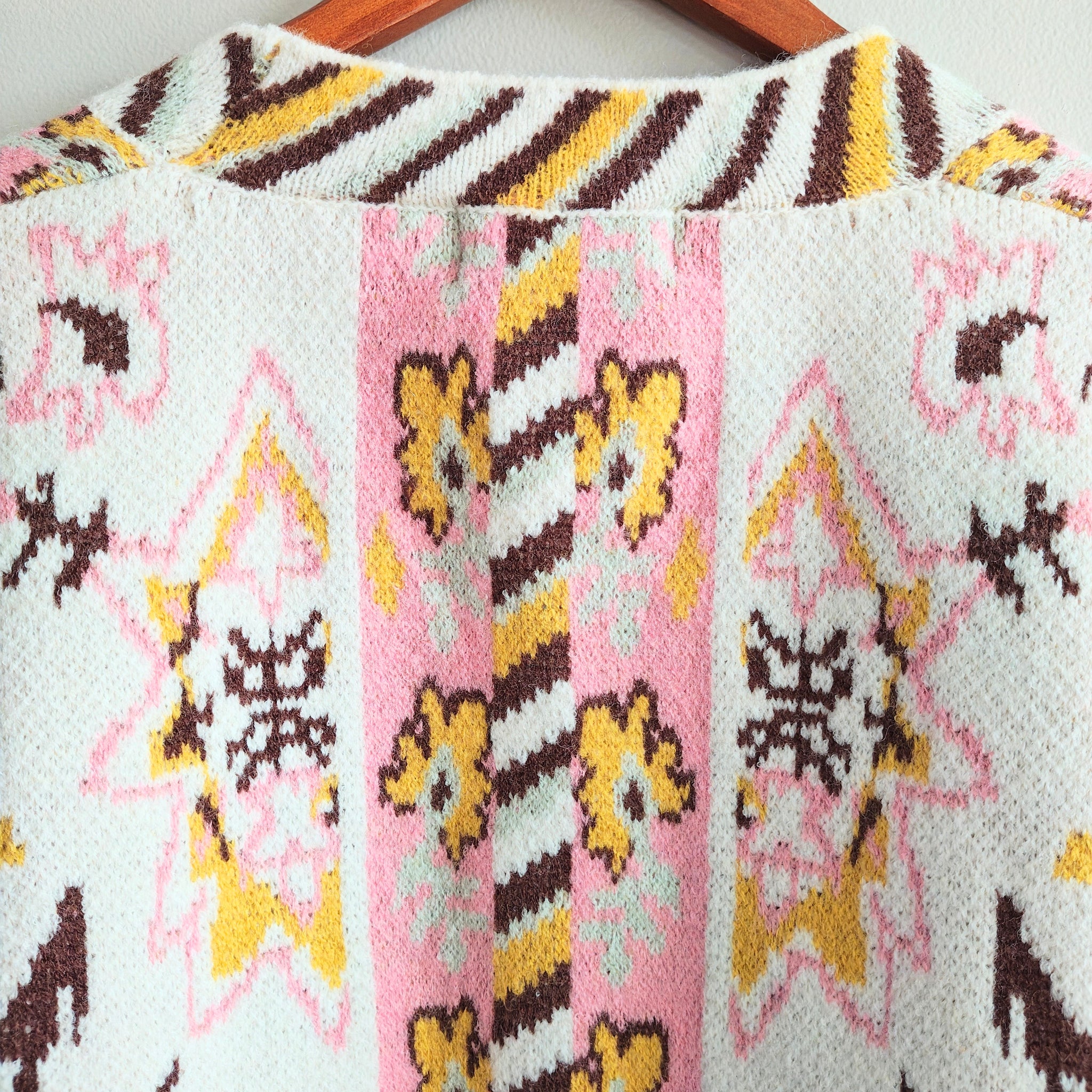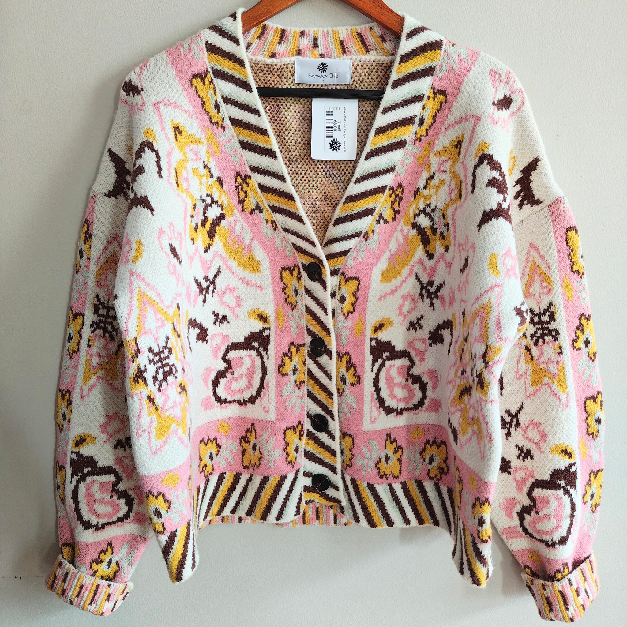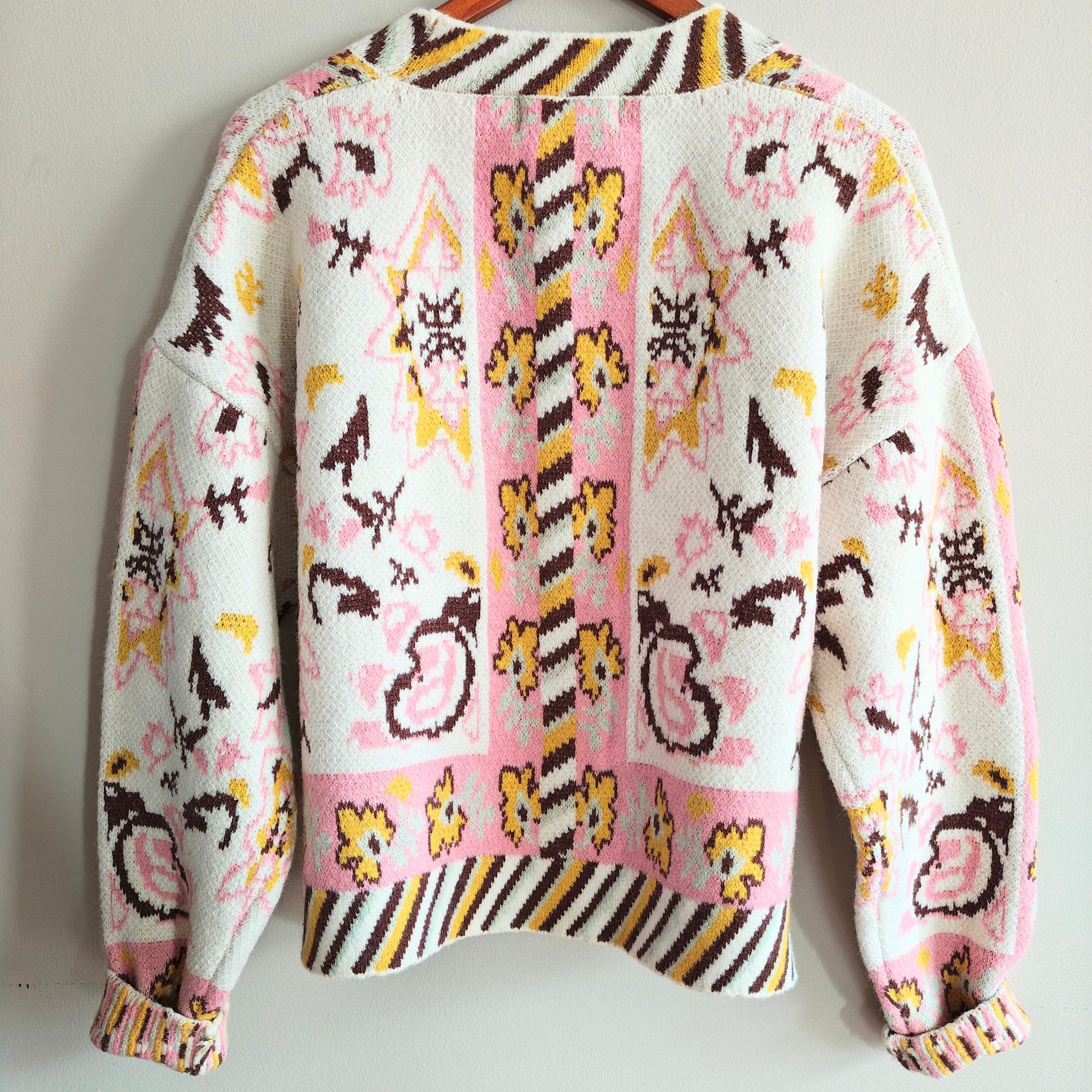 Description: This V-neck sweater features a button-down placket, drop-shoulder long sleeves, and a semi-cropped boxy fit. It has a paisley and floral border knit design with a contrast striped neckline, cuffs, and hem.