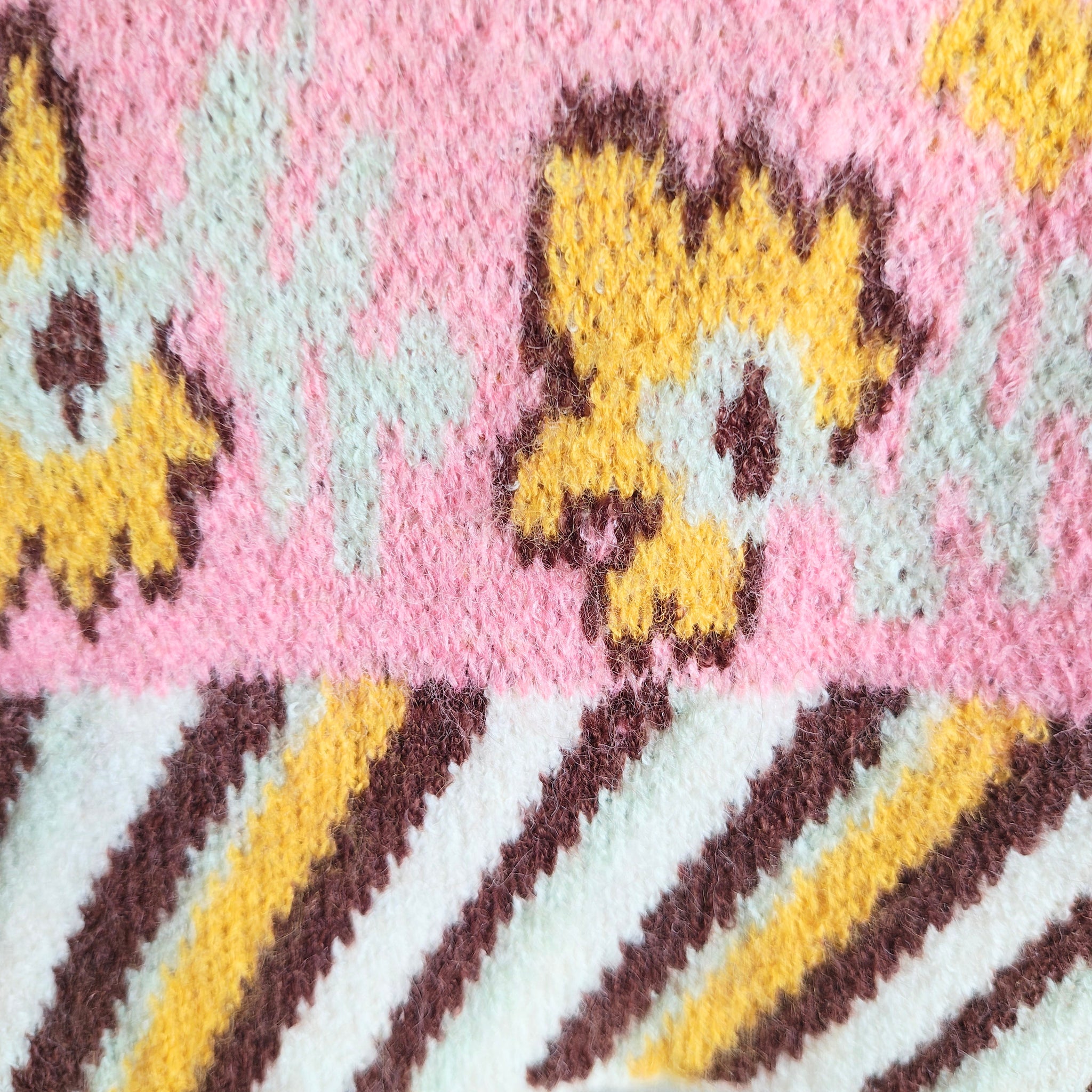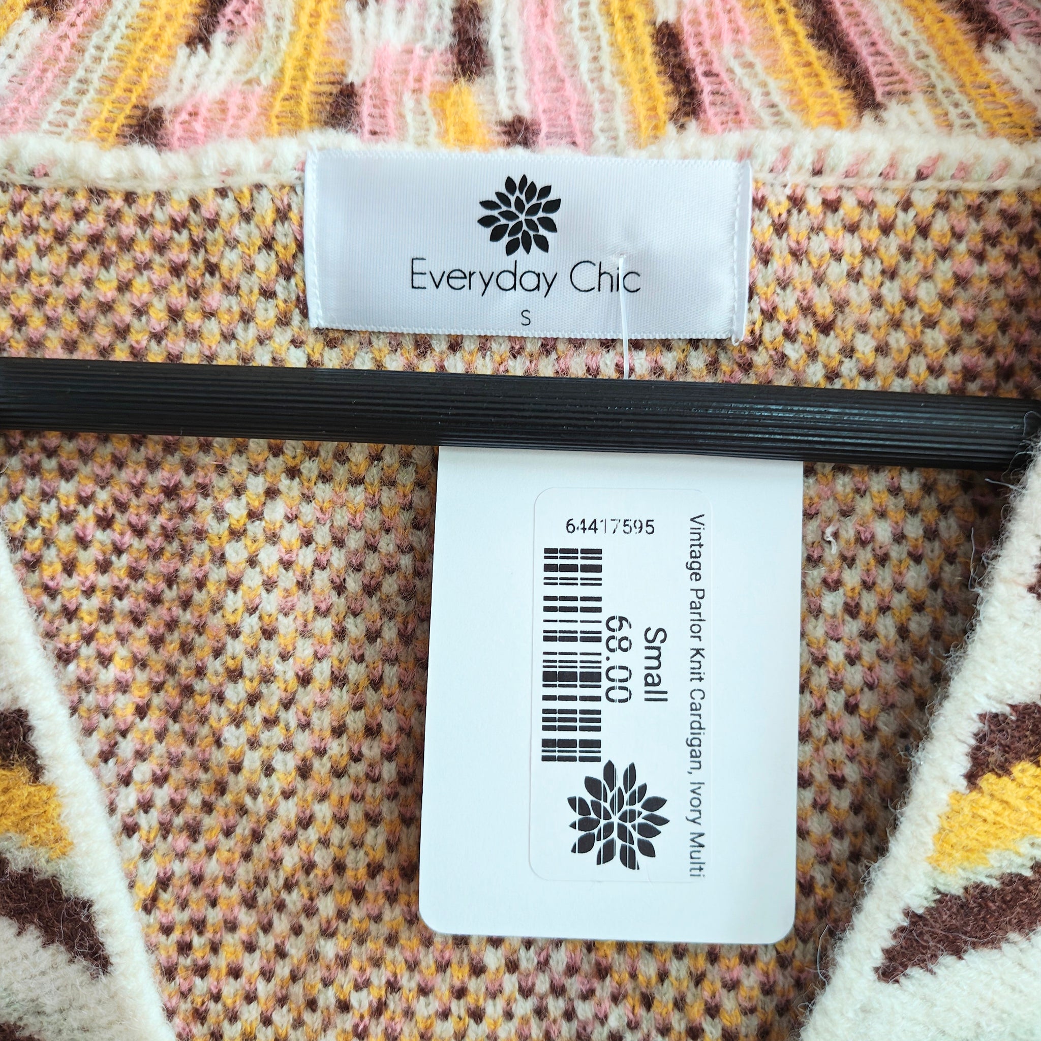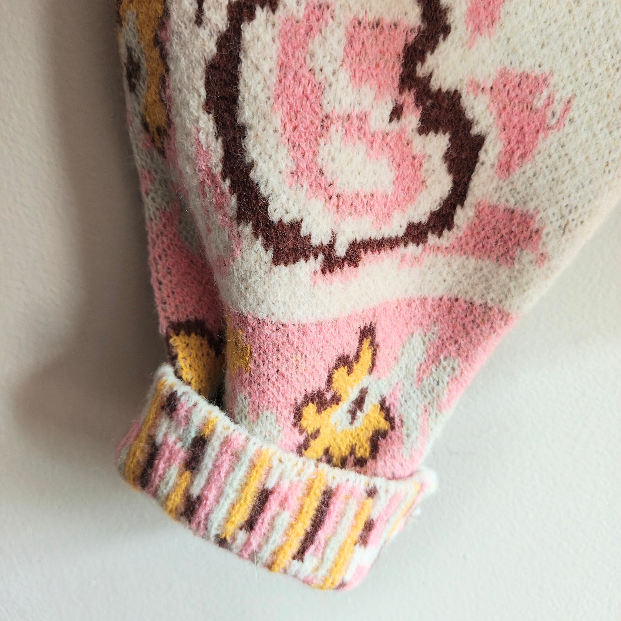 Description: This V-neck sweater features a button-down placket, drop-shoulder long sleeves, and a semi-cropped boxy fit. It has a paisley and floral border knit design with a contrast striped neckline, cuffs, and hem.