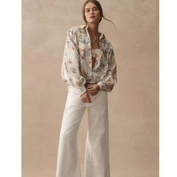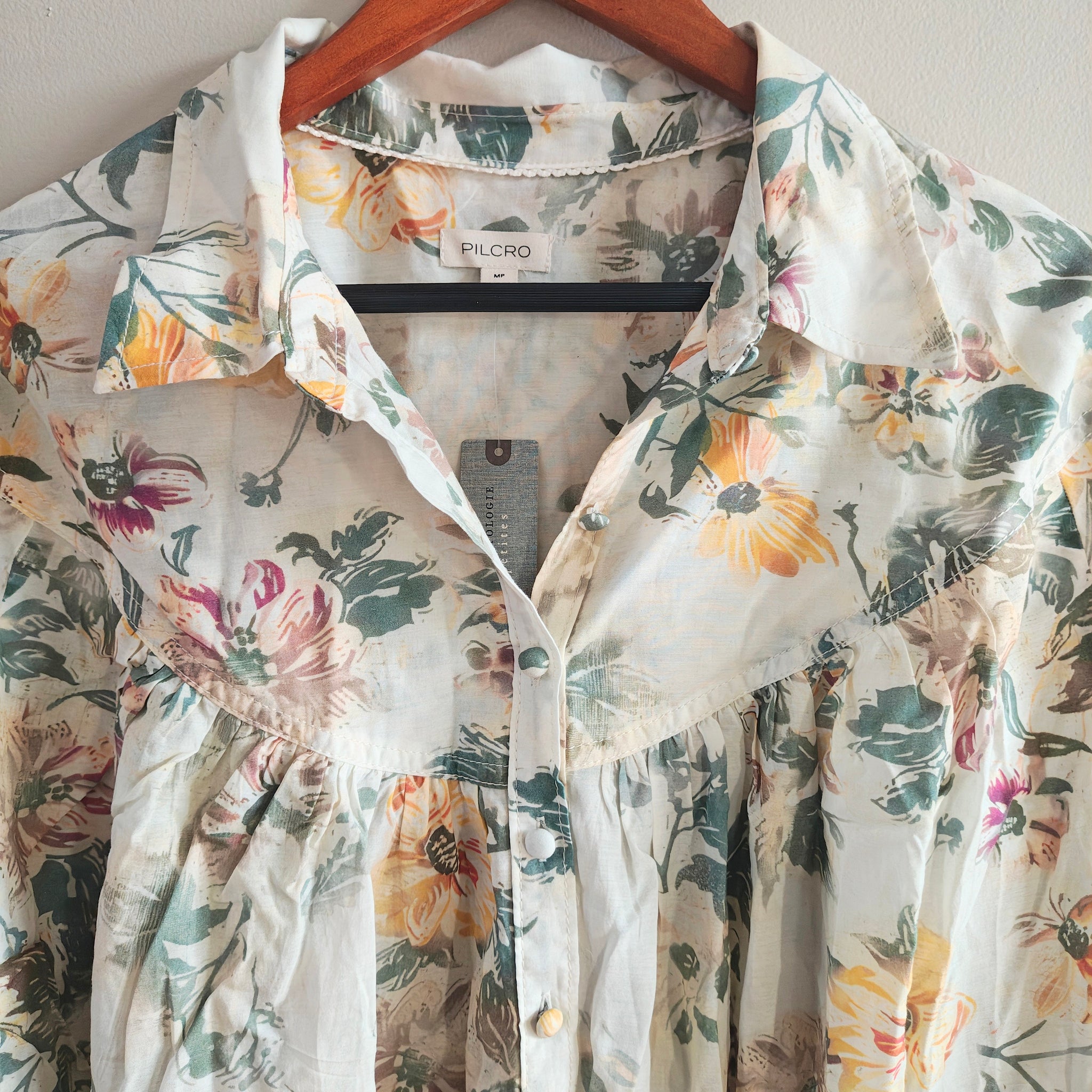 Pilcro Batwing Yoke Blouse by Anthropologie. It features a button-front design, a floral pattern, and batwing sleeves with buttoned cuffs.