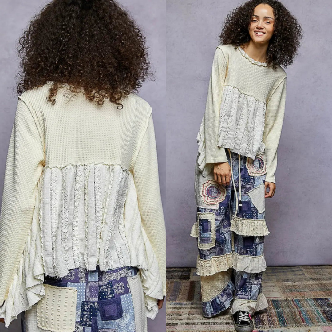 POL brand waffle-knit top with lace and patchwork accents. It features a round neckline with ruffled trim, long flare sleeves, and has a bohemian-inspired, relaxed, and oversized fit. The top is constructed from mixed materials, including polyester and cotton, which contributes to its unique texture and style.