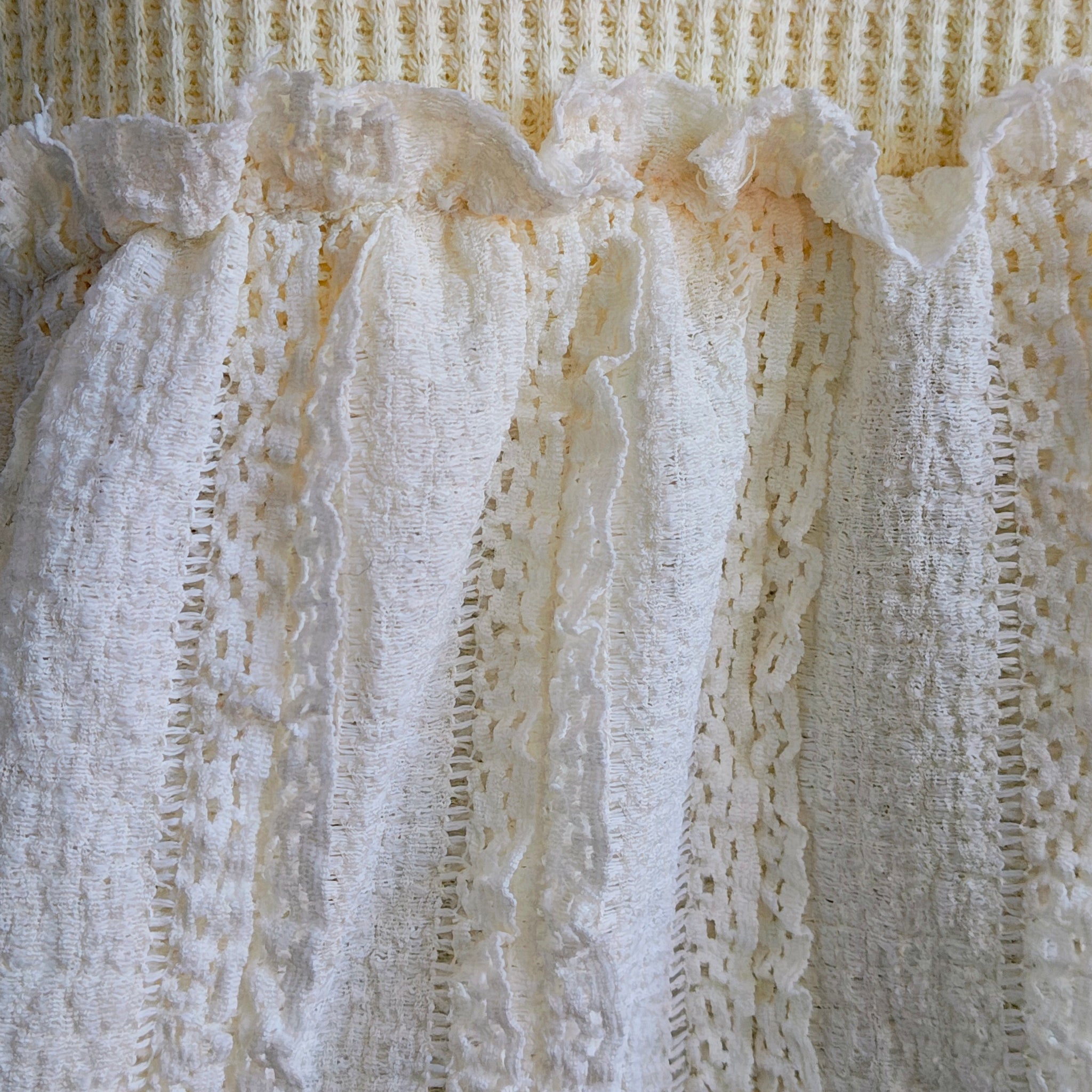 Key Details: Waffle-knit texture, lace inserts and trim, patchwork panels, exposed seams, and a high-low hem.